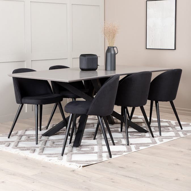 Spisegruppe Piata fra Venture Home. Med et spisebord i grå MDF med finer med svarte bordben i jern. Matchet med 6 stk Valentina spisestoler med svarte stolben i metall og svarte seter i polyester.
