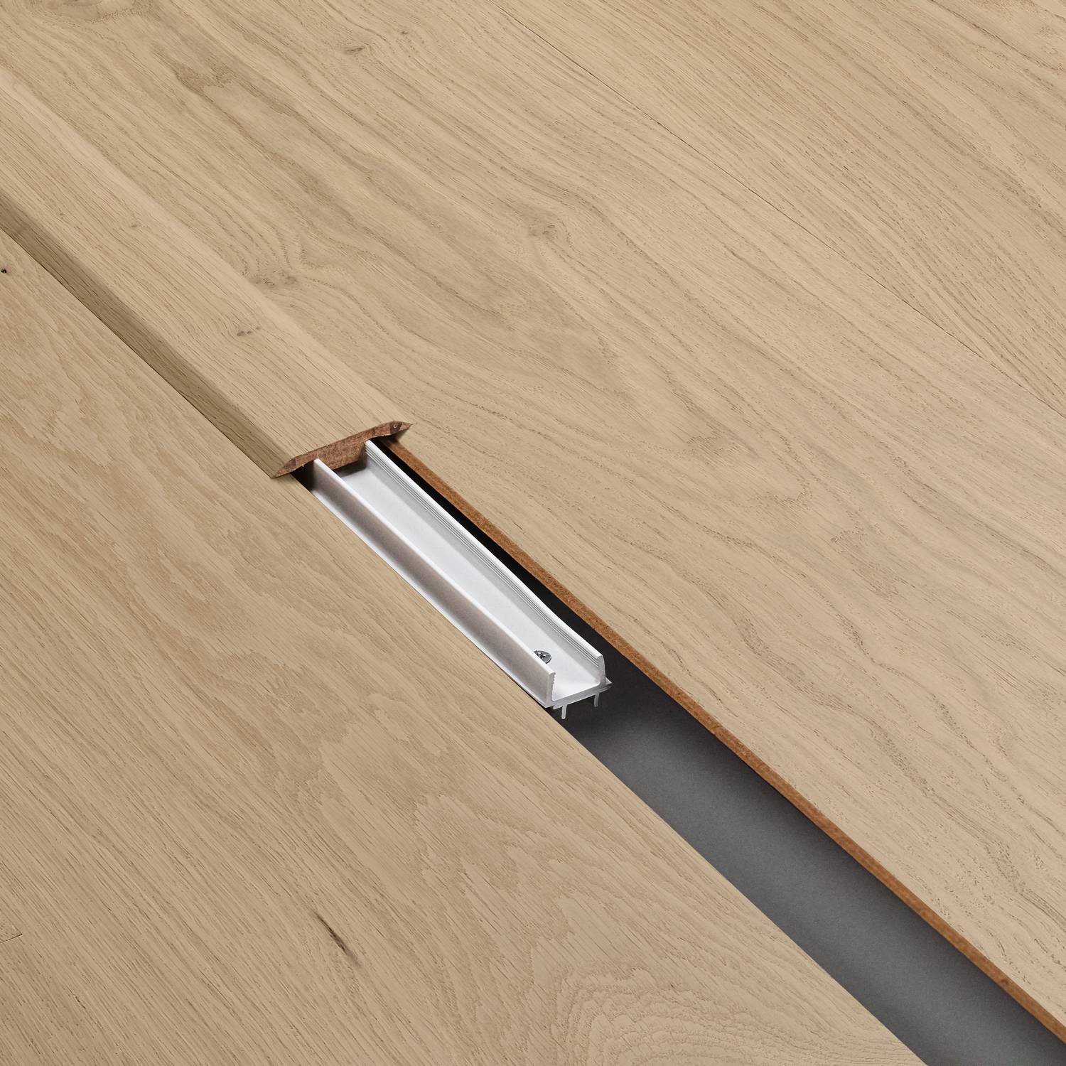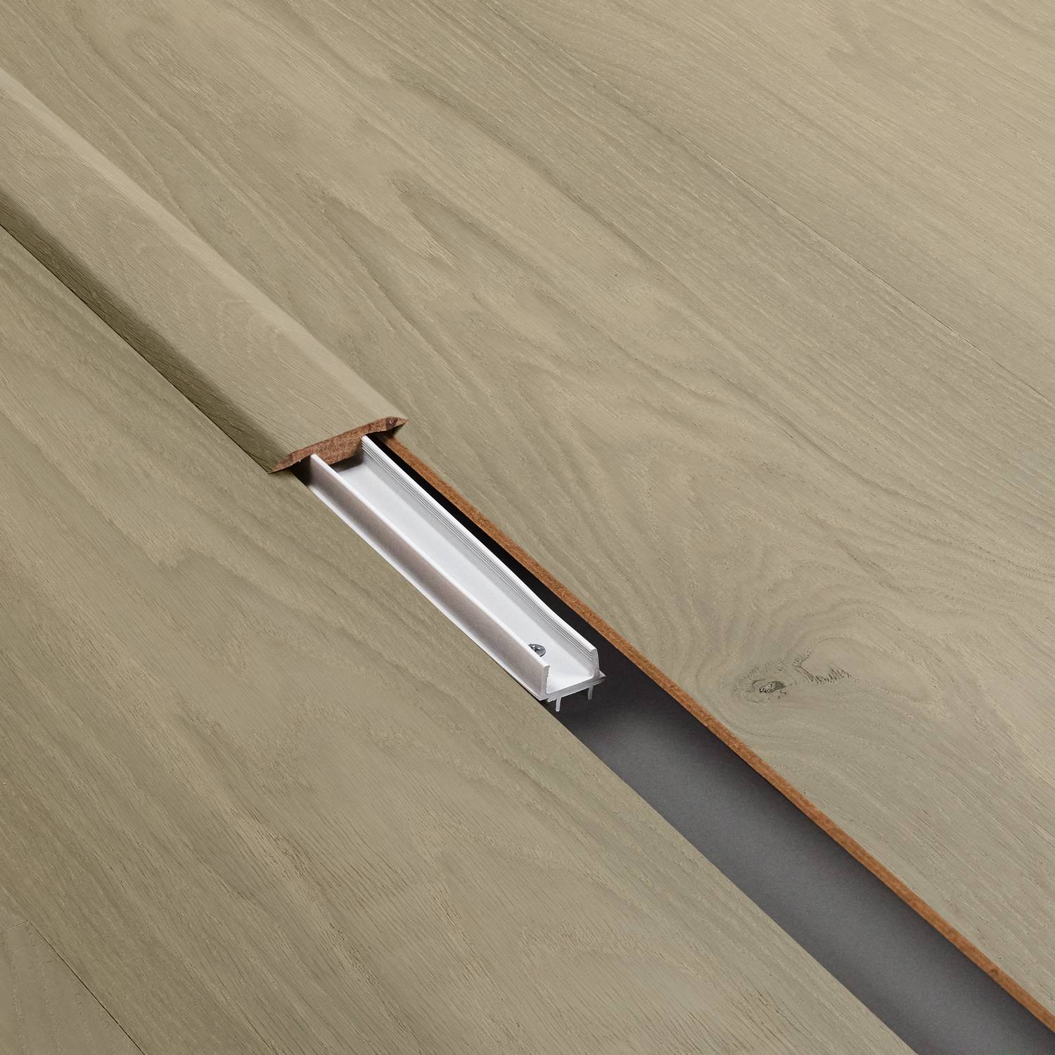 T-list i MDF som skjuler ekpansjonsgap og gir en sømløs overgang mellom to laminatgulv. BerryAlloc har fargetilpassede gulvlister og T lister til nesten alle dekorer. Avslutning og nivålister finnes i aluminiums farge.