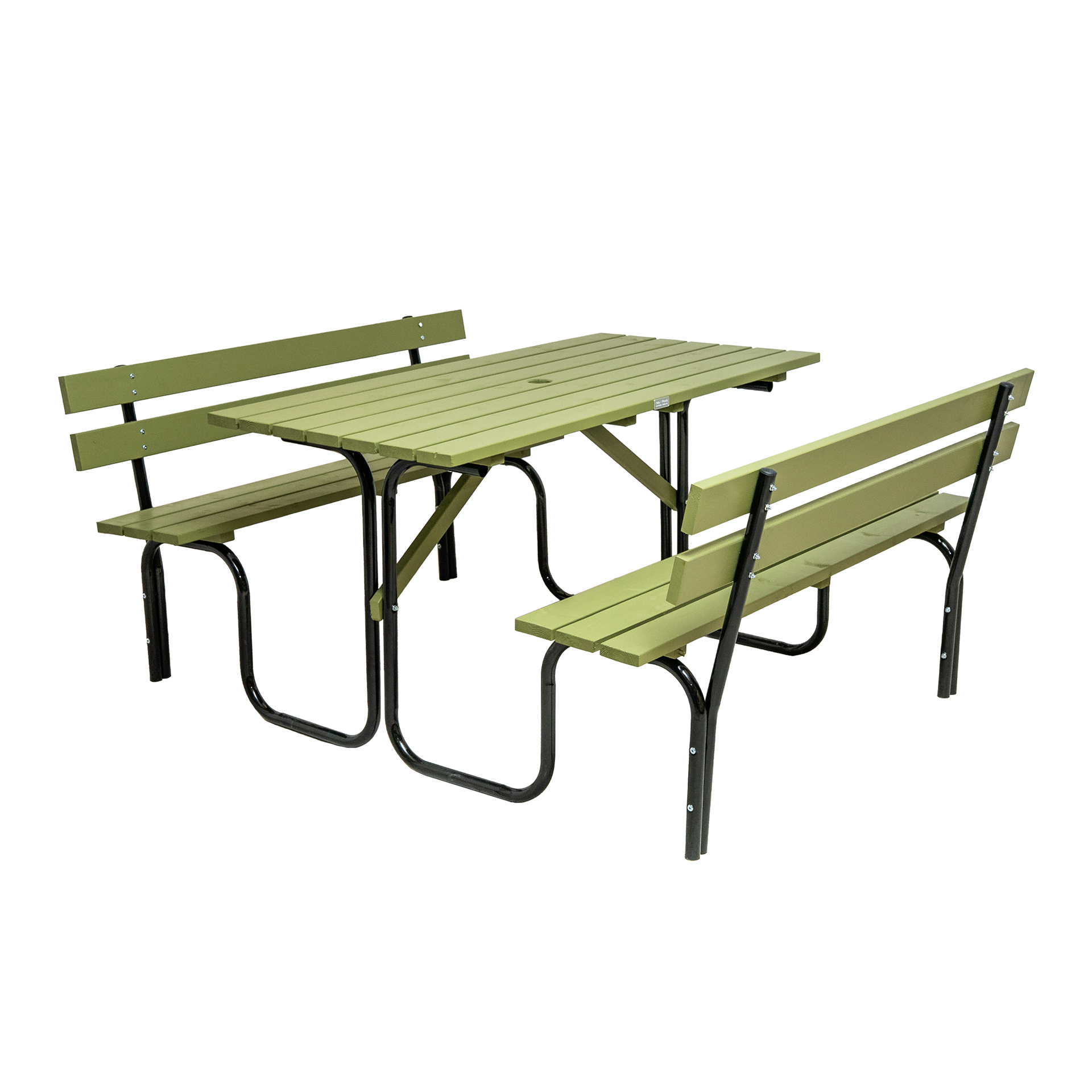 Benkebord fra Eden Wood med plass til 6 personer. Parasollhull 50 mm. Benkebordet er laget av FSC-furu med svart stålstativ (Ø 32 mm). En populær og lett å plassere utemøbel for rasteplasser, parker eller på arbeidsplassen. Leveres umontert.