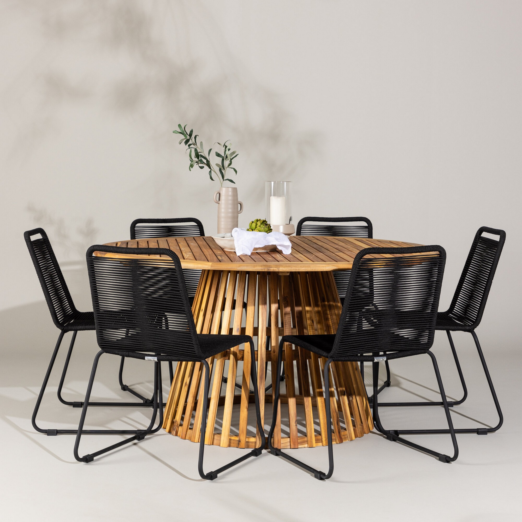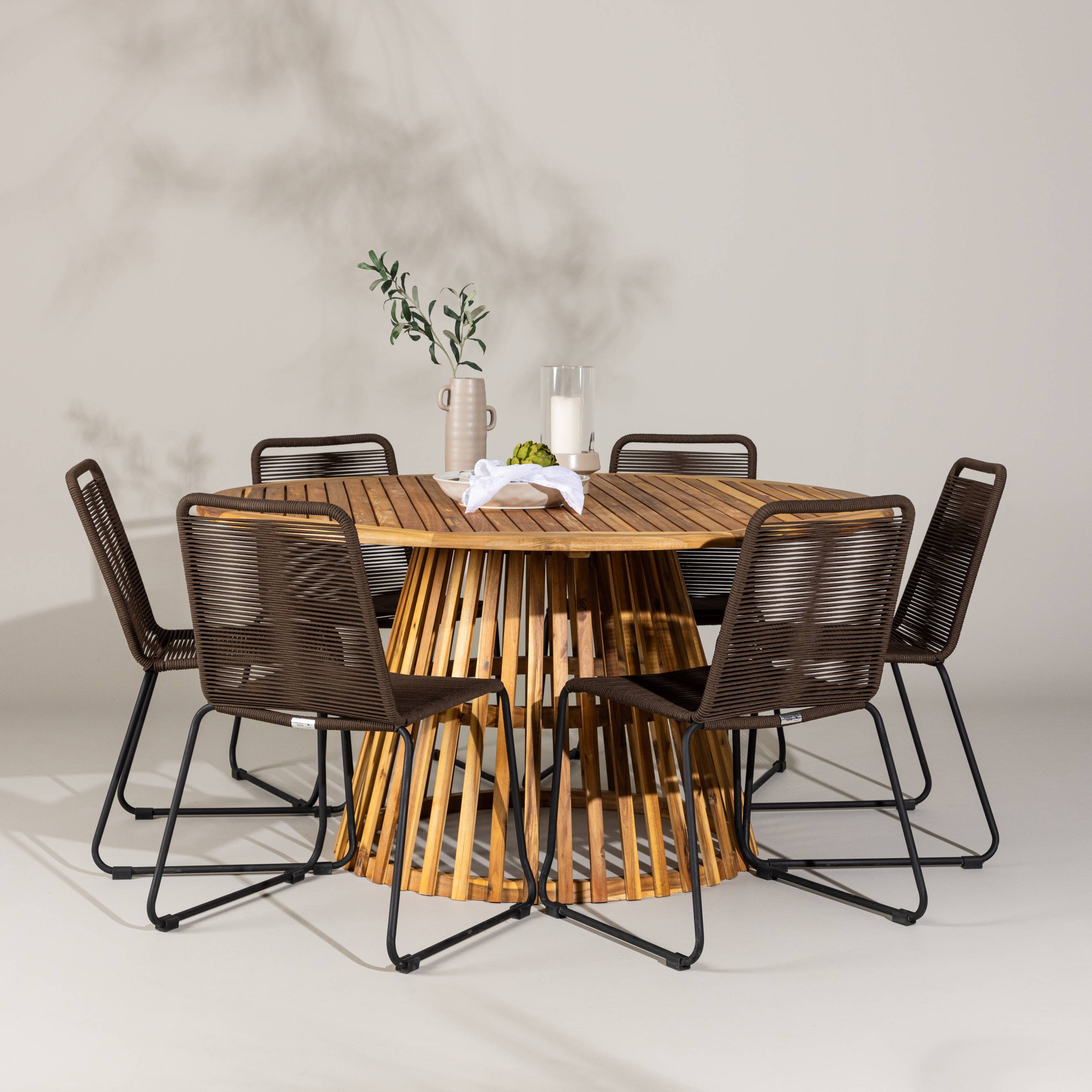 Oppdag det perfekte spisegruppen for ditt utendørs miljø med Venture Homes elegante Tucumán-bord og de stilfulle Lindos-stolene. Med en imponerende diameter på 120 cm, gir Tucumán-bordet god plass for familiemiddager og hyggelige sammenkomster under åpen himmel.
