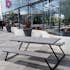 Et moderne parksett, med benk og bord i ett, fra Eden Wood med plass til 6 personer. Det er laget av svensk FSC-furu og 45 mm varmgalvanisert, svart rørstativ.