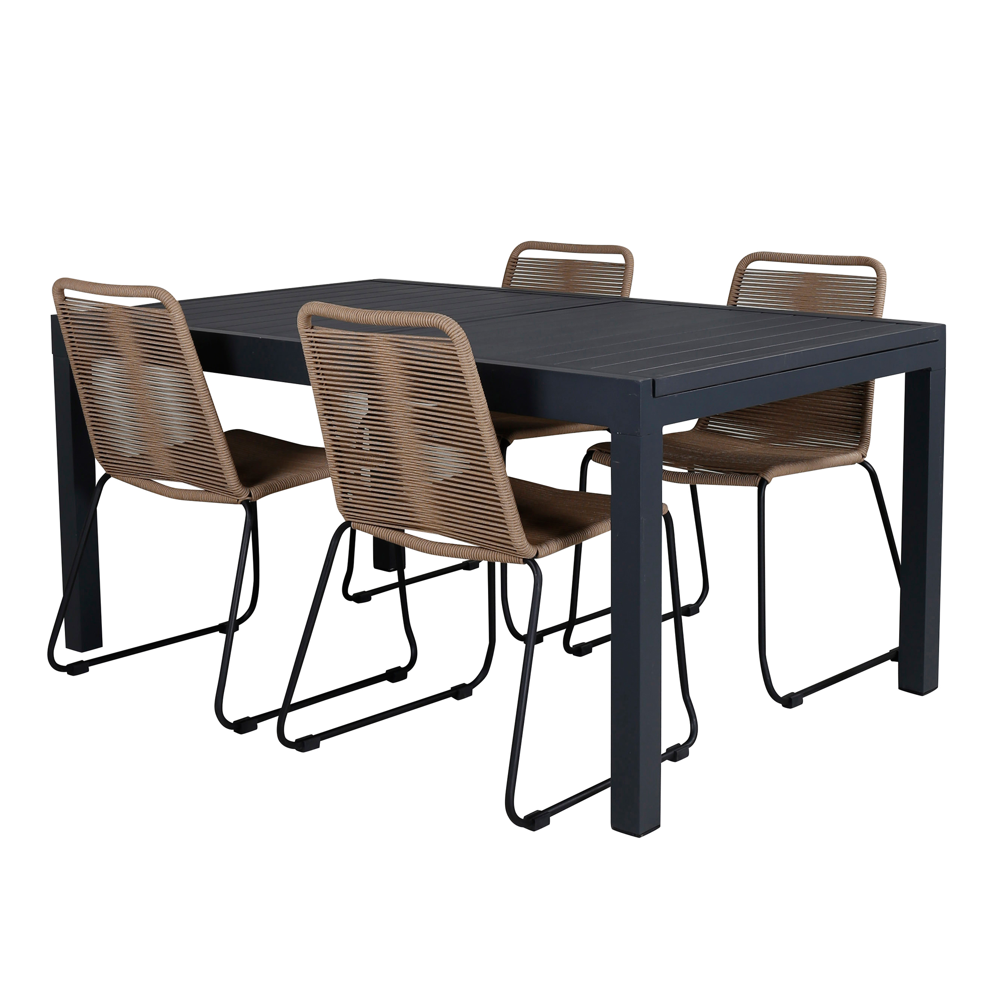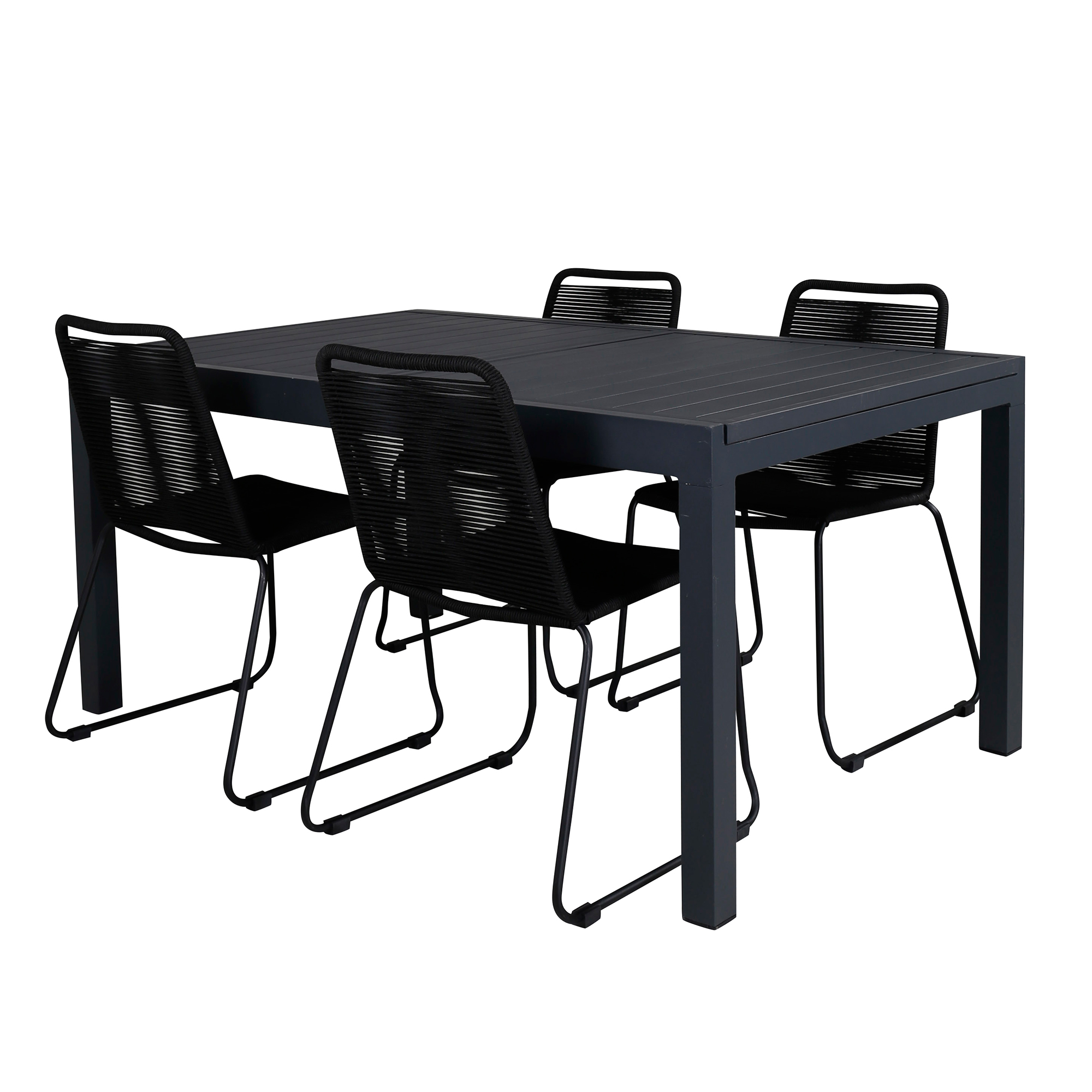 Skap en herlig og innbydende følelse i hagen din med dette stilsikre spisegruppen. Spisegruppen Marbella med bordplate i aluminium. Spisegruppen kommer sammen med 4 Lindos spisestoler med en ramme i svart stål og et sete i tau.
