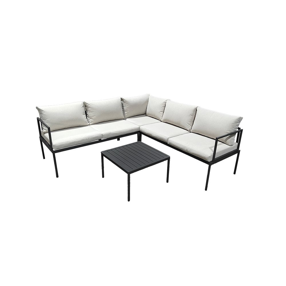 Funksjonell og rimelig hjørnesofa med et rent og tidløst uttrykk. Den enkle designen gjør sofaen lett å plassere i forskjellige miljøer, uavhengig av om området er romslig eller begrenset. Settet består av to to-seters moduler, en hjørnedel og et matchende bord. Laget av stål med puter i beige polyester.