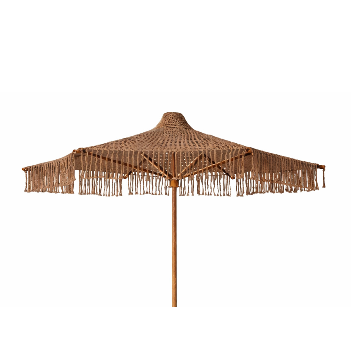 Den heklede designen gir en luftig og koselig følelse, samtidig som parasollen blir et karakterfullt møbel i seg selv. Plasser den på balkongen, på terrassen, eller ta den med til stranden, uansett hvor du setter den, skaper den en innbydende atmosfære. Stangen måler Ø32 mm. Parasollen har en smart tiltfunksjon og kan felles i flere forskjellige posisjoner. Bunnen av stangen kan enkelt skrus ned i sanden.