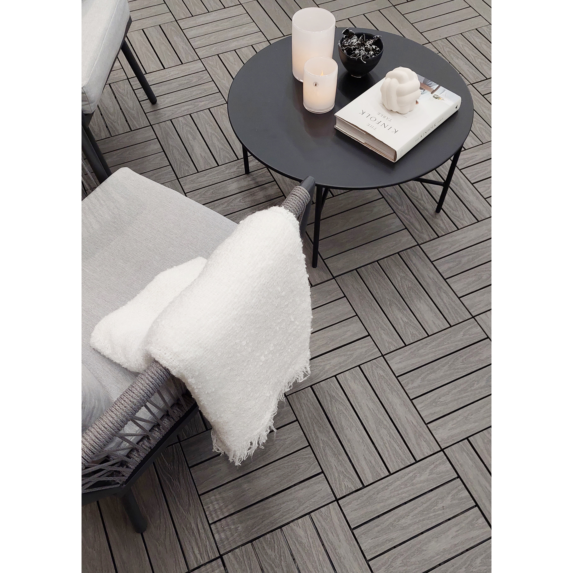 Gulvet er veldig lett å legge da platene klikkes sammen og ingen verktøy er nødvendig. Klikkskinnen demonteres bort like enkelt ved vinterlagring eller flytting.Velg mellom fargene Light Grey og Brown for å skape din ideelle uteplass!