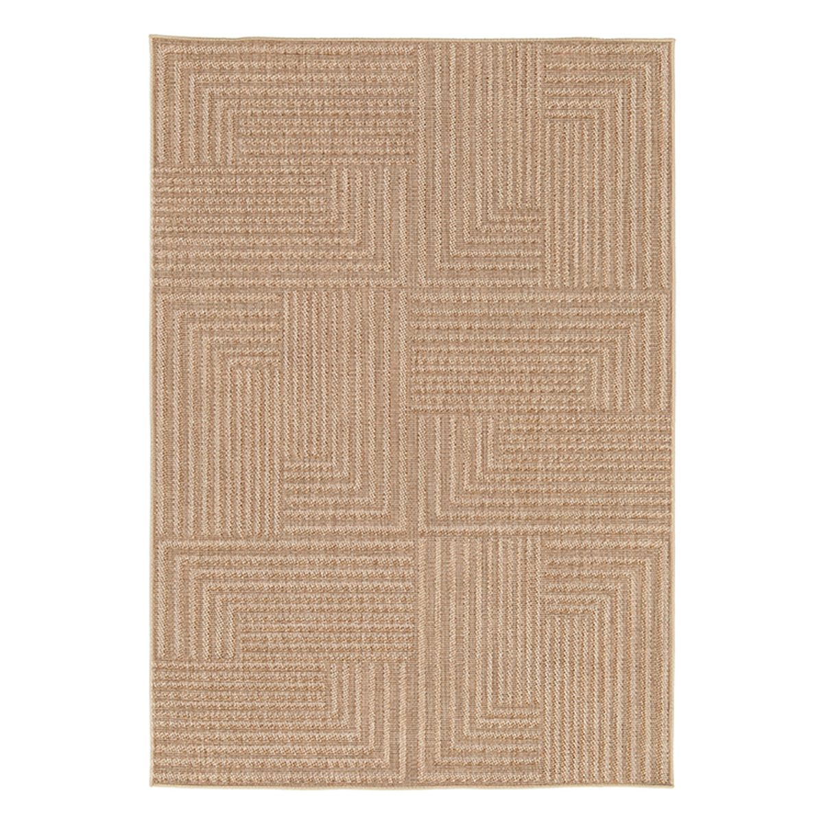 Teppet har tydelige strukturer og mønsteret er klassisk moderne i et nøkternt geometrisk design. Følelsen av struktur forsterkes ytterligere gjennom samspillet mellom garn i forskjellige nyanser tone-i-tone. Laget av 100% ekstra slitesterkt polypropylengarn. Garnet er UV-bestandig, tåler vann, røyter ikke, og er flekkavvisende. Teppet kan derfor uten problemer plasseres utendørs, i hagestue eller innendørs. Kantene er avsluttet med slitesterk langette i matchende farge. Teppet er lett å rengjøre - støvsug eller skyll av med lunkent vann og la det tørke. Flekker fjernes med en svamp, litt lunkent vann og oppvaskmiddel.