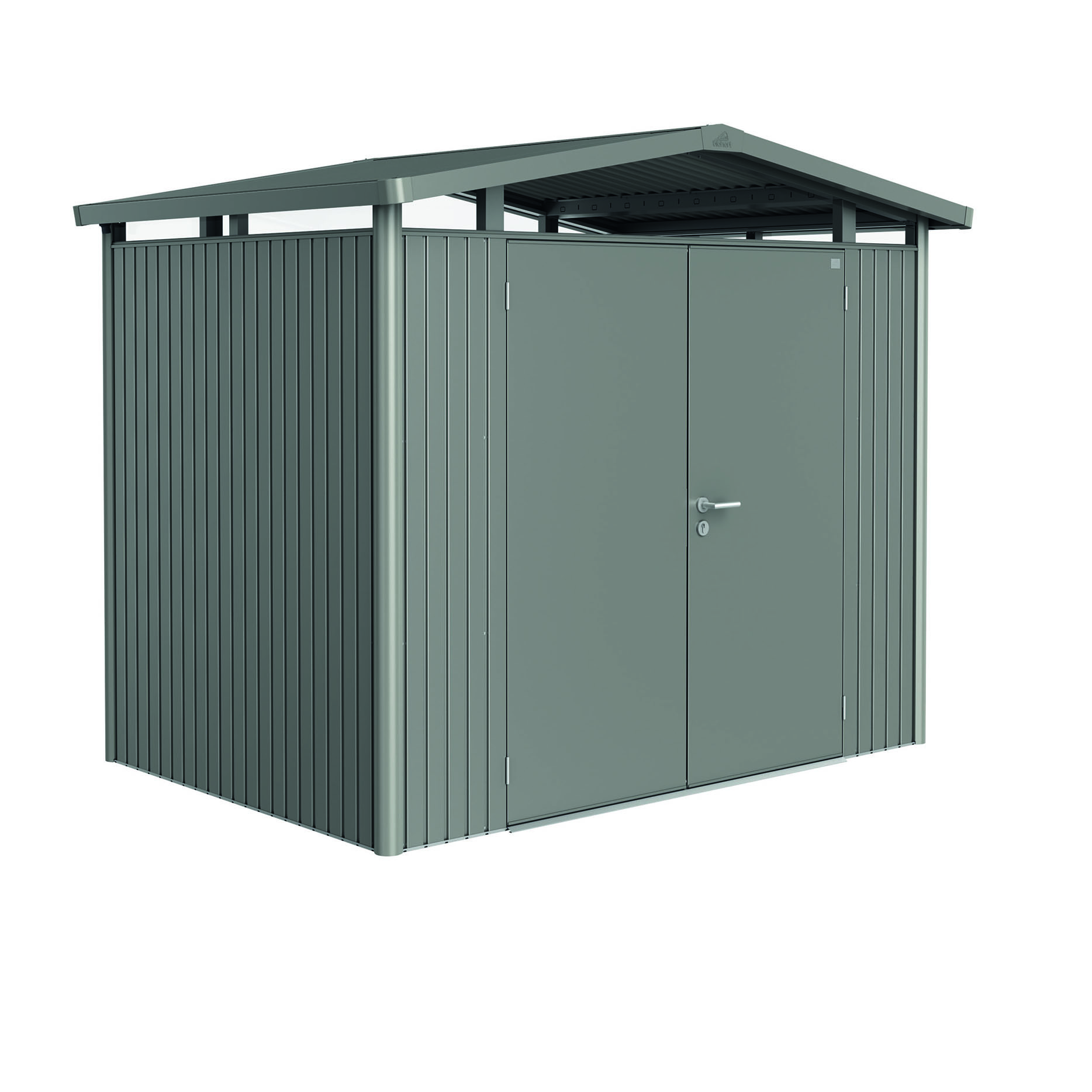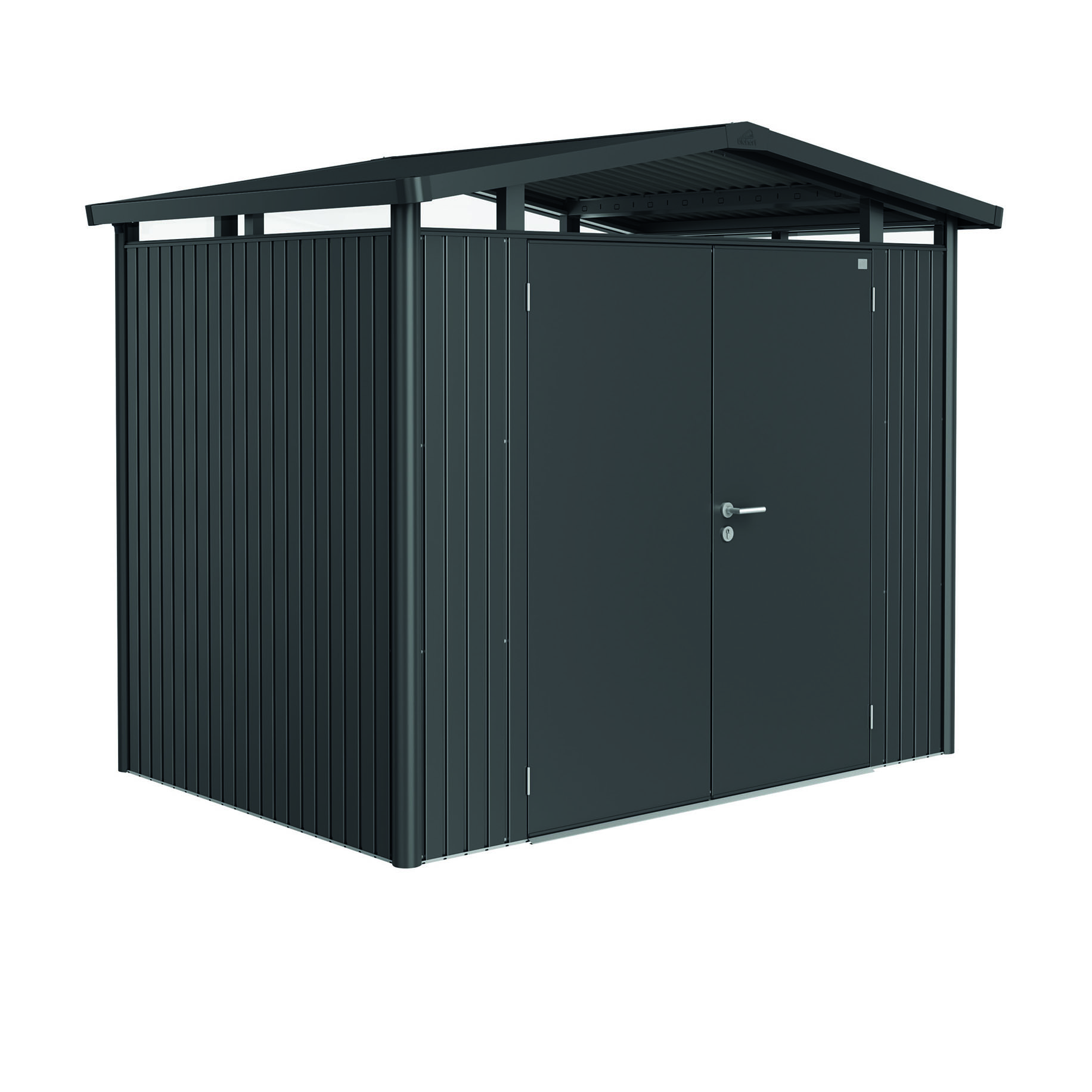 Redskapsbod Biohort Panorama P2 Dobbeldør har et akrylglass rundt i toppen som gir et unikt lysinnslipp og gjør at modellen med sitt moderne saltak passer godt inn i