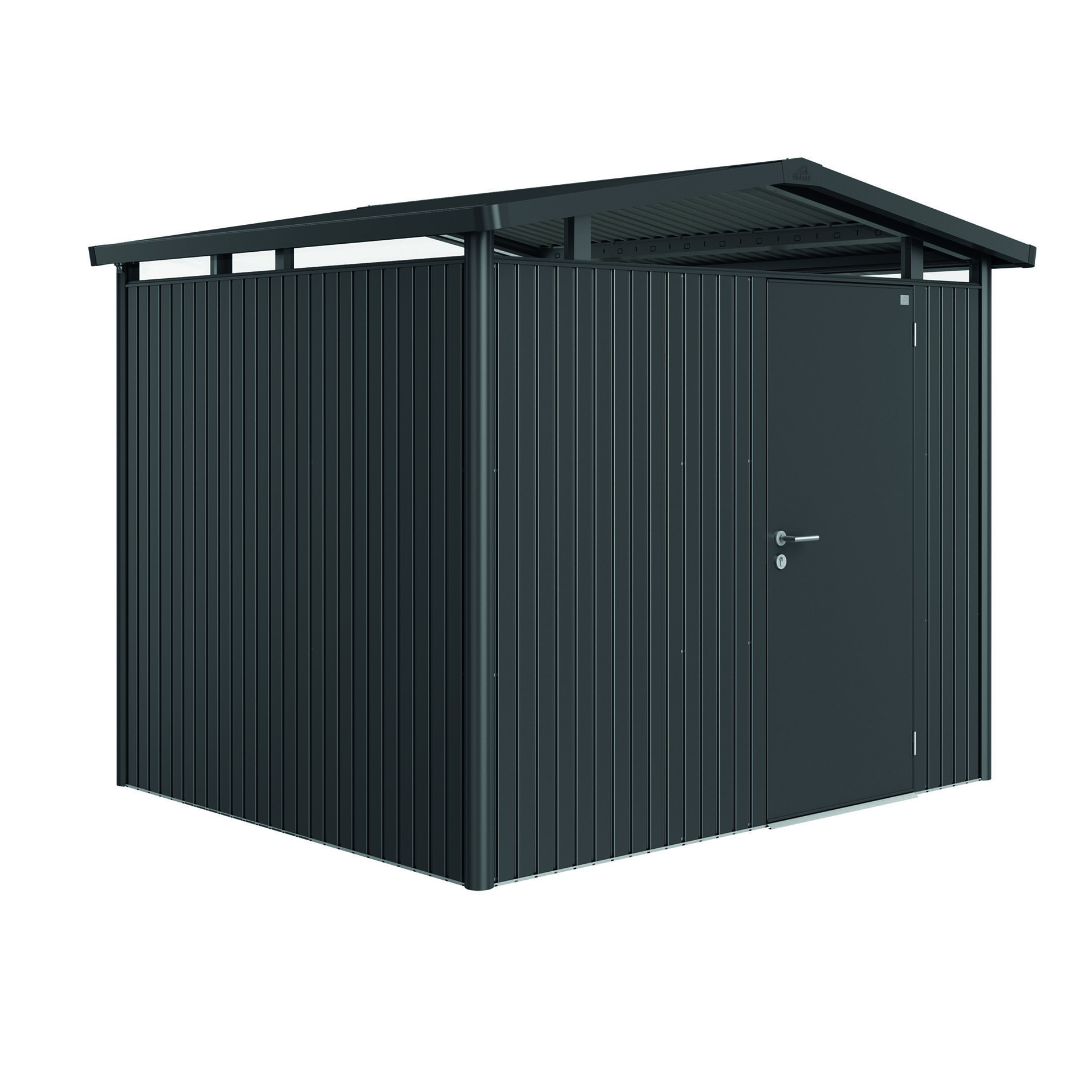 Redskapsbod Biohort Panorama P3 har et akrylglass rundt i toppen som gir et unikt lysinnslipp og gjør at modellen med sitt moderne saltak passer godt inn i