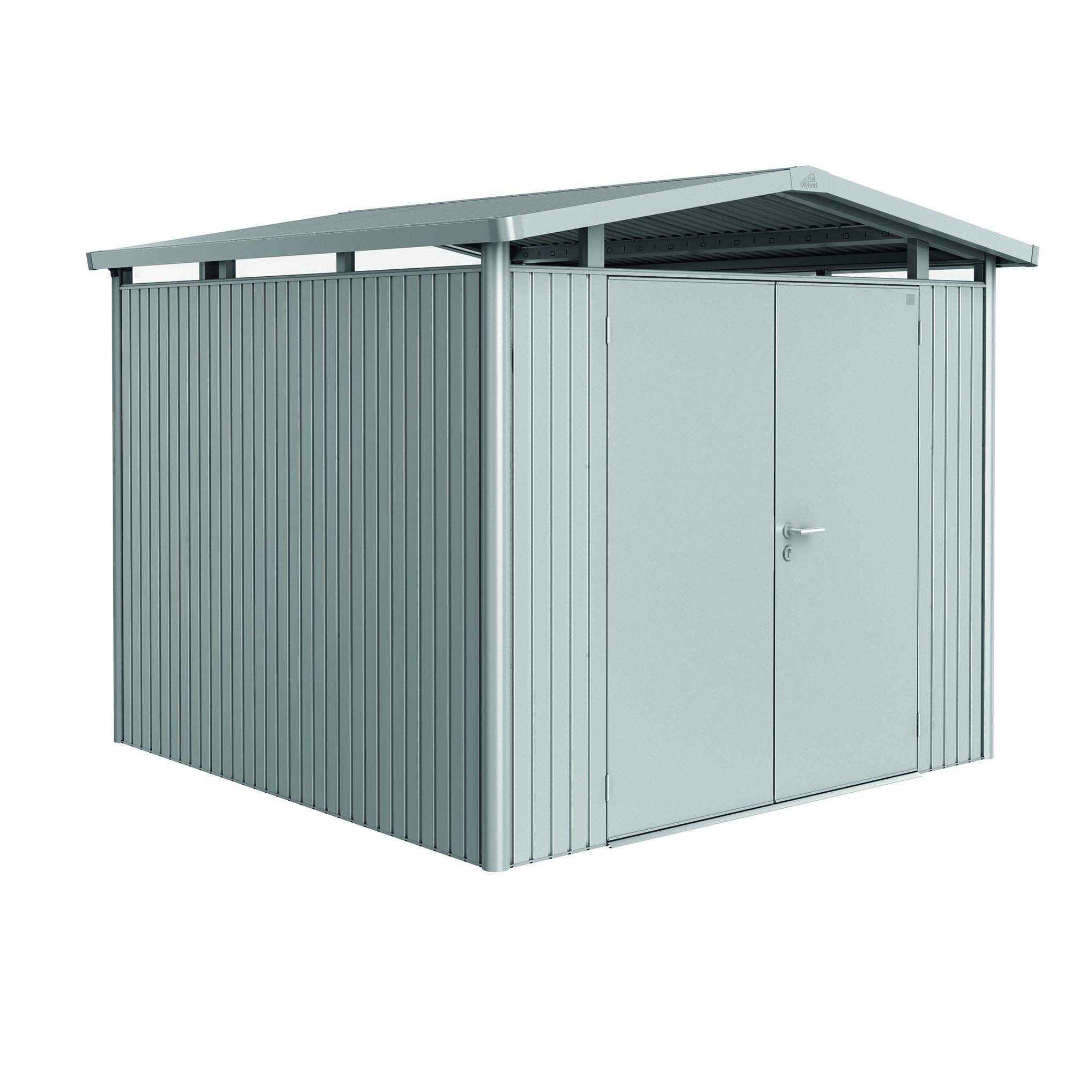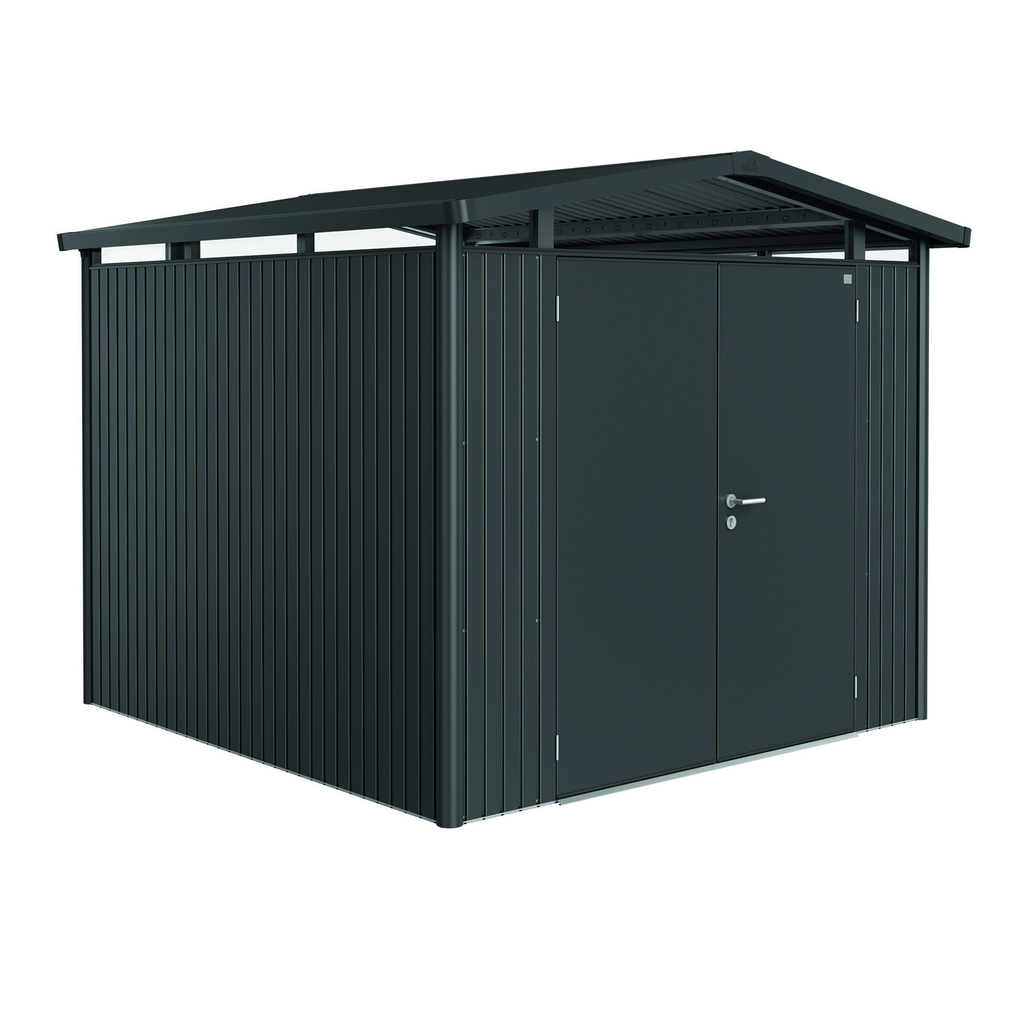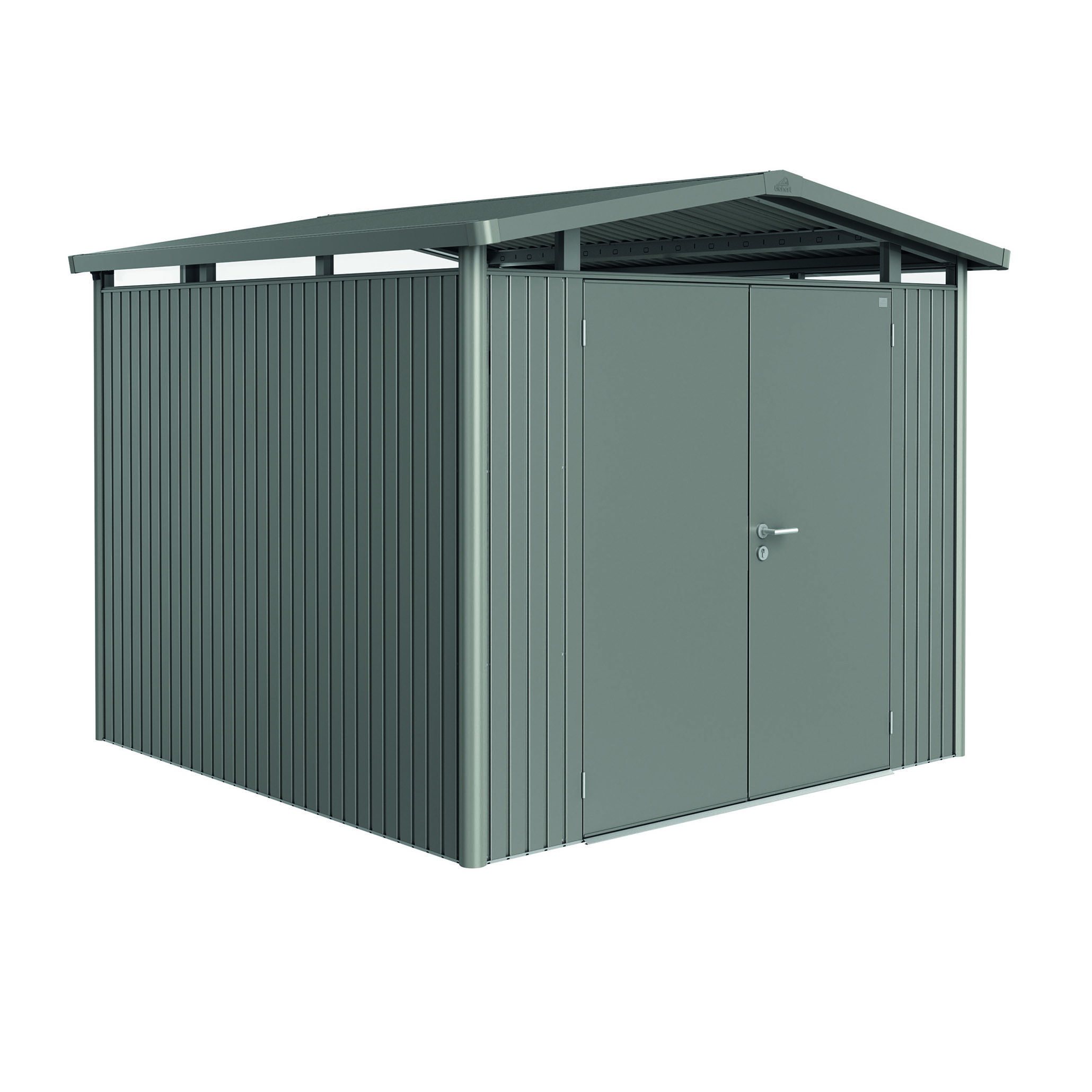 Redskapsbod Biohort Panorama P4 Dobbeldør har et akrylglass rundt i toppen som gir et unikt lysinnslipp og gjør at modellen med sitt moderne saltak passer godt inn i
