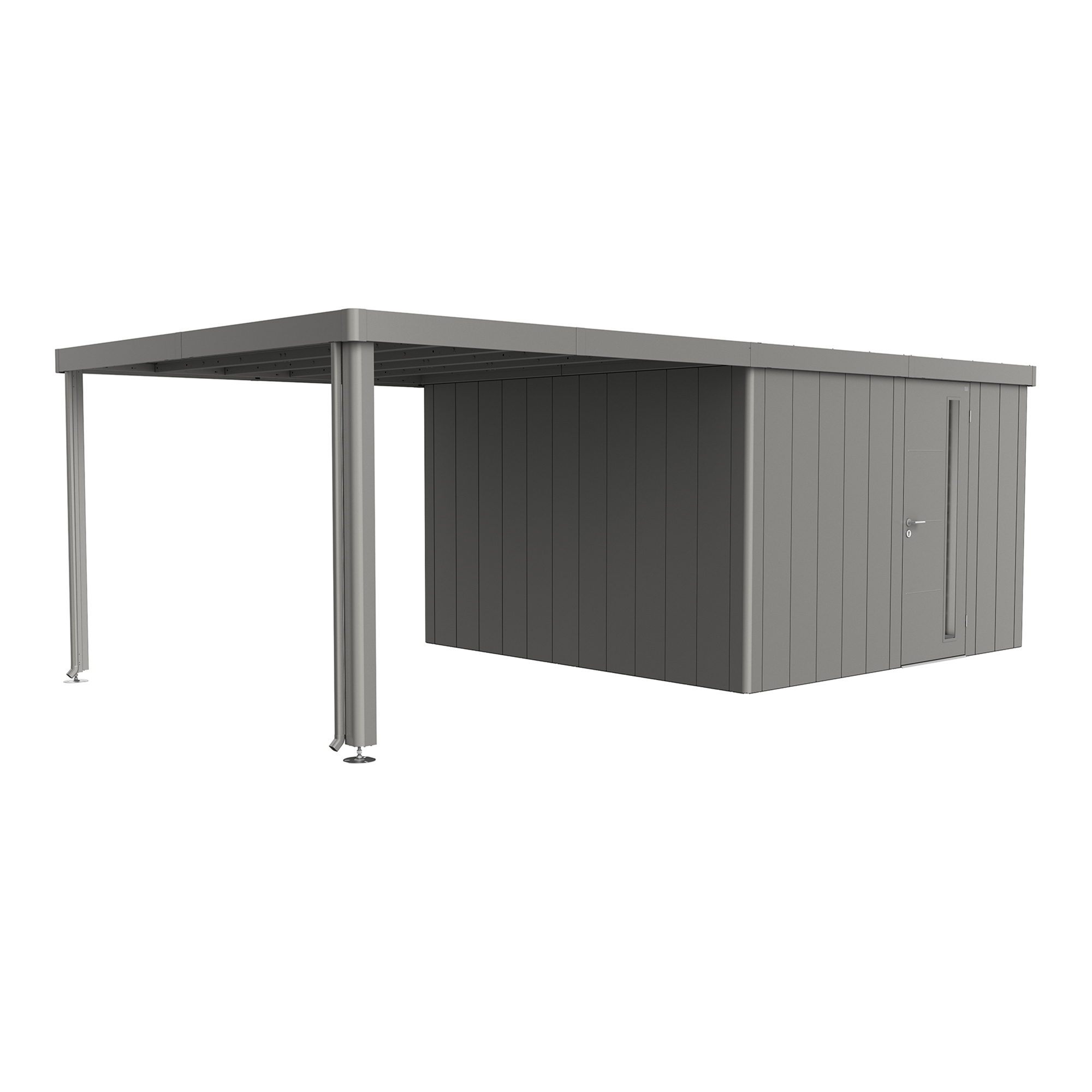 Sidetaket passer til redskapsbod fra Biohort på modellen Neo 2A/2B/2C/2D. Sidetaket kan festes på enten bare en side eller begge sidene. Aluminiumstøttene til taket er utstyrt med justerbare føtter for plan montering. To nedløpsrør er inkludert.