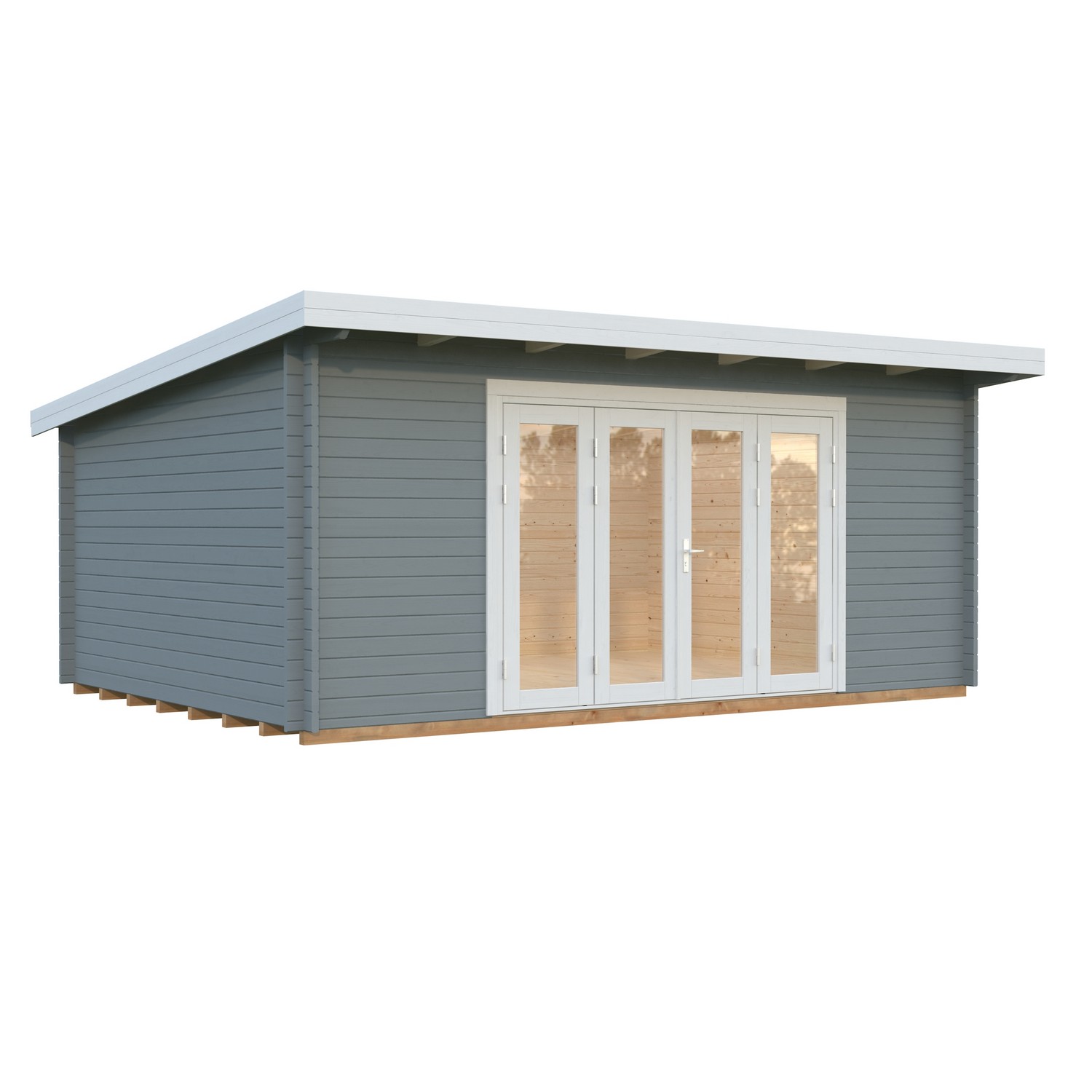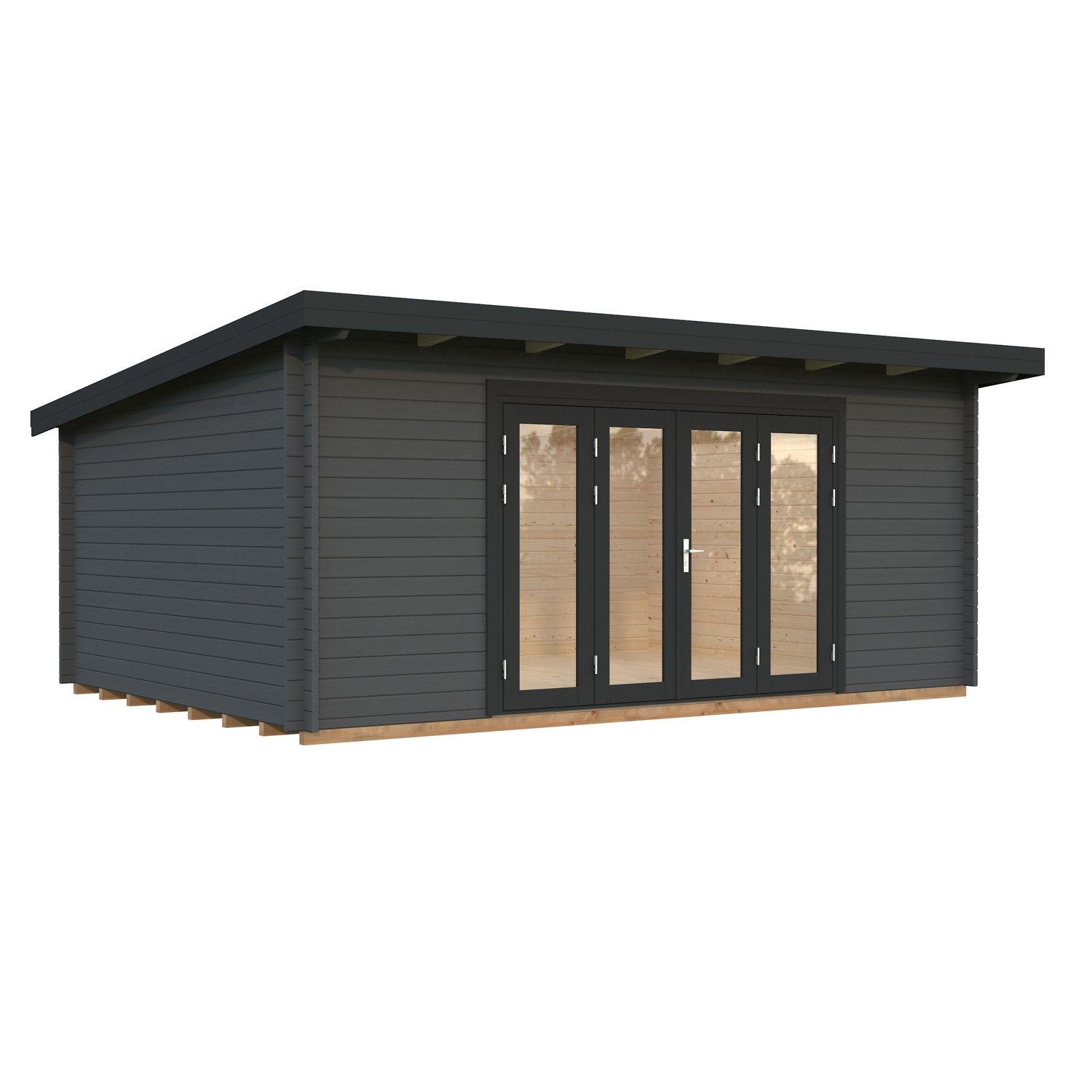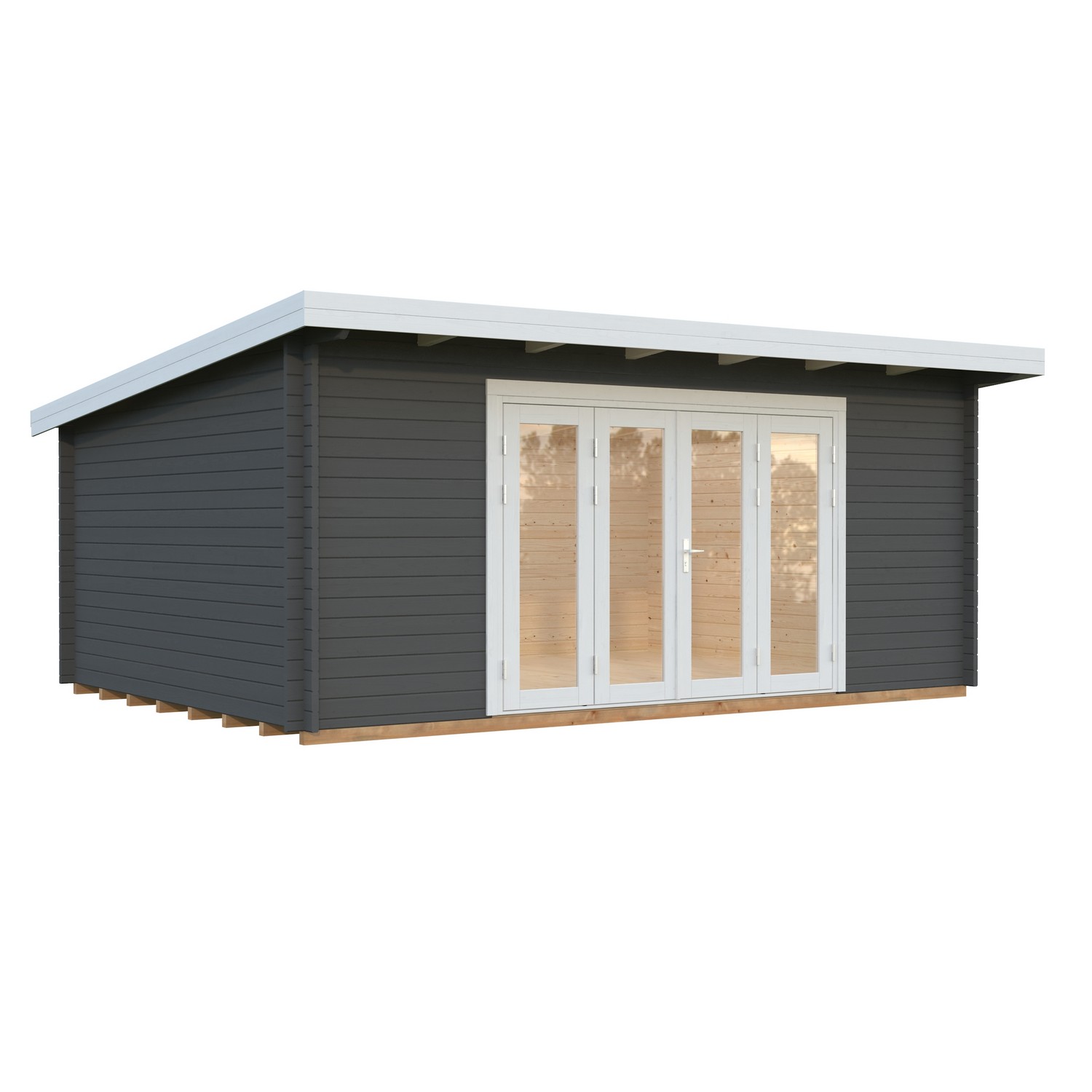 Laftet anneks / hagestue med moderne skråtak og to doble foldedører i front. Perfekt som samlingspunkt for god mat og drikke eller sosiale sammenkomster med familie eller venner. Kan også benyttes til oppbevaring av hagemøbler m.m. på vinteren. Leveres som byggesett inkludert alt av festemidler.