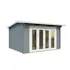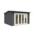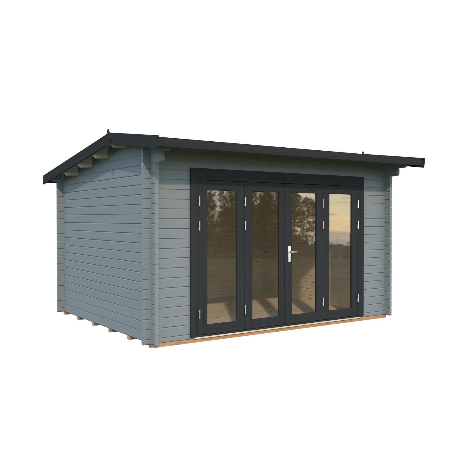 Hytte/anneks med moderne design og foldedører med isolerglass. Veggene er i 44 mm laft. Hytta leveres som byggesett