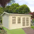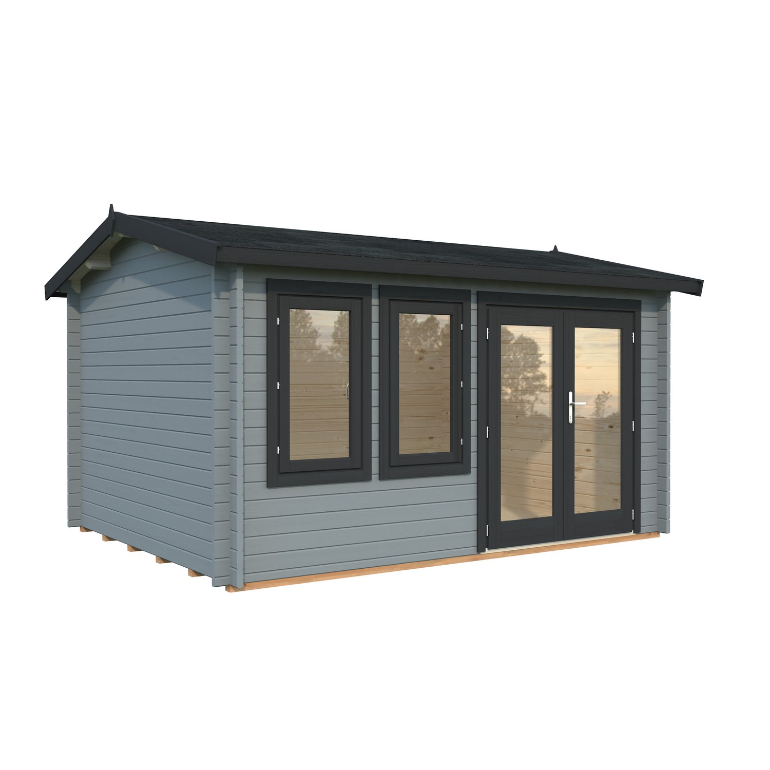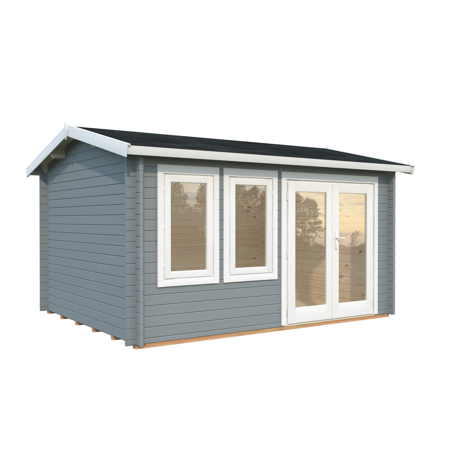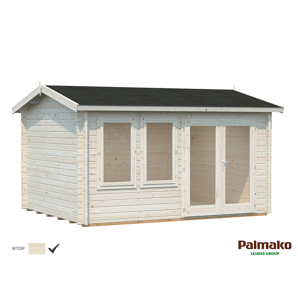Hytta Iris er laget av 44 mm tømmer med vindtette dobbelhaksknuter. Hytta har en halvglasert dobbeltdør med limtrekarm, sylinderlås og rustfritt stål som beskytter terskelen. To utgående vinduer med enkelglass. Veggdetaljer med dobbelhaksknuter. 5 års garanti.