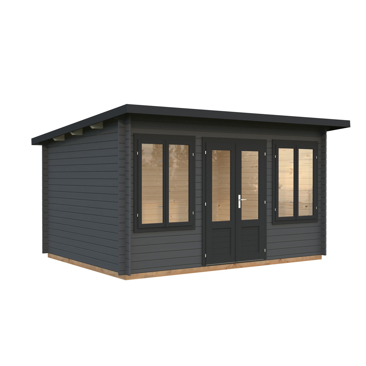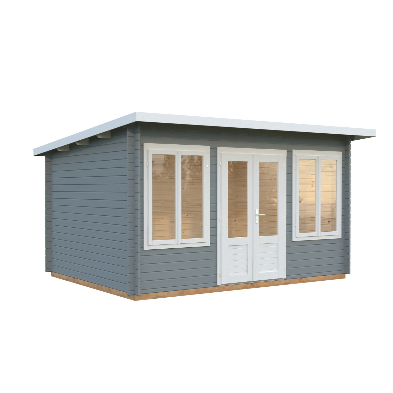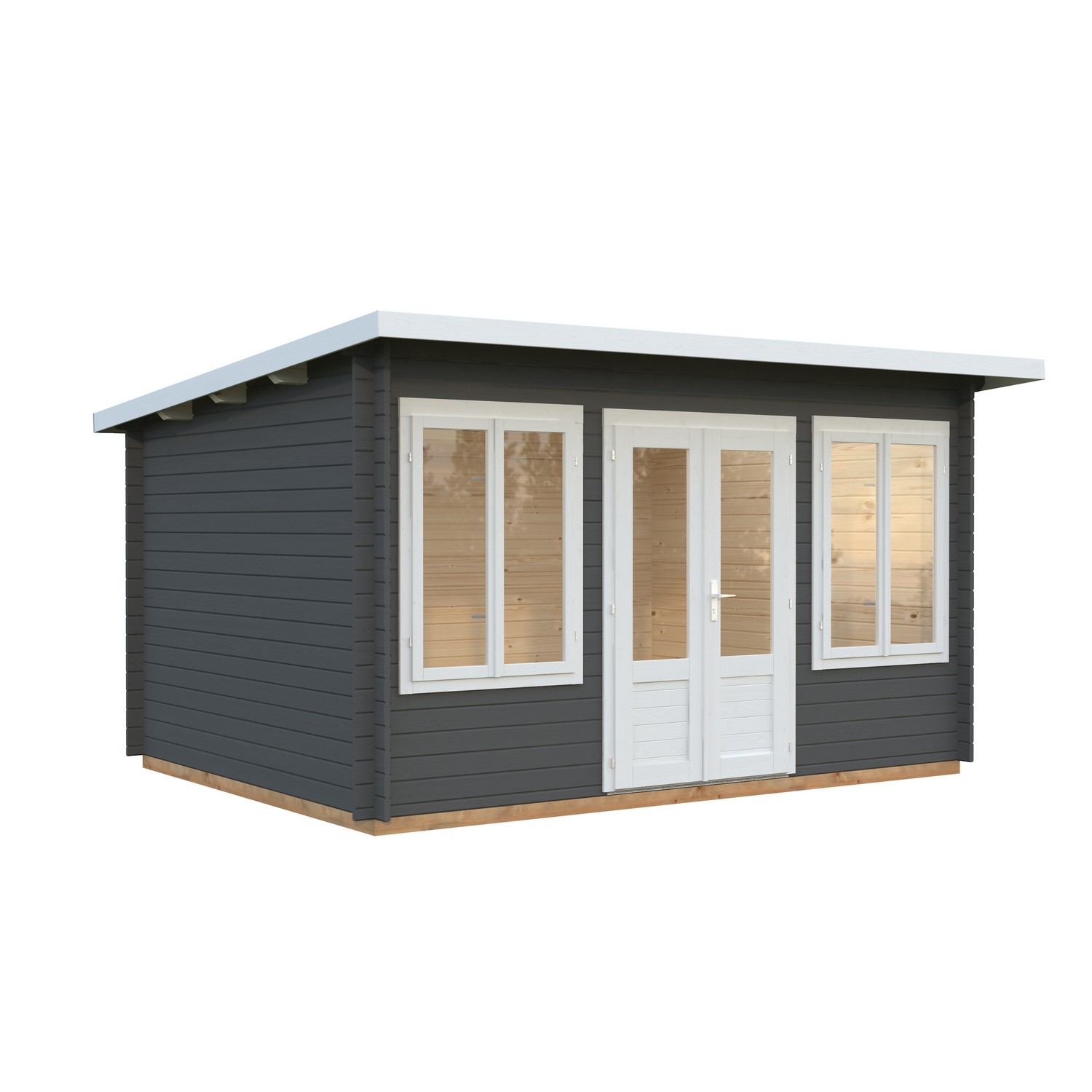 Laftet anneks / hagestue med moderne skråtak og to doble foldedører i front. Perfekt som samlingspunkt for god mat og drikke eller sosiale sammenkomster med familie eller venner. Kan også benyttes til oppbevaring av hagemøbler m.m. på vinteren. Leveres som byggesett inkludert alt av festemidler.