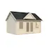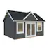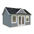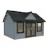 Romantisk laftet hagestue med store vinduer og dobbel glassdør i front.