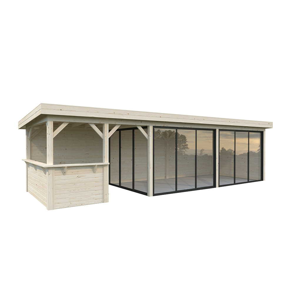 Kraftig limtrekonstruksjon, 28 mm veggbord og 19 mm takbord. Skyvedørspartiene glass og aluminium er vedlikeholdsfrie, og kan åpnes til begge sider.