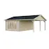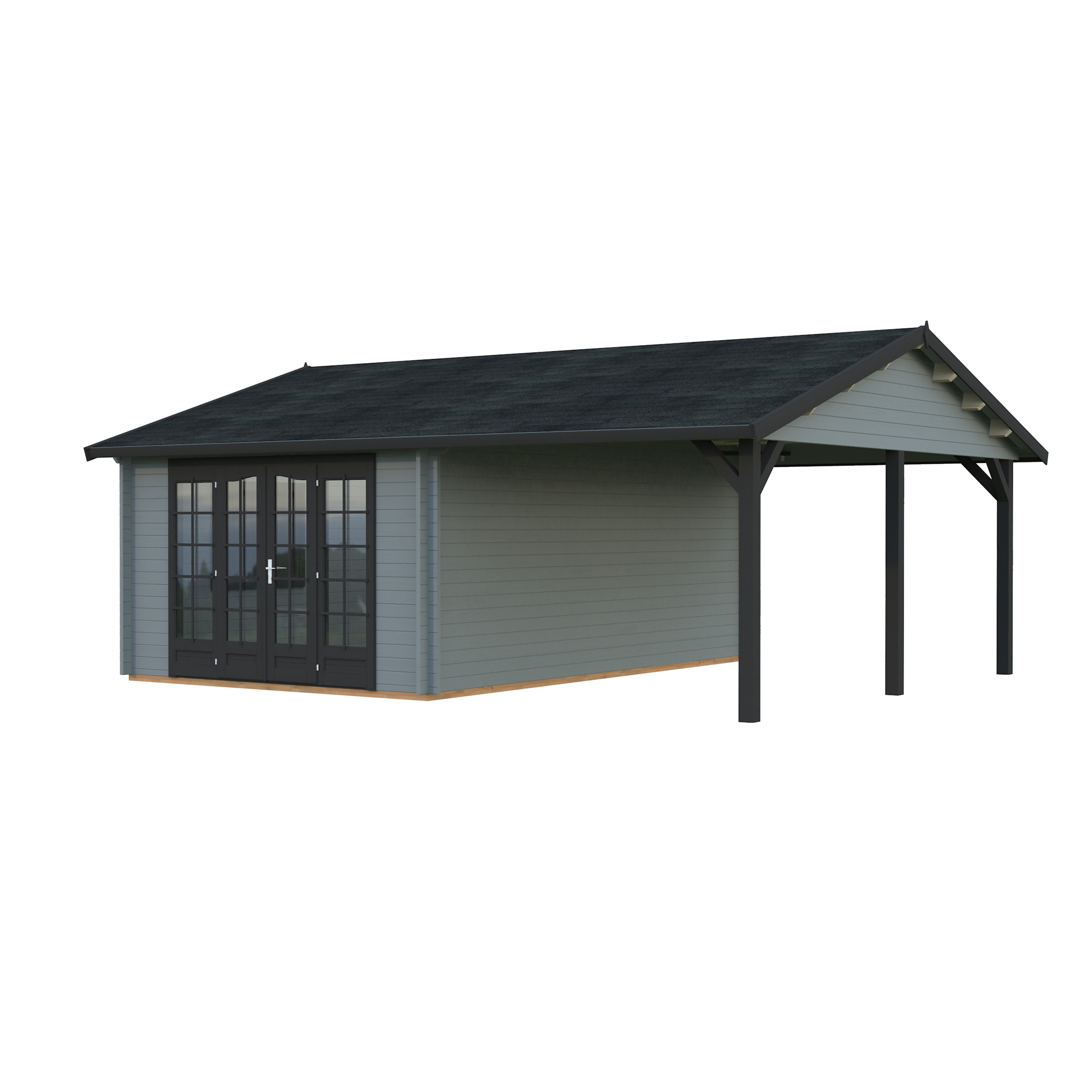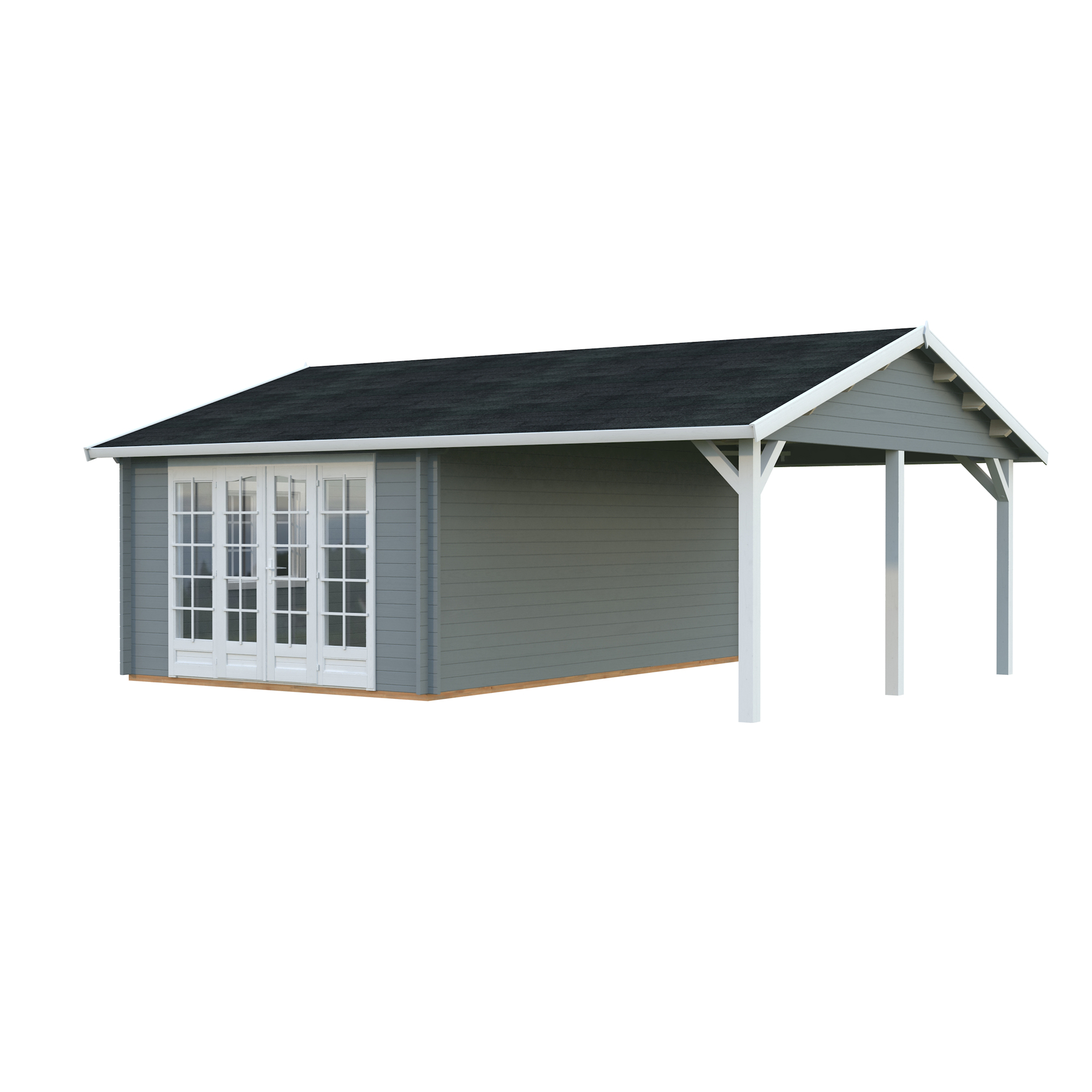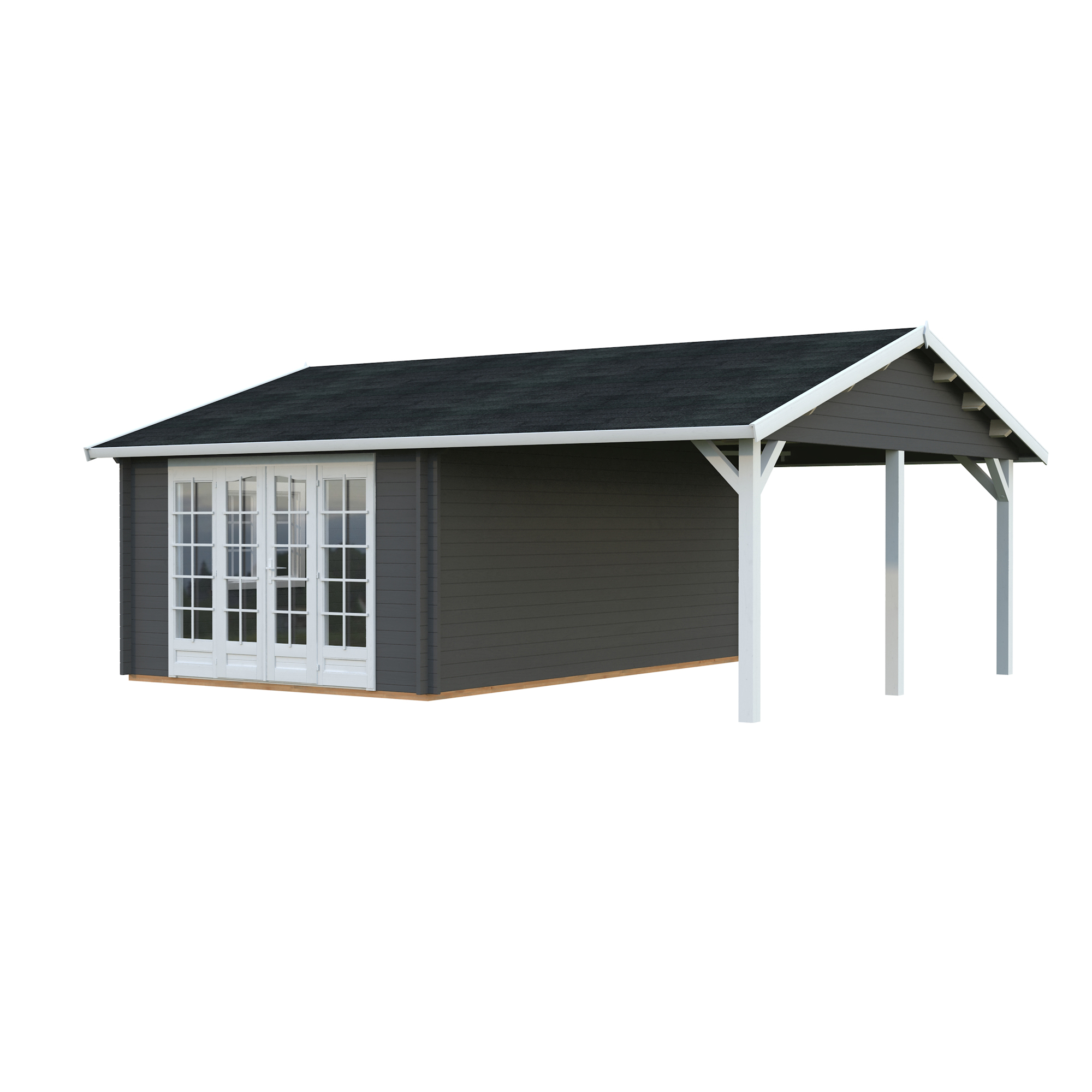 Palmako sin hytte Irene 19,0 + 16,2 m² har et klassisk saltak og et romslig takoverbygg som er perfekt for å slappe av i hagen, arrangere små sammenkomster, nyte grillfester og middagsinvitasjoner. Den overbygde uteplassen gir rikelig med beskyttelse for utekjøkken og hagemøbler.