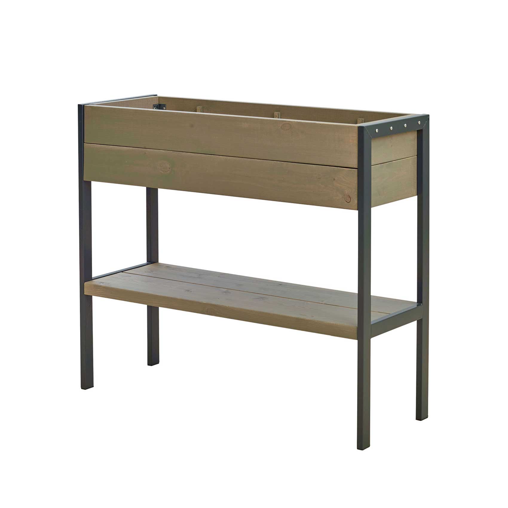 Blomsterkasse Funkis på ben fra PLUS med en hylle. Laget av furu/gran med en stålramme som har blitt pulverlakkert i en antrasittgrå farge.