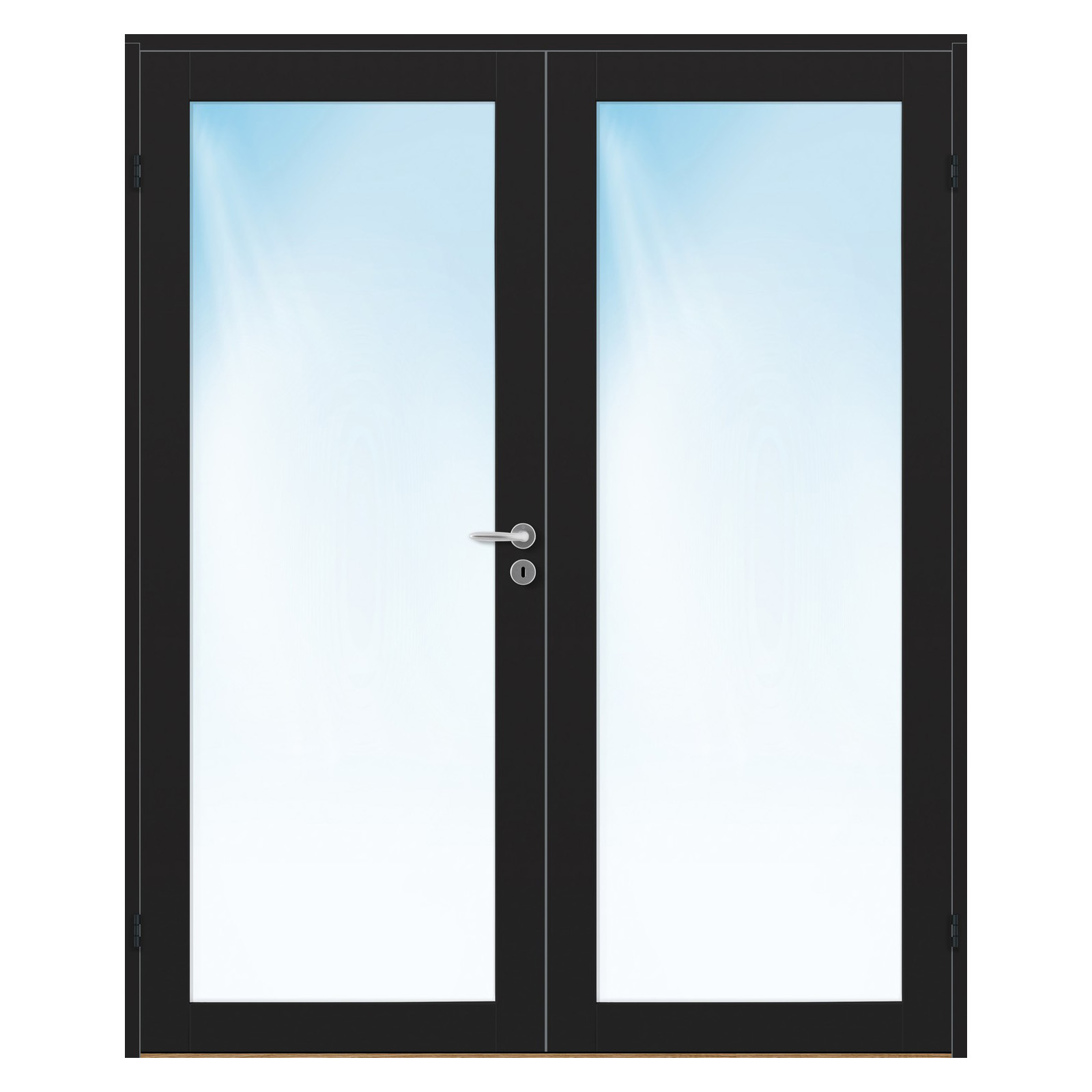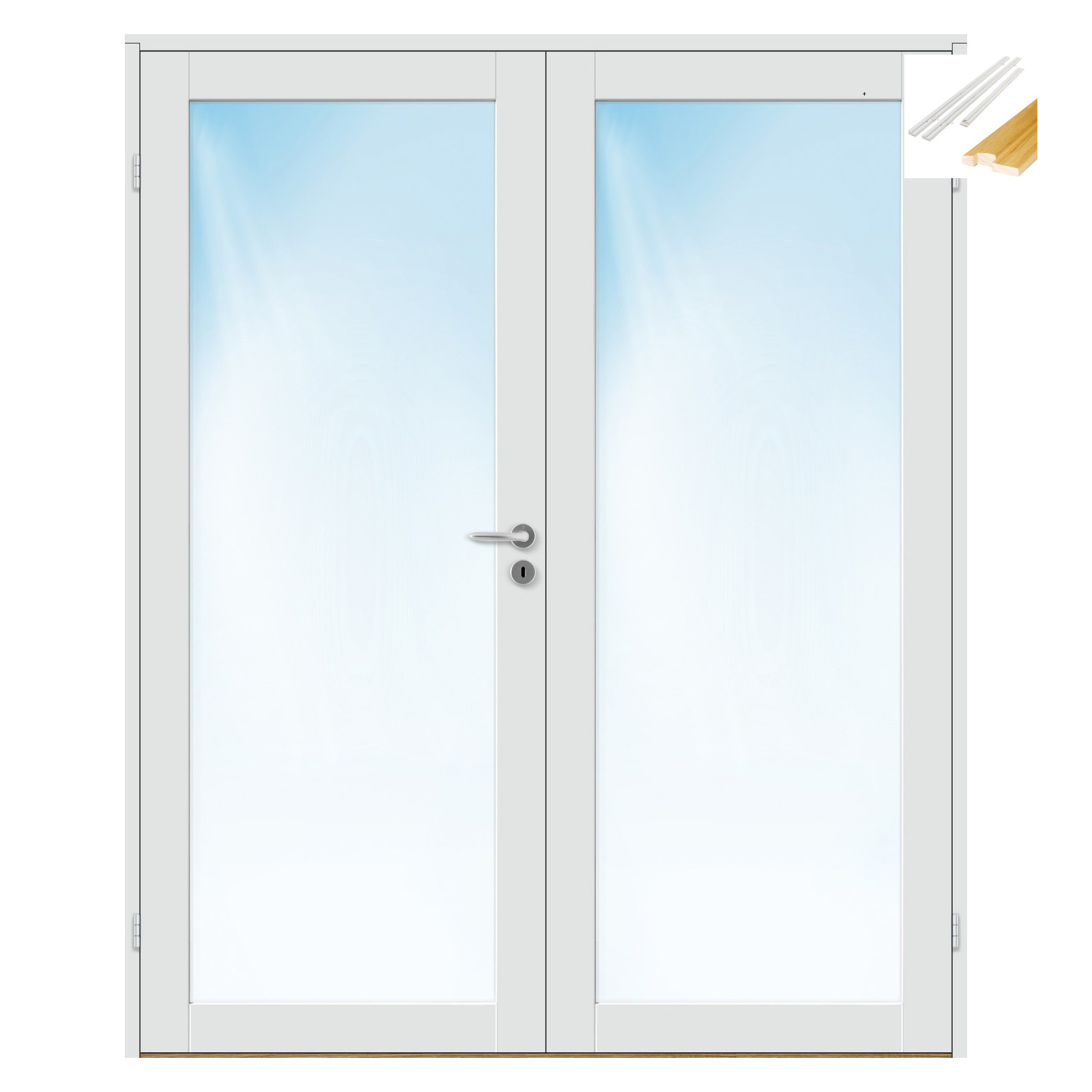Tofløyet Dør Bygg1 Base 1 Klarglass er en moderne og minimalistisk tofløyet likedelt innerdør med ett stort glassparti i klarglass pr dørblad.
