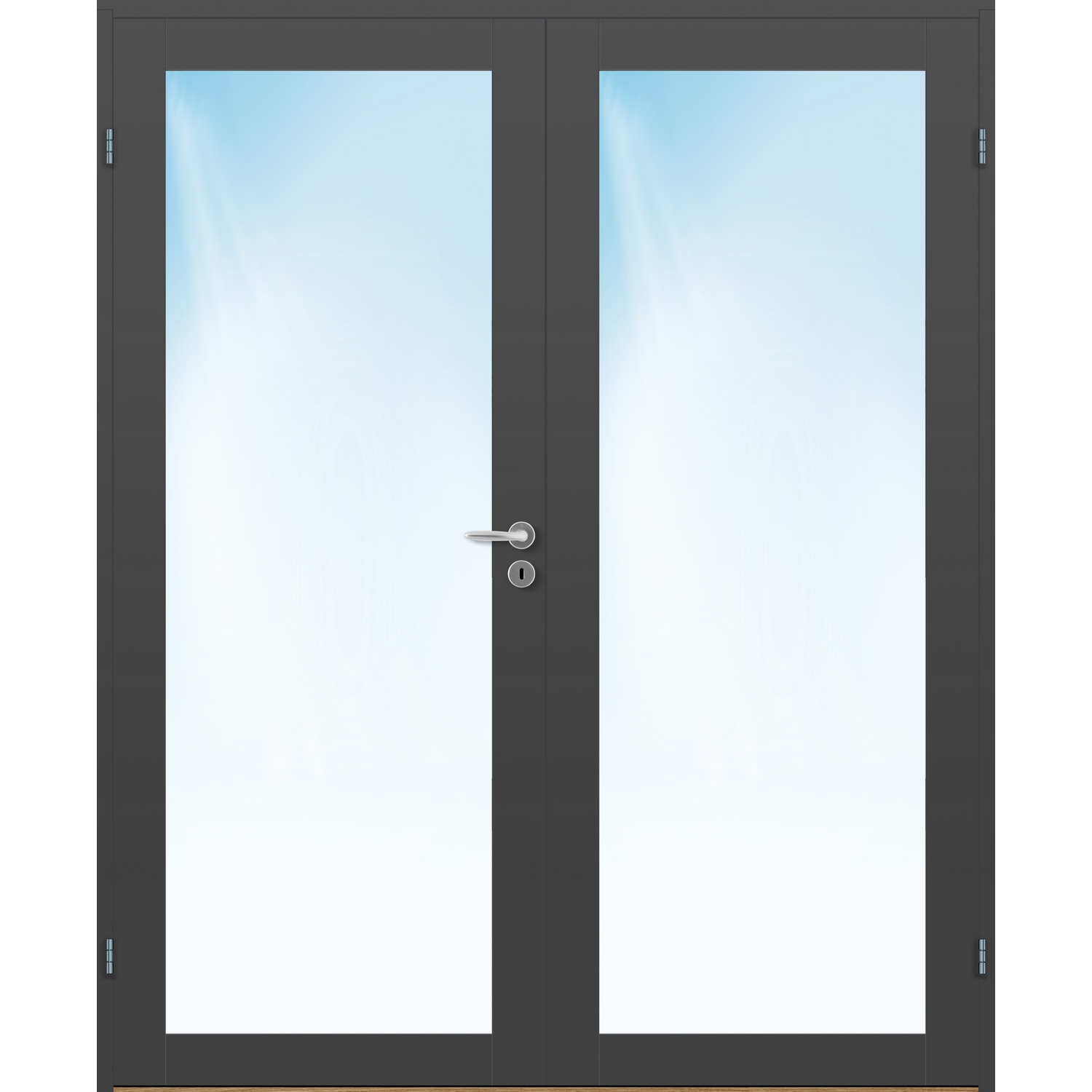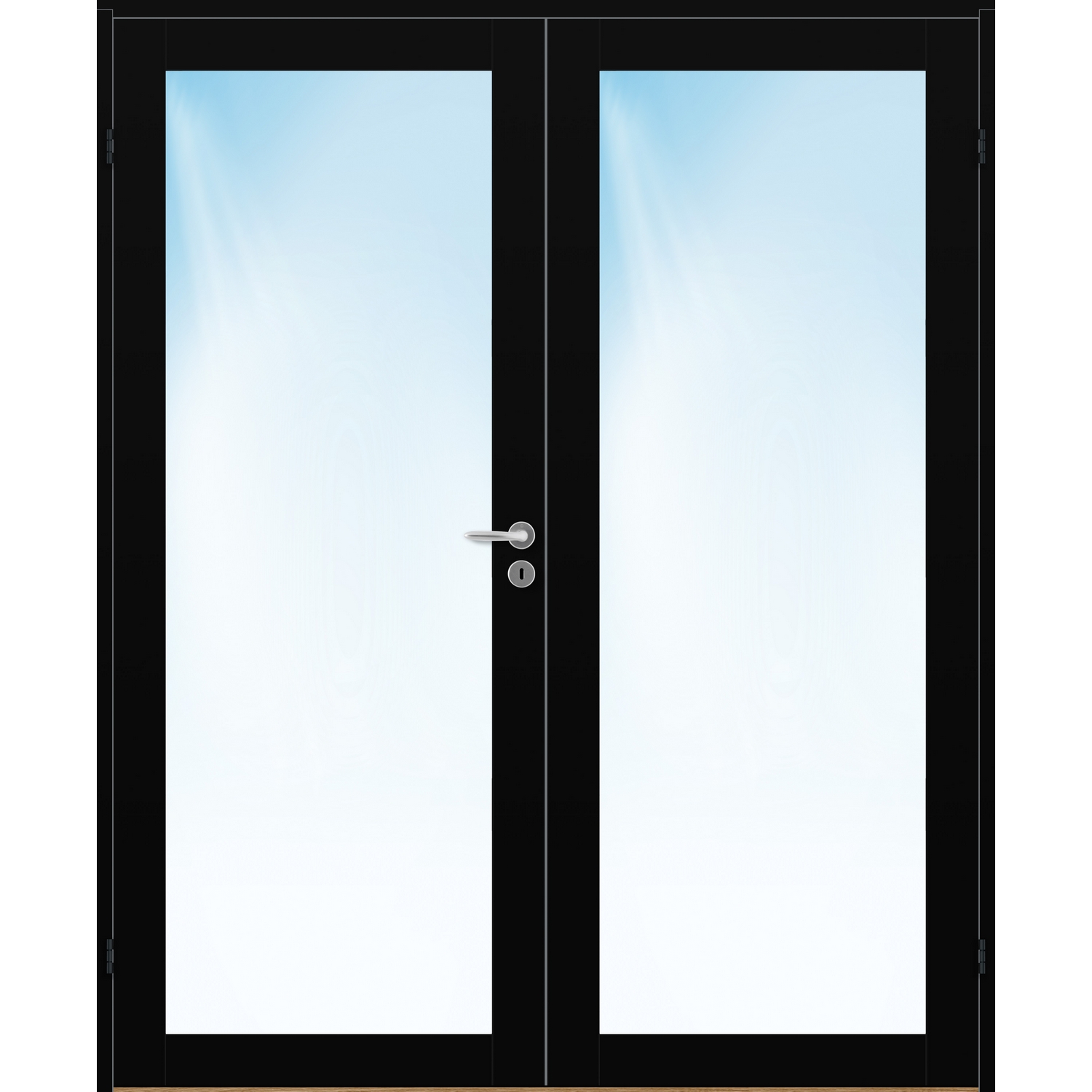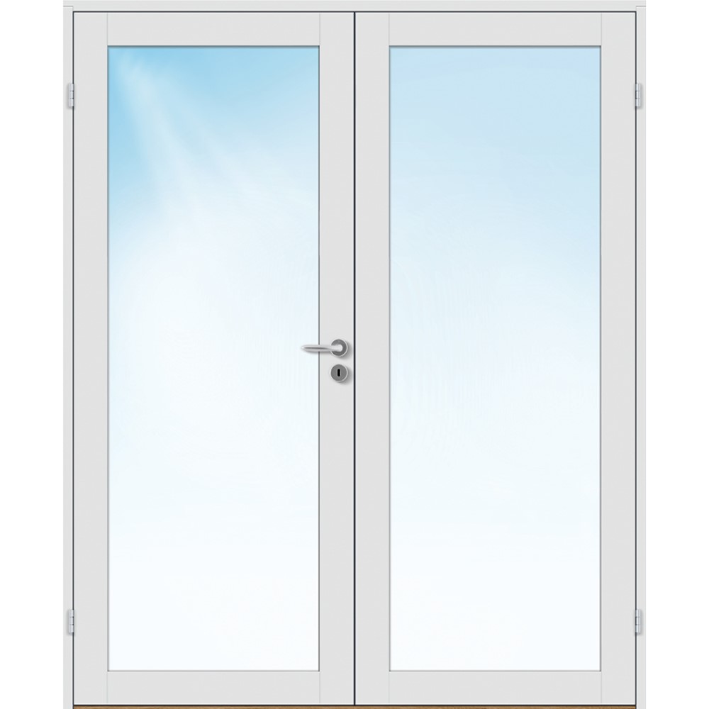 Tofløyet Dør Bygg1 Base 1 Klarglass er en moderne og minimalistisk tofløyet likedelt innerdør med ett stort glassparti i klarglass pr dørblad.