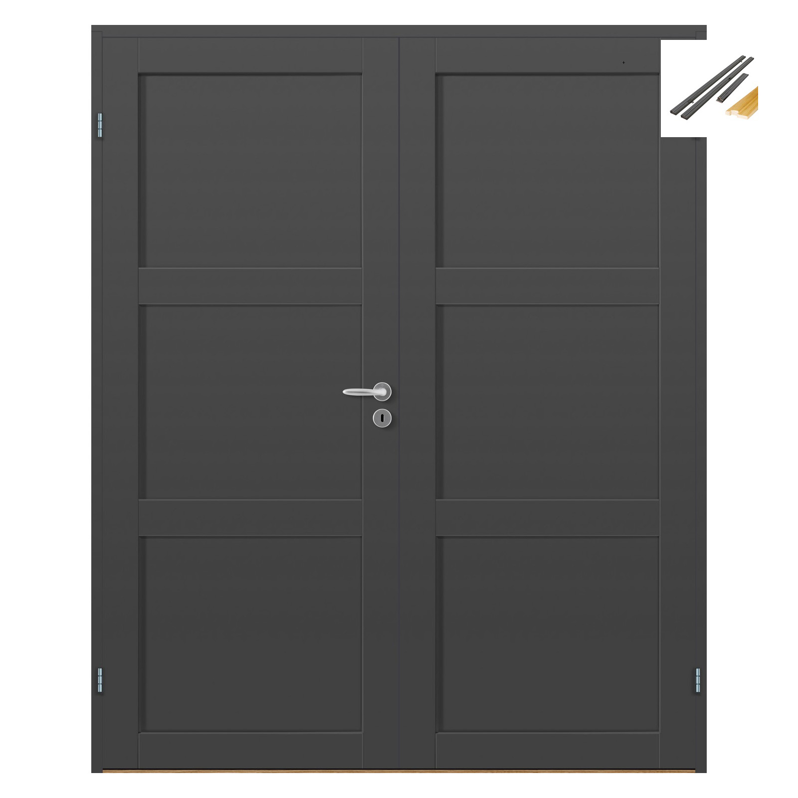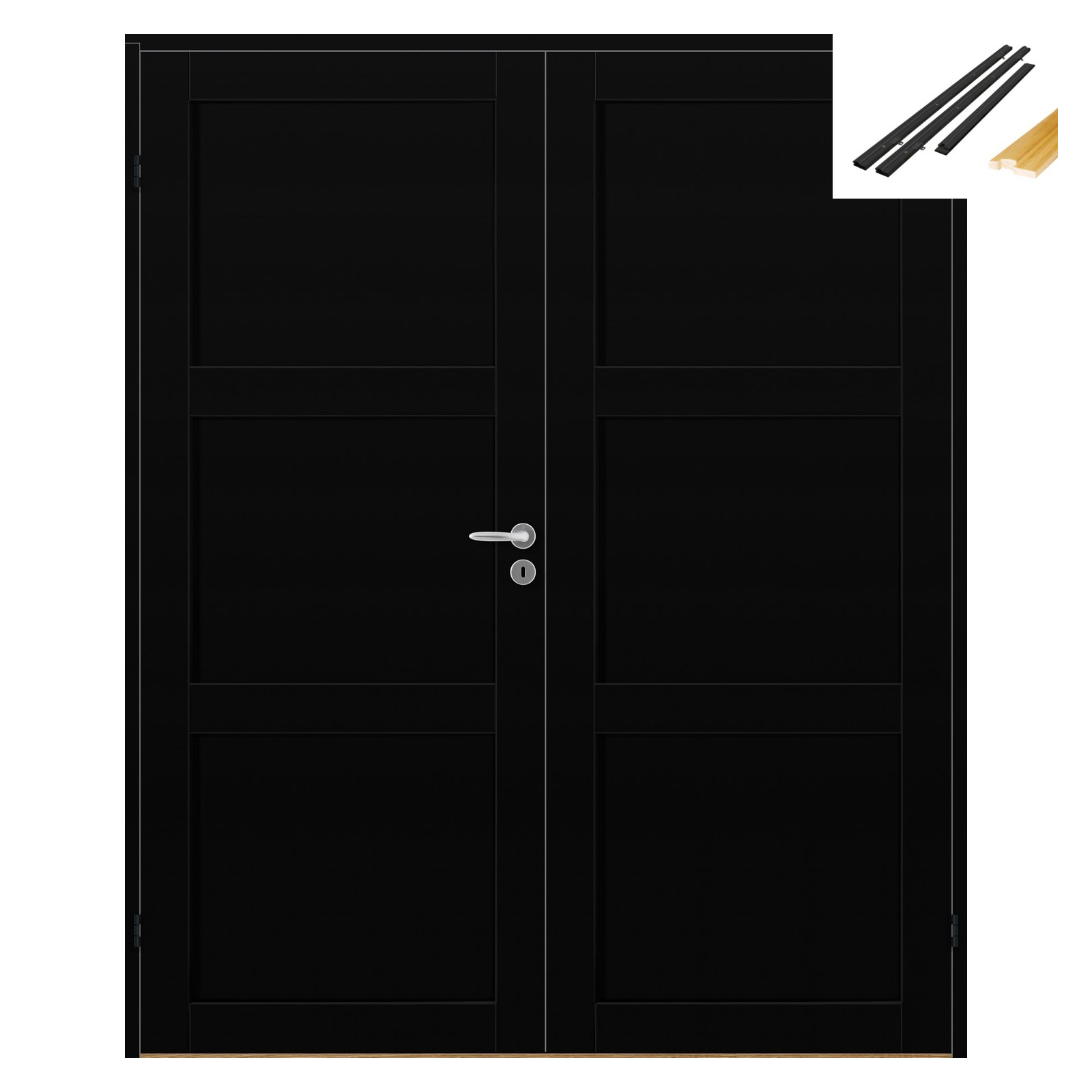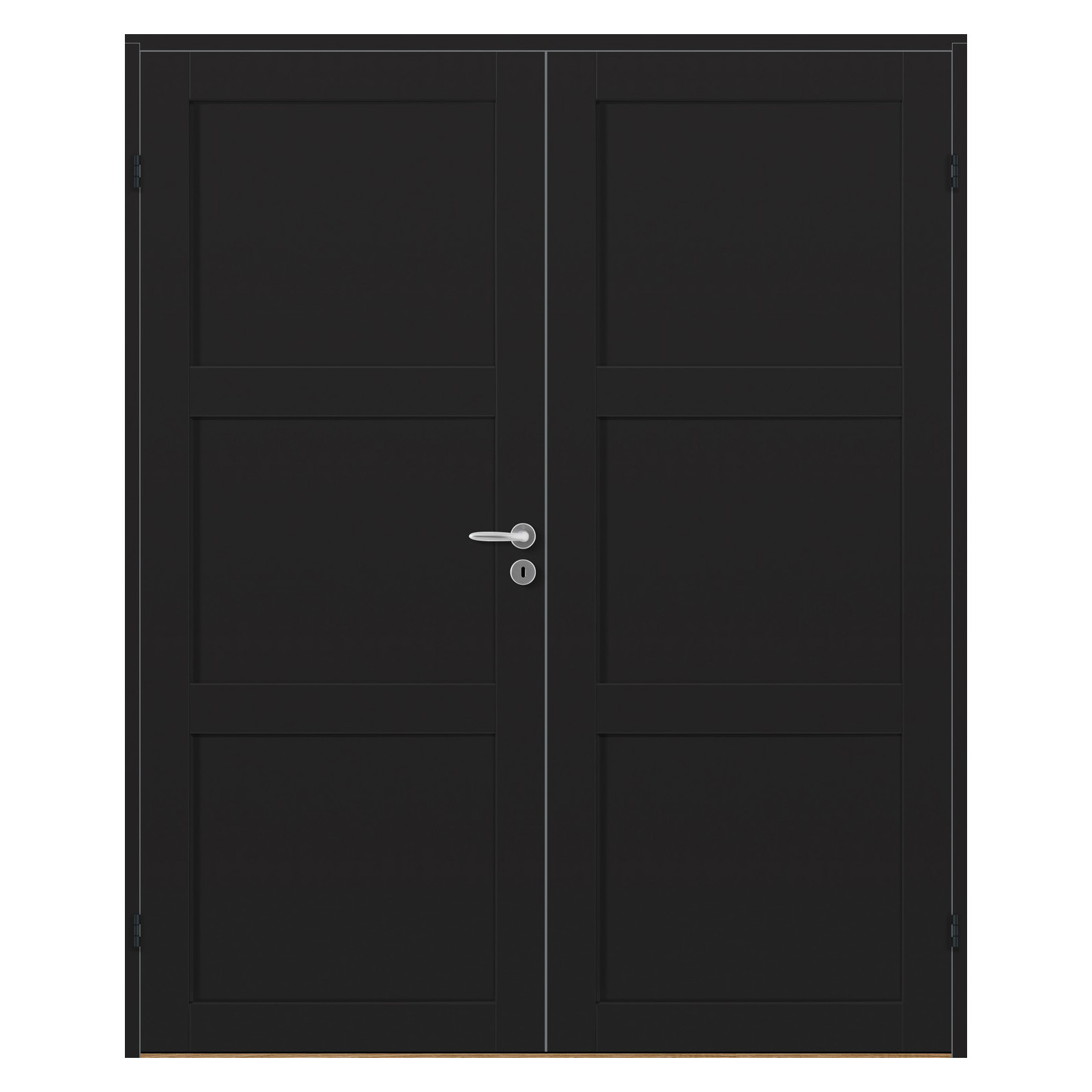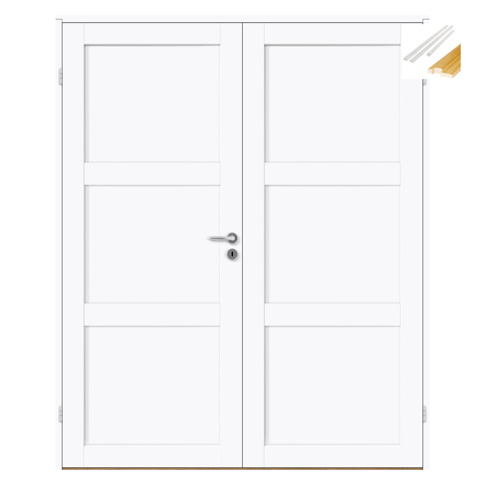 Tofløyet Dør Bygg1 Base 3 er en moderne og minimalistisk tofløyet likedelt innerdør med 3 stk dørspeil pr dørblad.