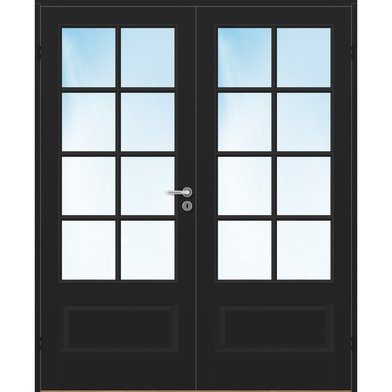 Dobbel innerdør leveres med automatisk lik deling mellom dørbladene. Ønsker du en annen løsning, ber vi deg kontakte kundeservice for å få et riktig tilbud på dør med hengslet sidepanel.