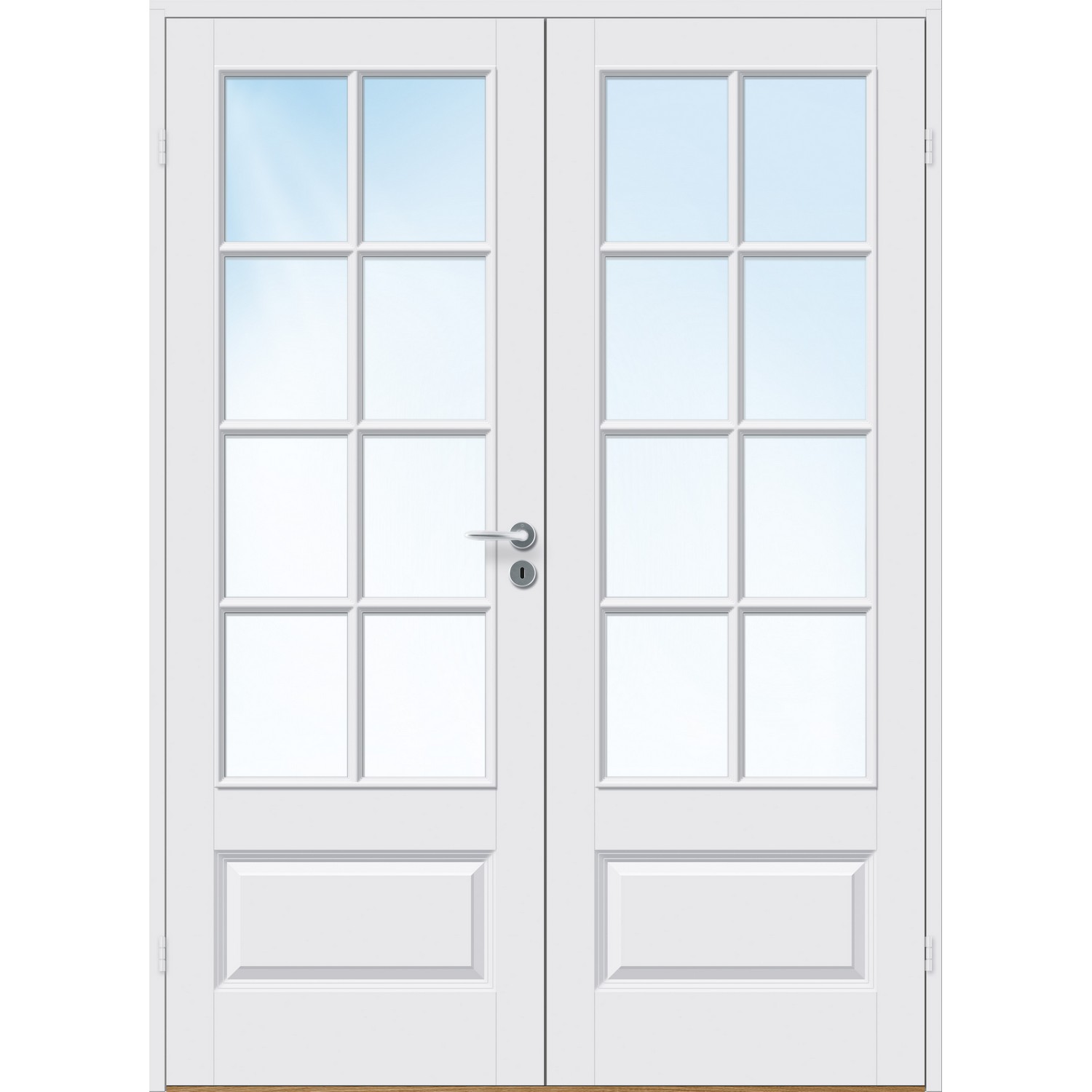Tofløyet Dør Bygg1 Ida Kompakt FW Hvit Klarglass er en klassisk, tofløyet dør med 8 glassruter per dør.