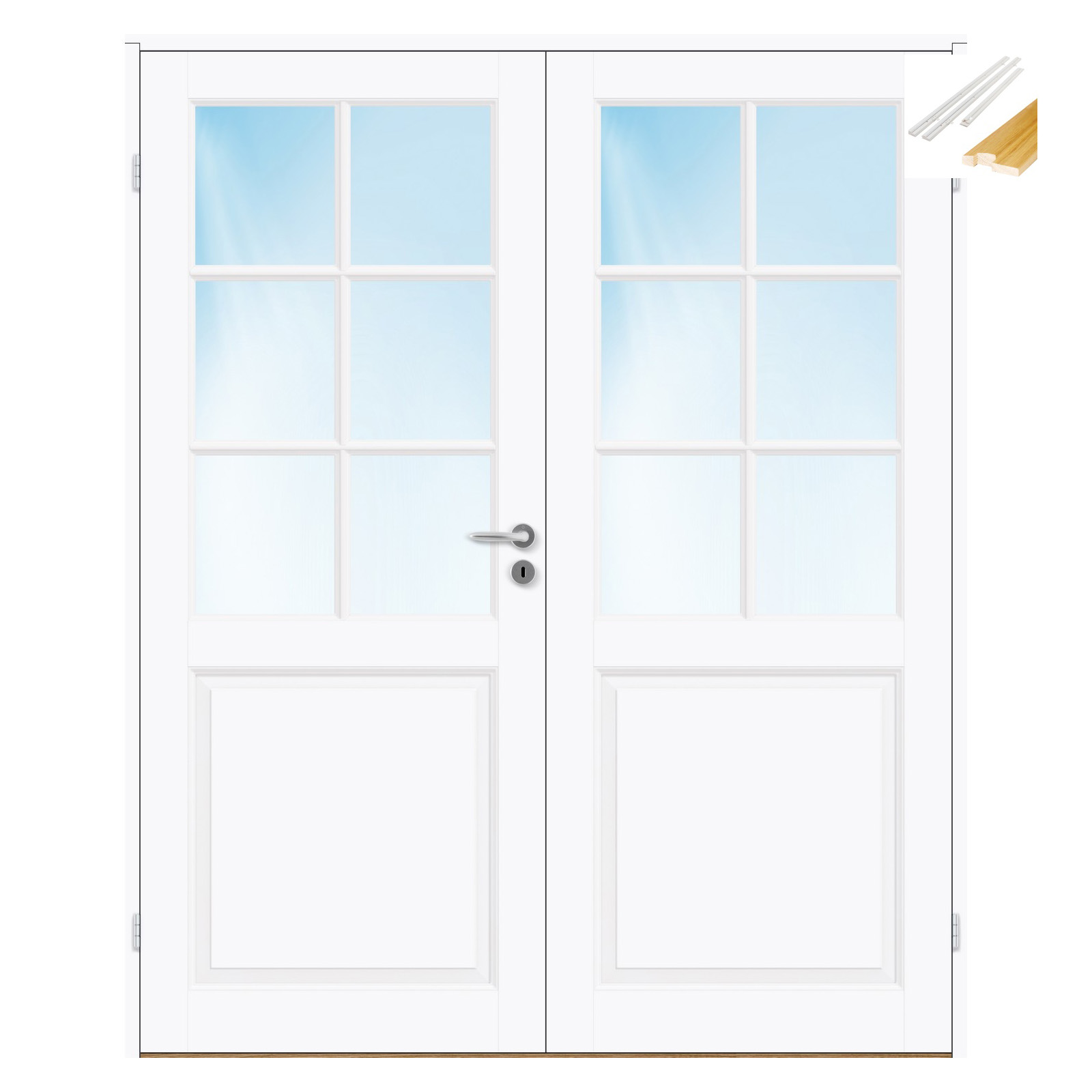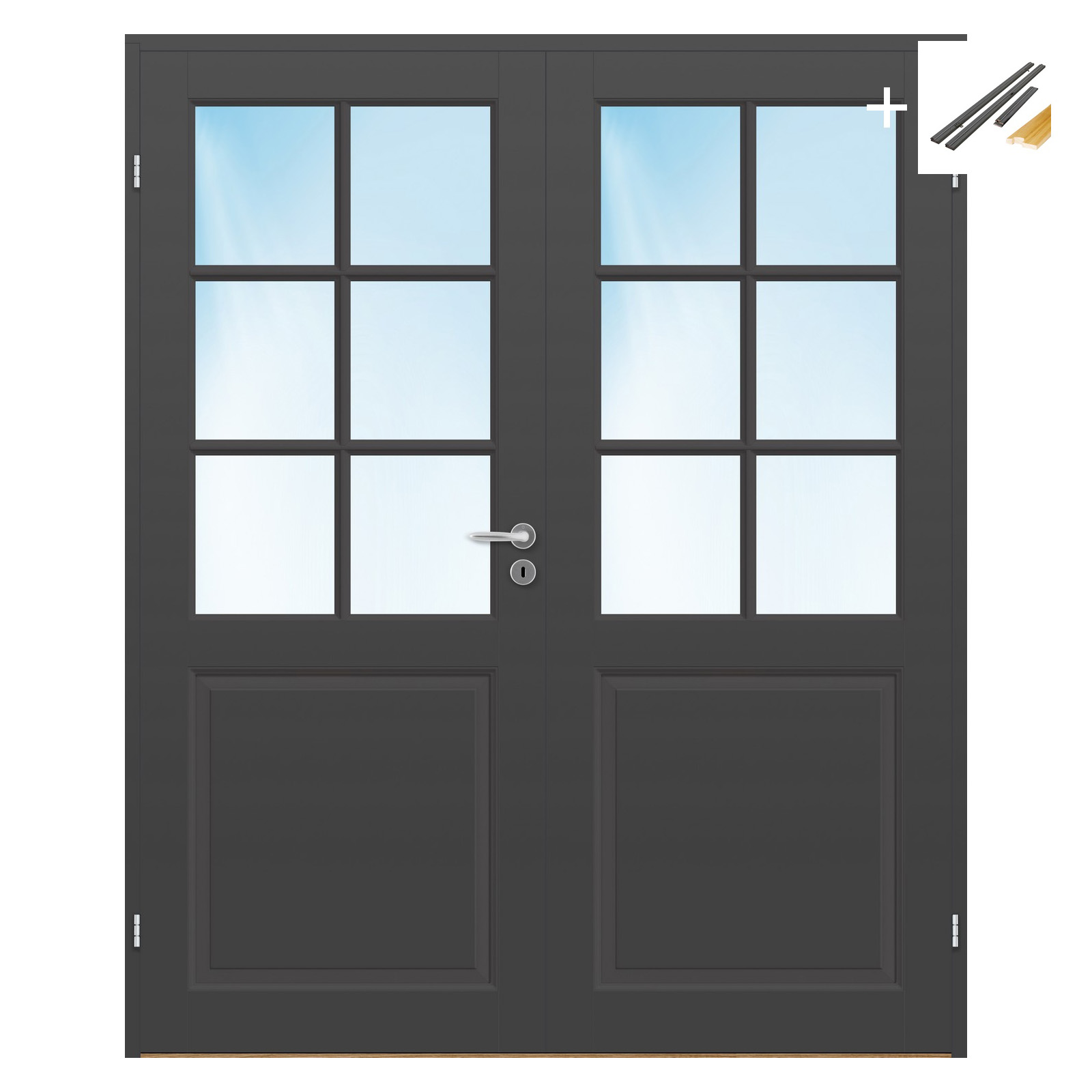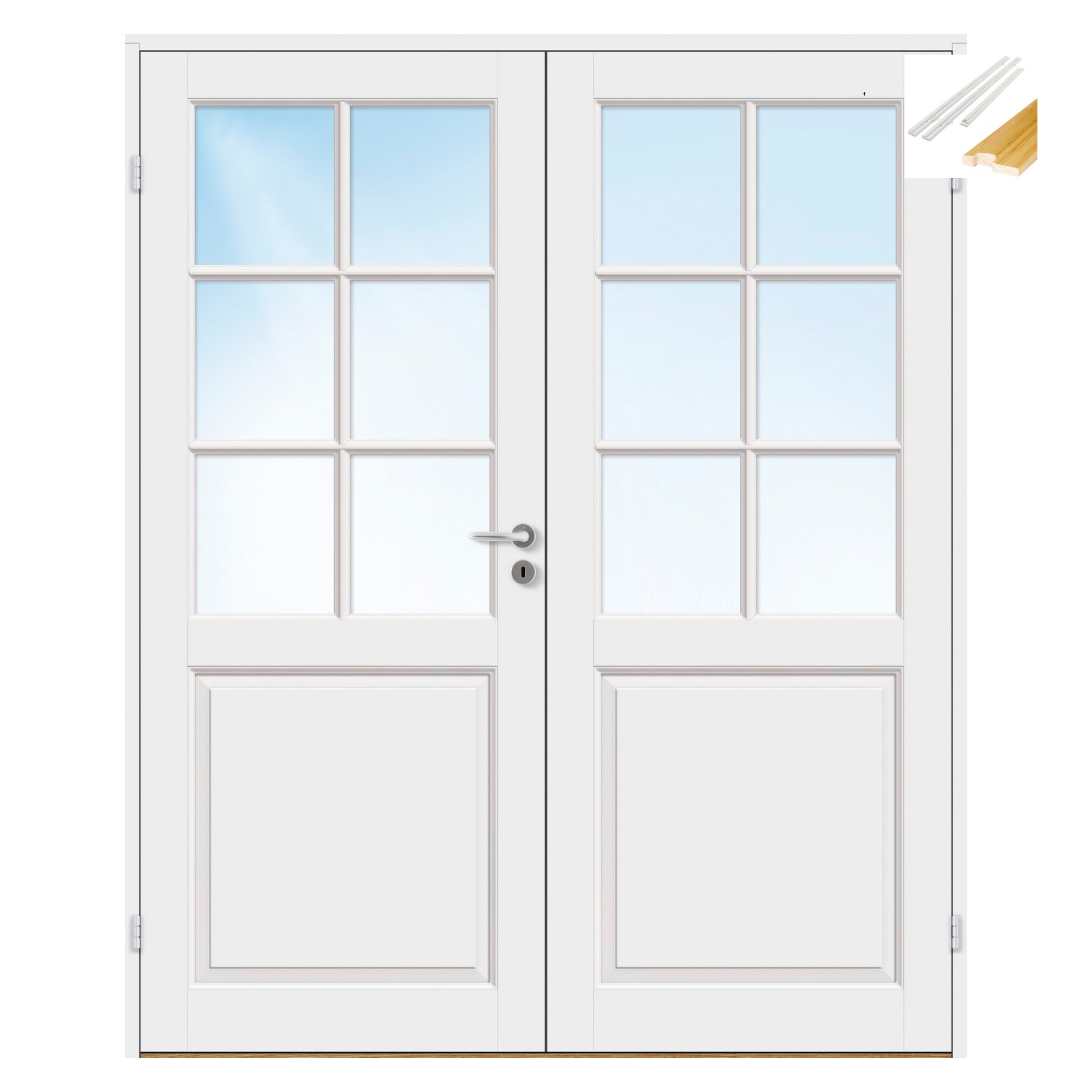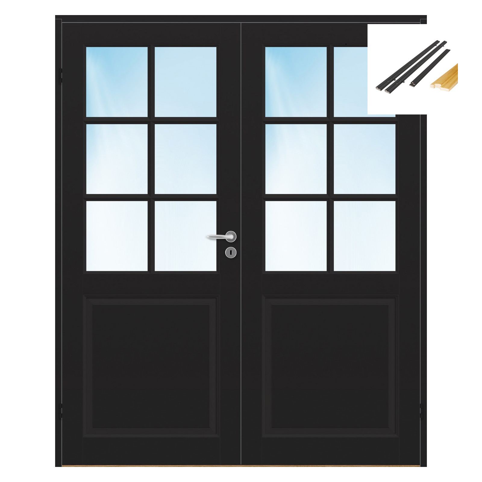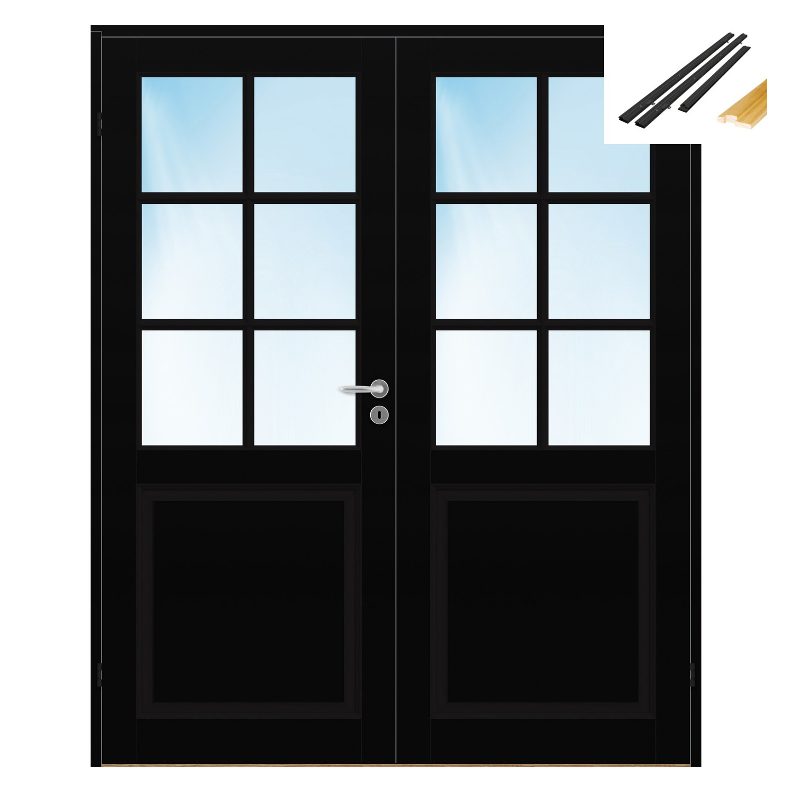 Tofløyet Dør Bygg1 Jonas HW Klarglass er en massiv fyllingsdør i klassisk design med glasspart med 2x3 utenpåliggende sprosser og et speil i nedkant pr dørblad.
