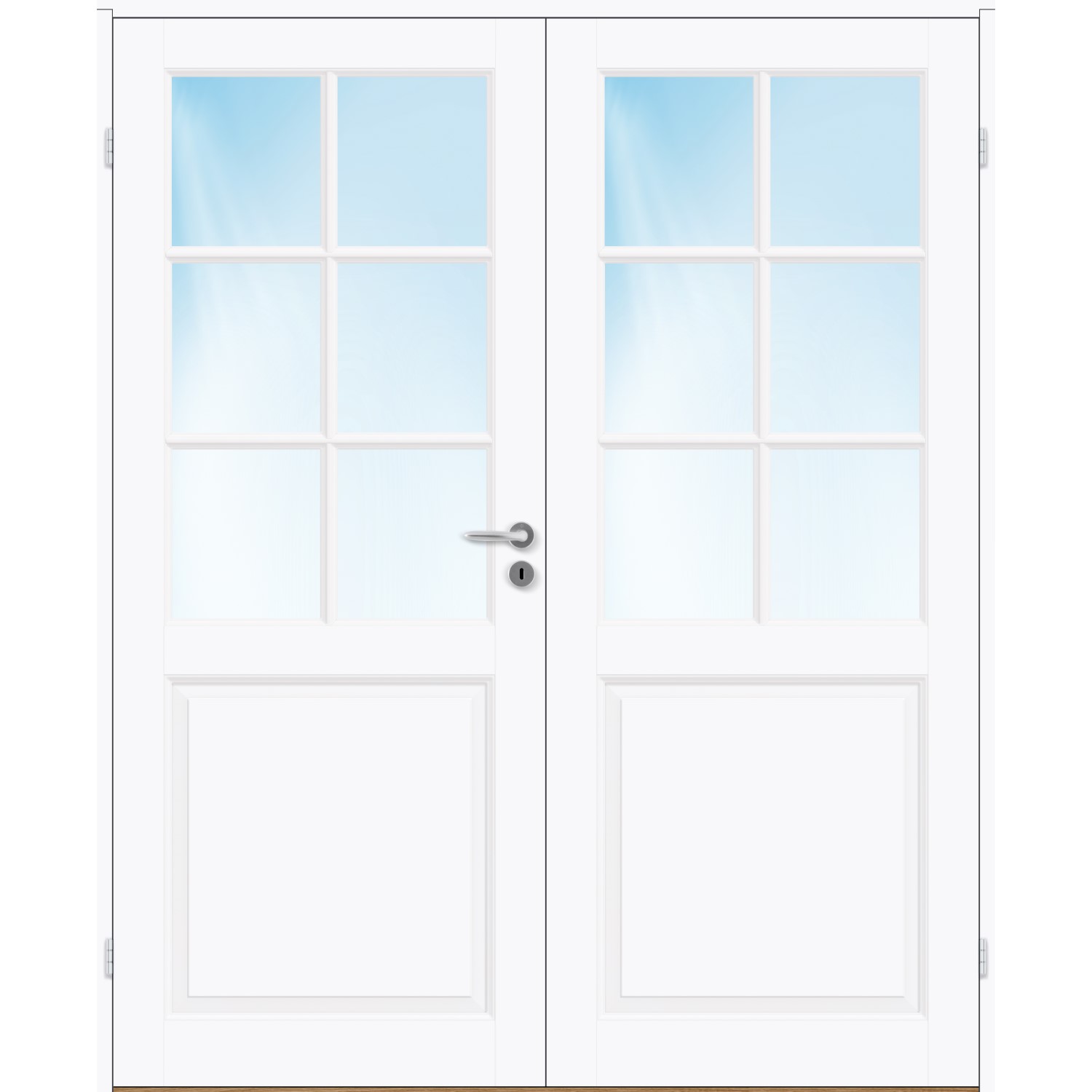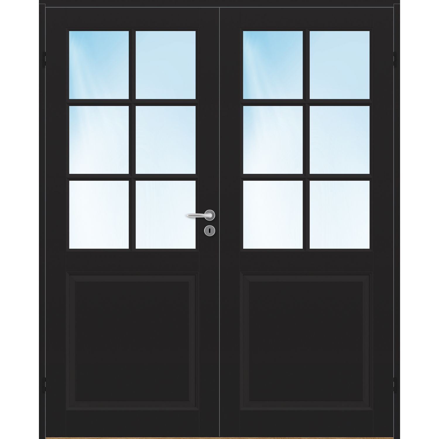 Tofløyet Dør Bygg1 Jonas HW Klarglass er en massiv fyllingsdør i klassisk design med glasspart med 2x3 utenpåliggende sprosser og et speil i nedkant pr dørblad.