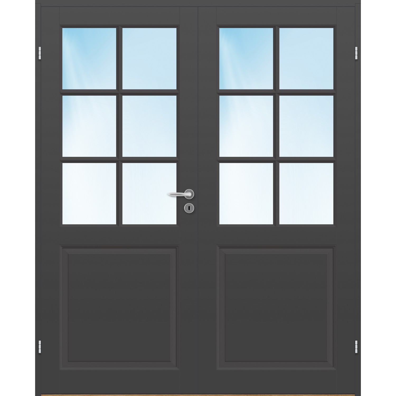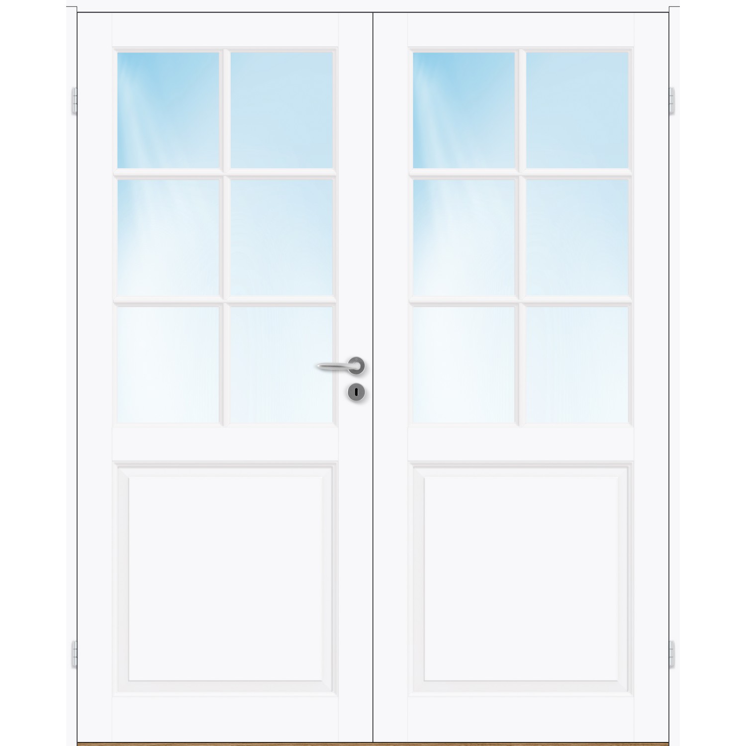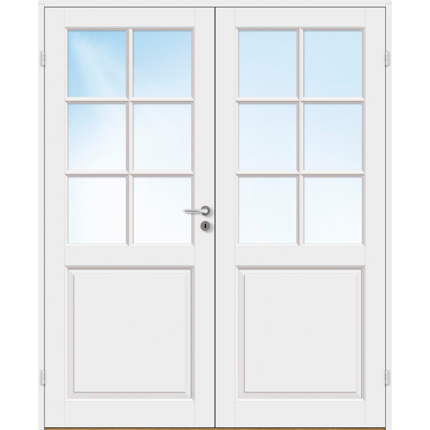 Dobbel innerdør leveres med automatisk lik deling mellom dørbladene. Ønsker du en annen løsning, ber vi deg kontakte kundeservice for å få et riktig tilbud på dør med hengslet sidepanel.