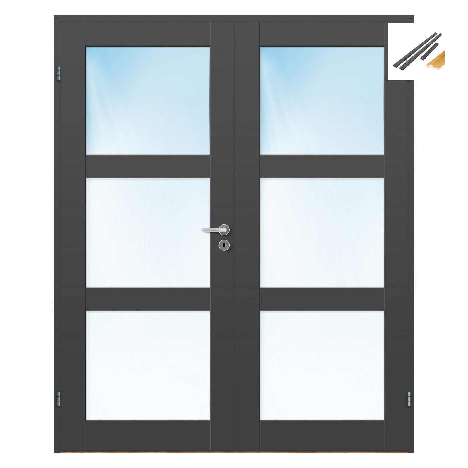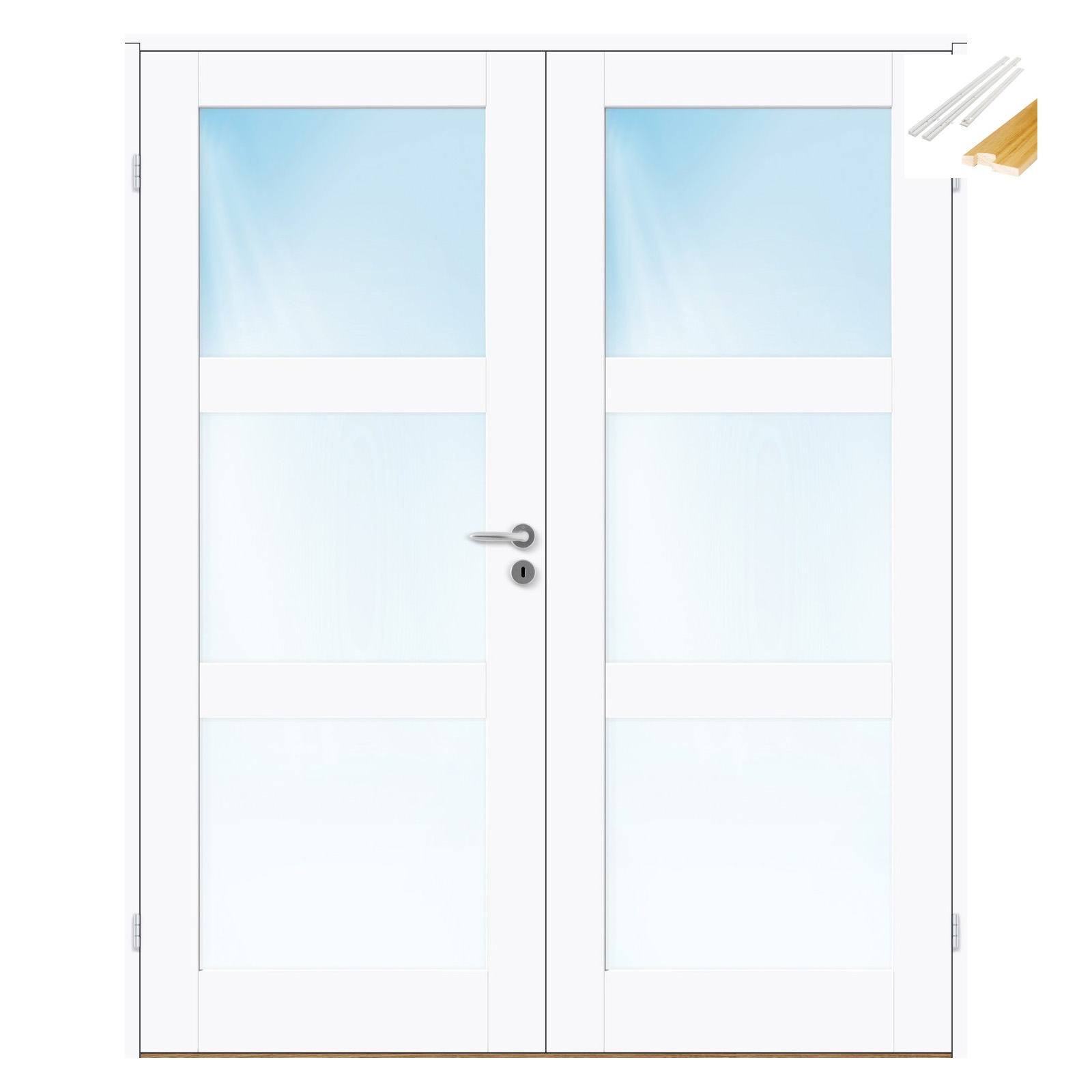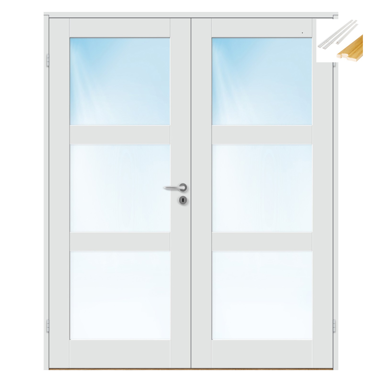 Tofløyet Dør Bygg1 Stil3 Glass er en elegant, tofløyet innerdør med et stort, tredelt glassparti i hver dør.