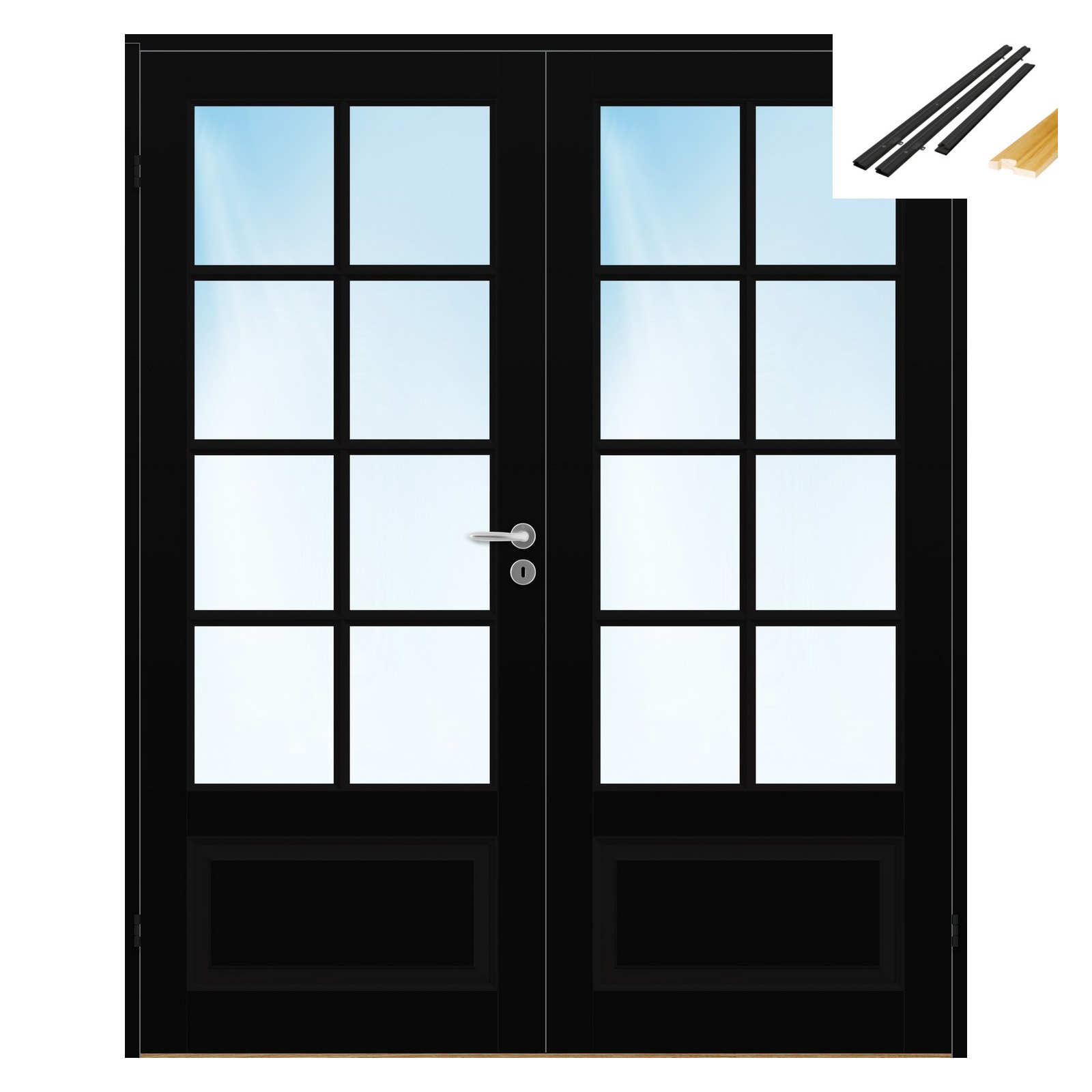 Tofløyet Dør Bygg1 Thomas FW Klarglass er en massiv fyllingsdør i klassisk design med glasspart med 2x4 ruter utenpåliggende sprosser og et vertikalt speil i nedkant pr dørblad.