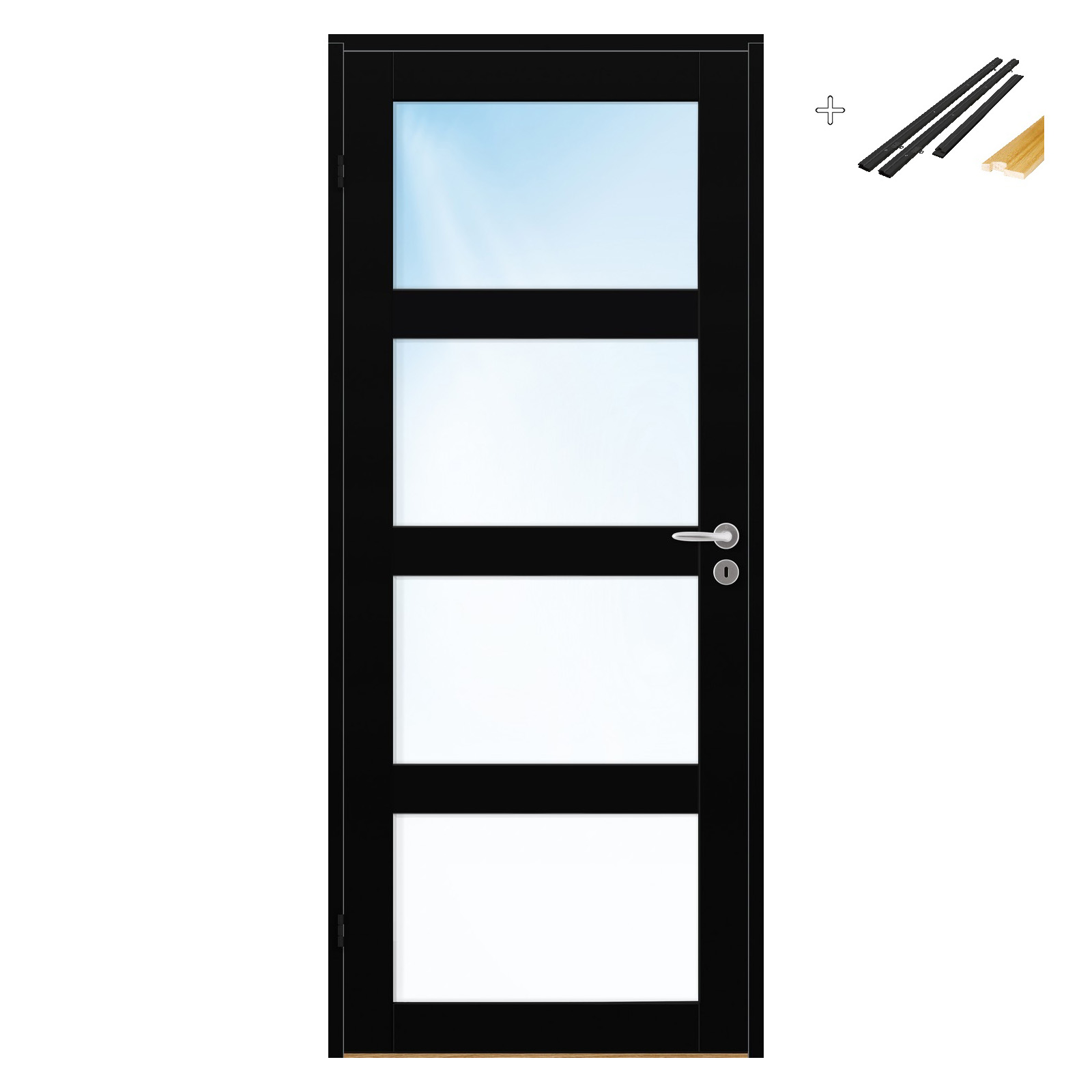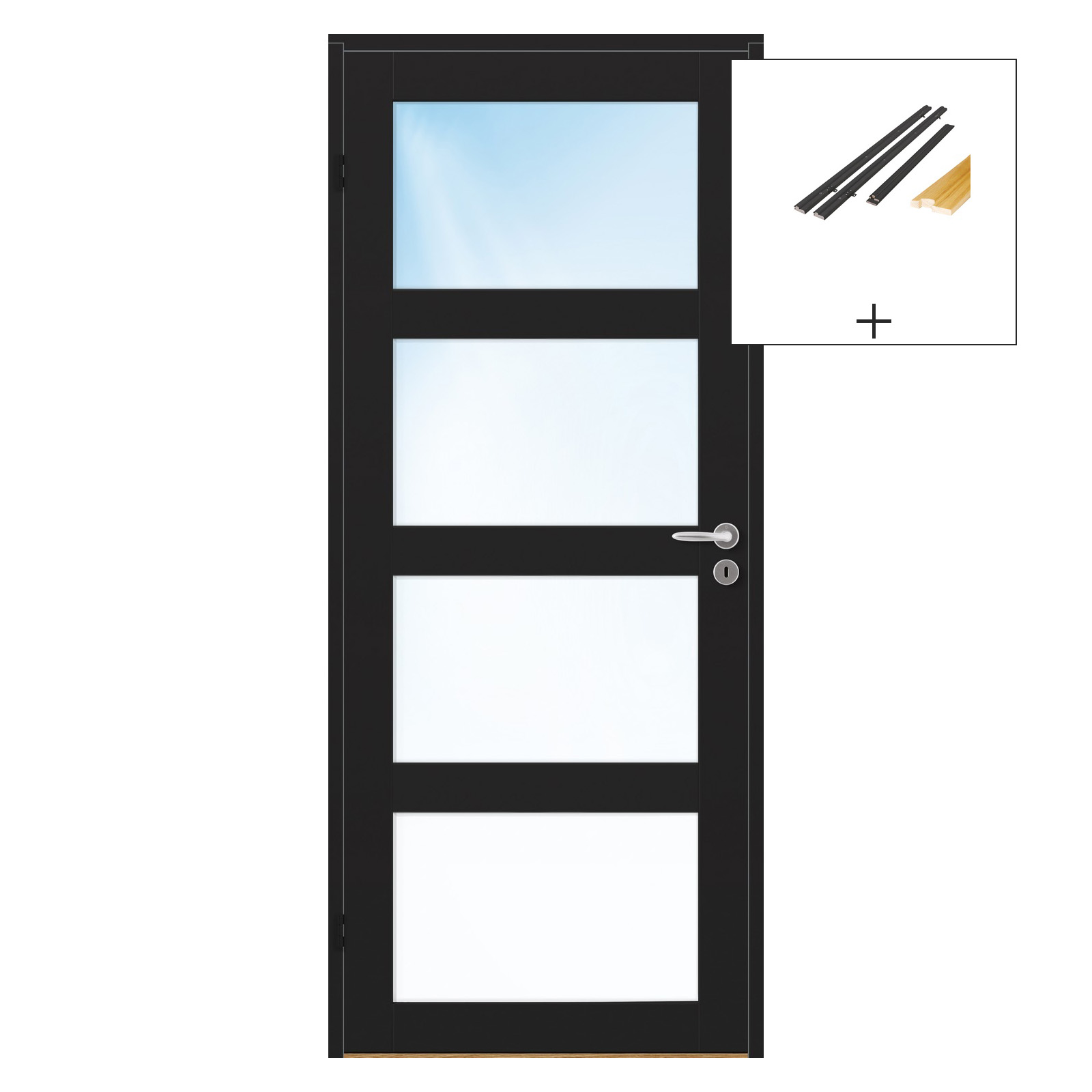 Innerdør Bygg1 Base 4 Klarglass er en moderne og minimalistisk innerdør med 4 stk glassfelt i klarglass.