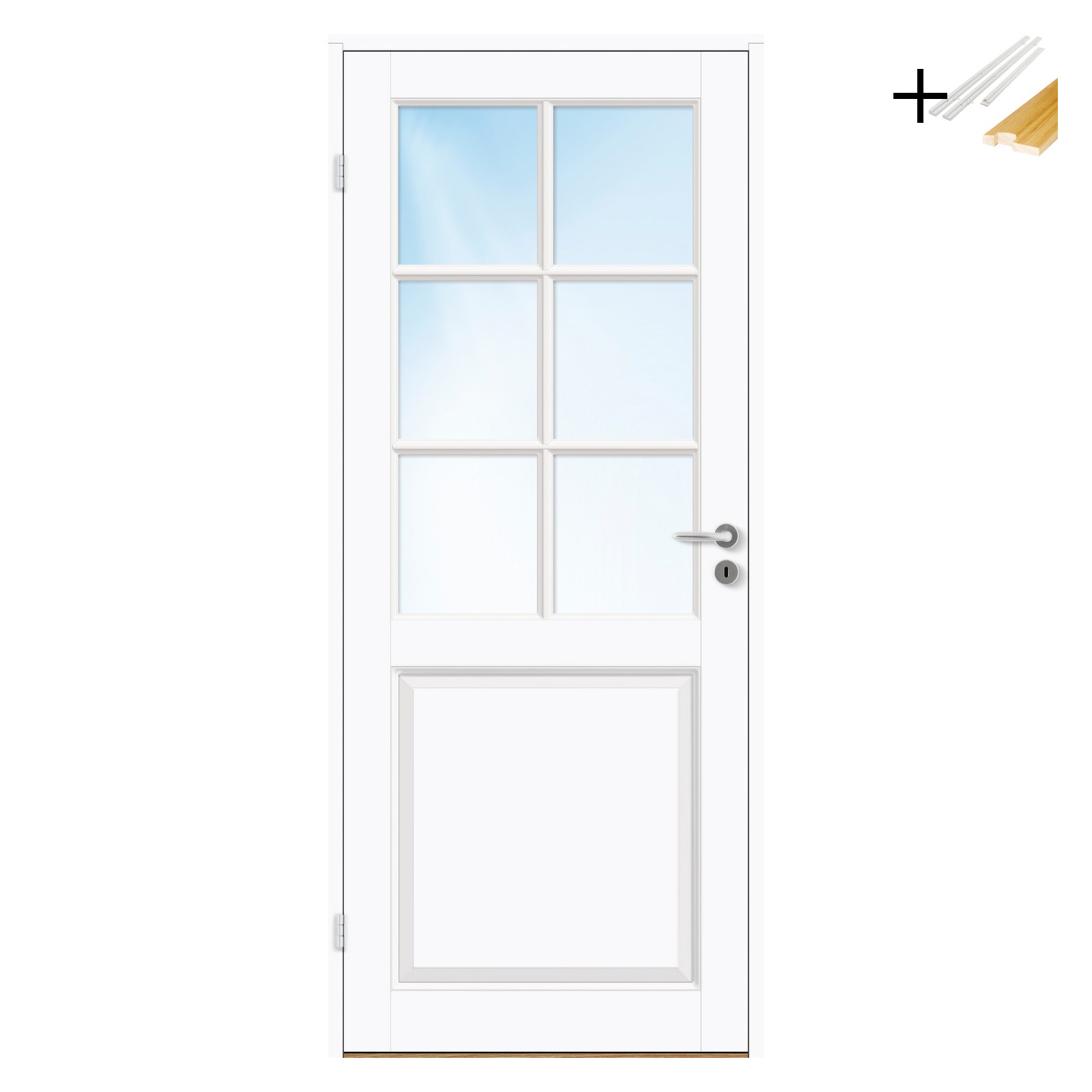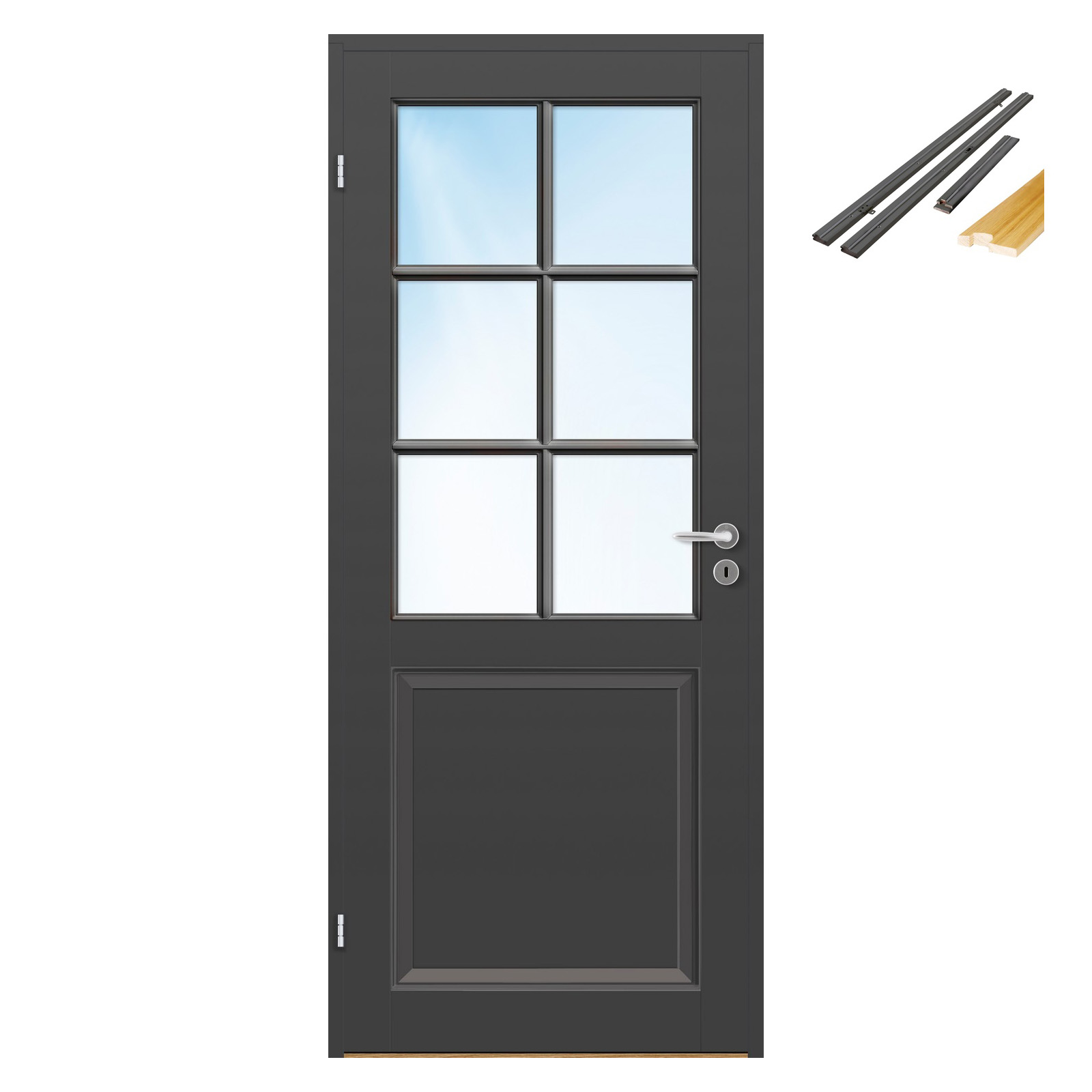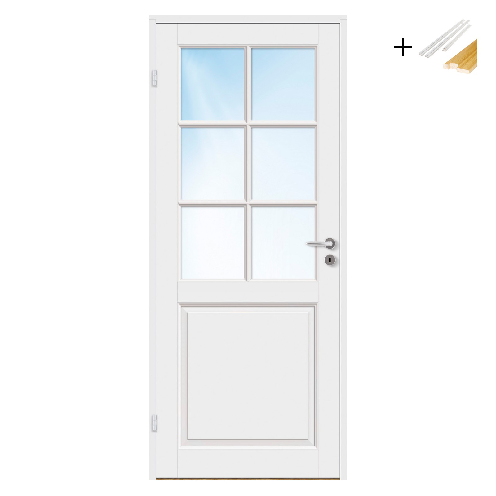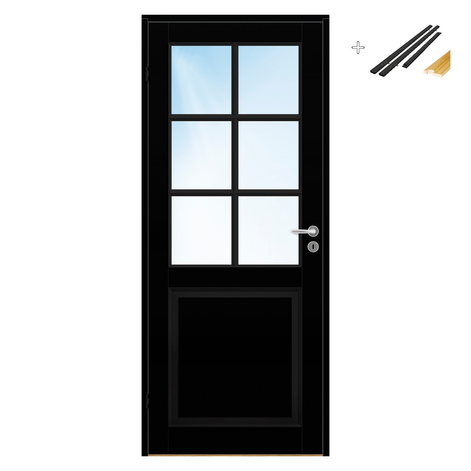 Innerdør Bygg1 Thomas HW Klarglass er en massiv fyllingsdør i klassisk design med glasspart med 2x3 utenpåliggende sprosser og et speil i nedkant.