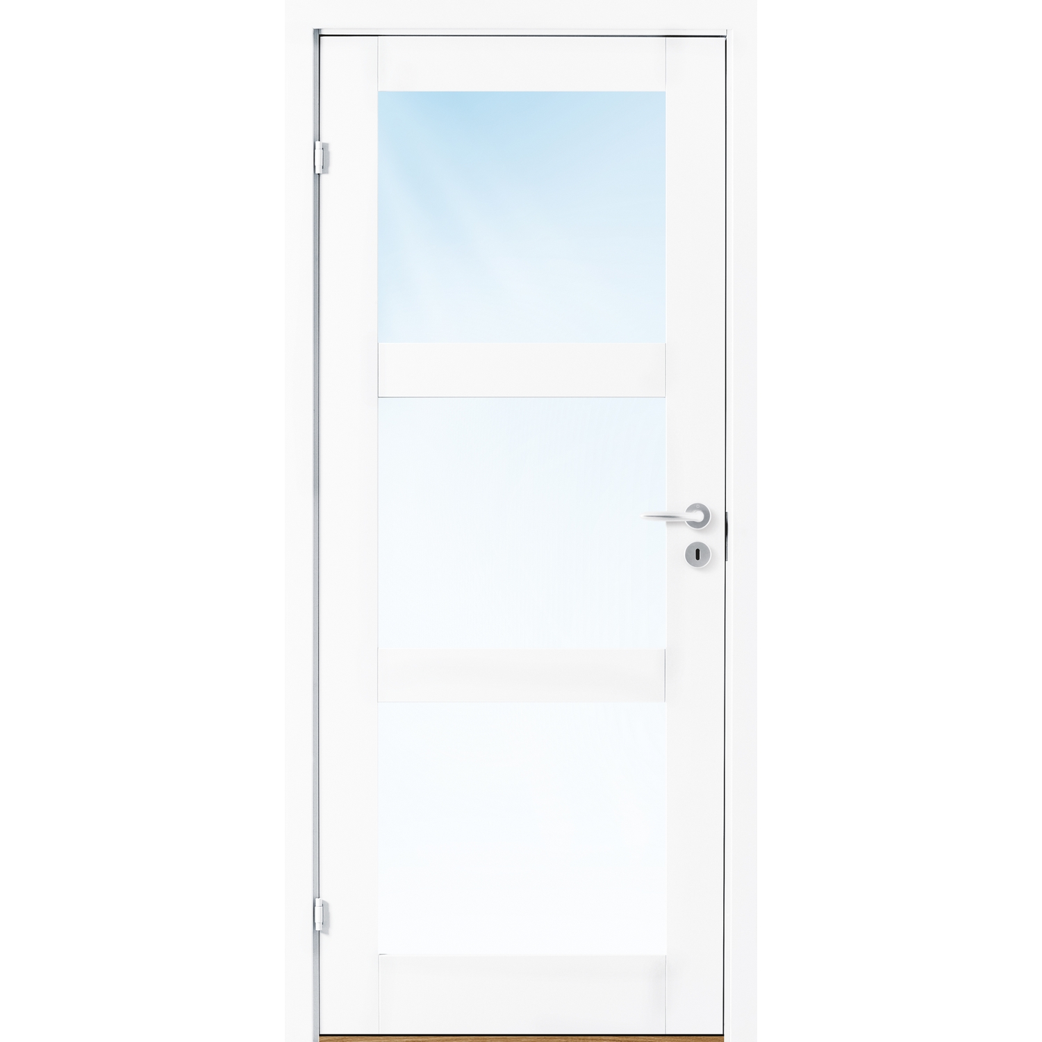 Innerdør Bygg1 Stil 3 Klarglass er en moderne dør med 3 store glassfelt i klarglass.