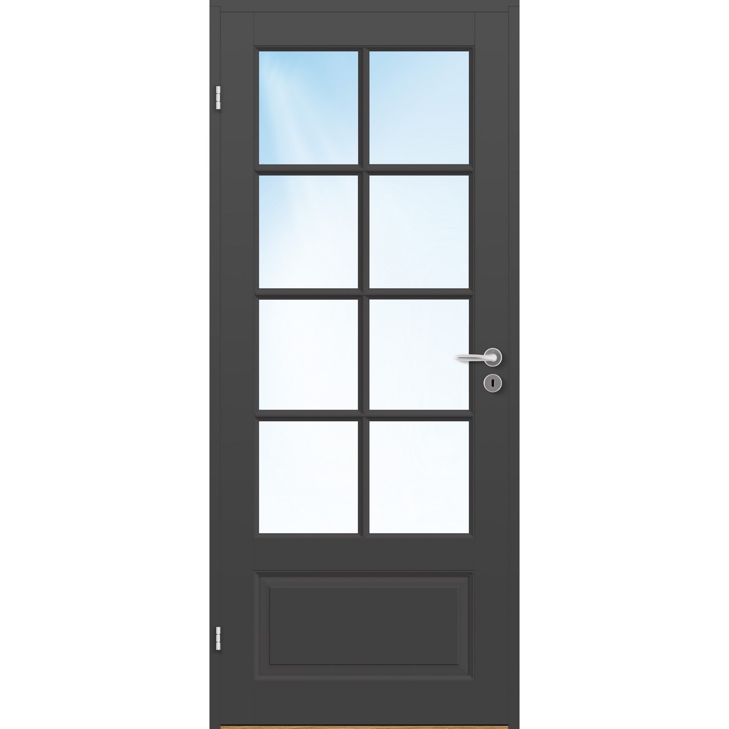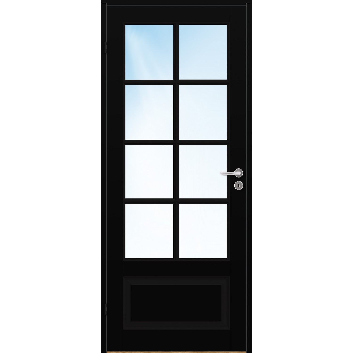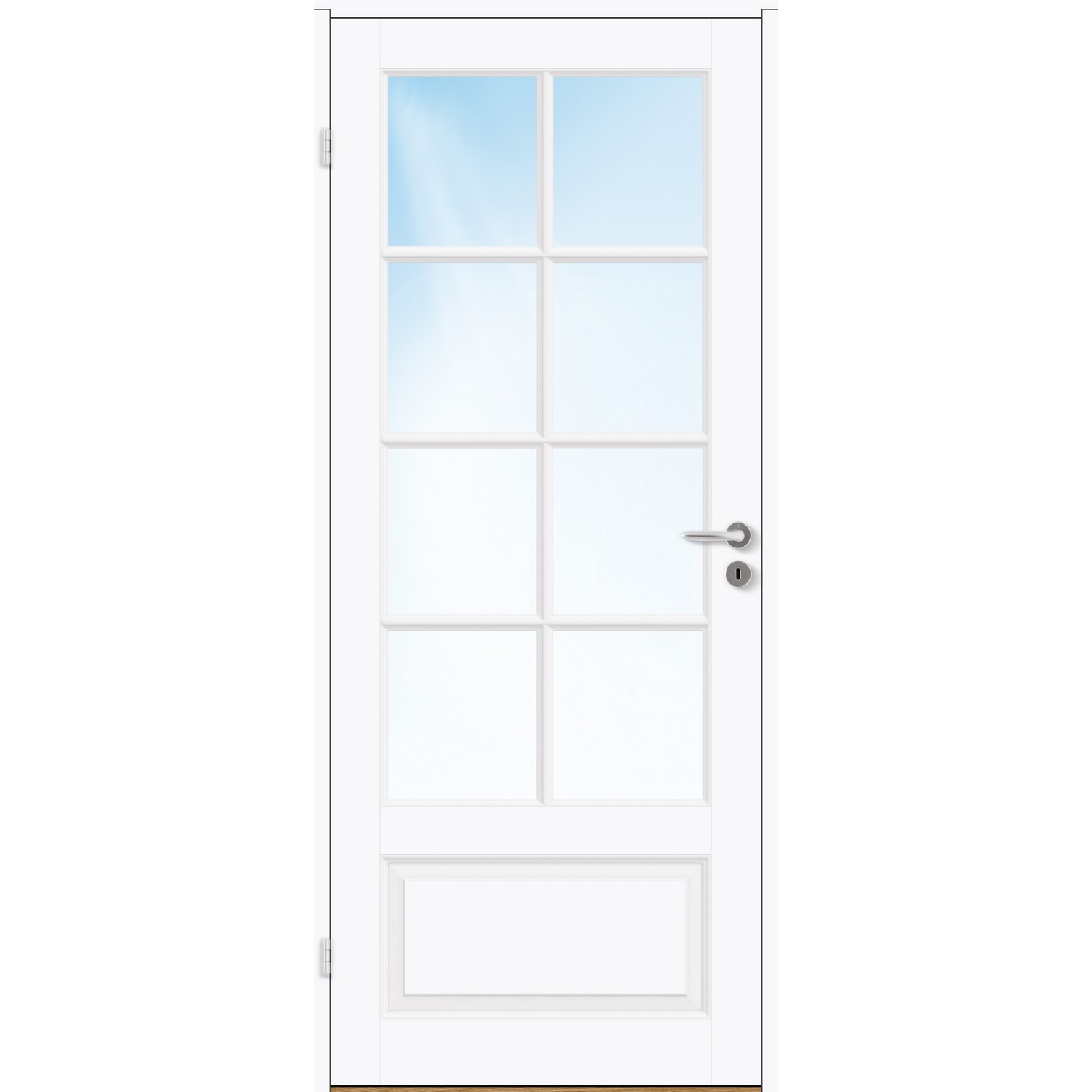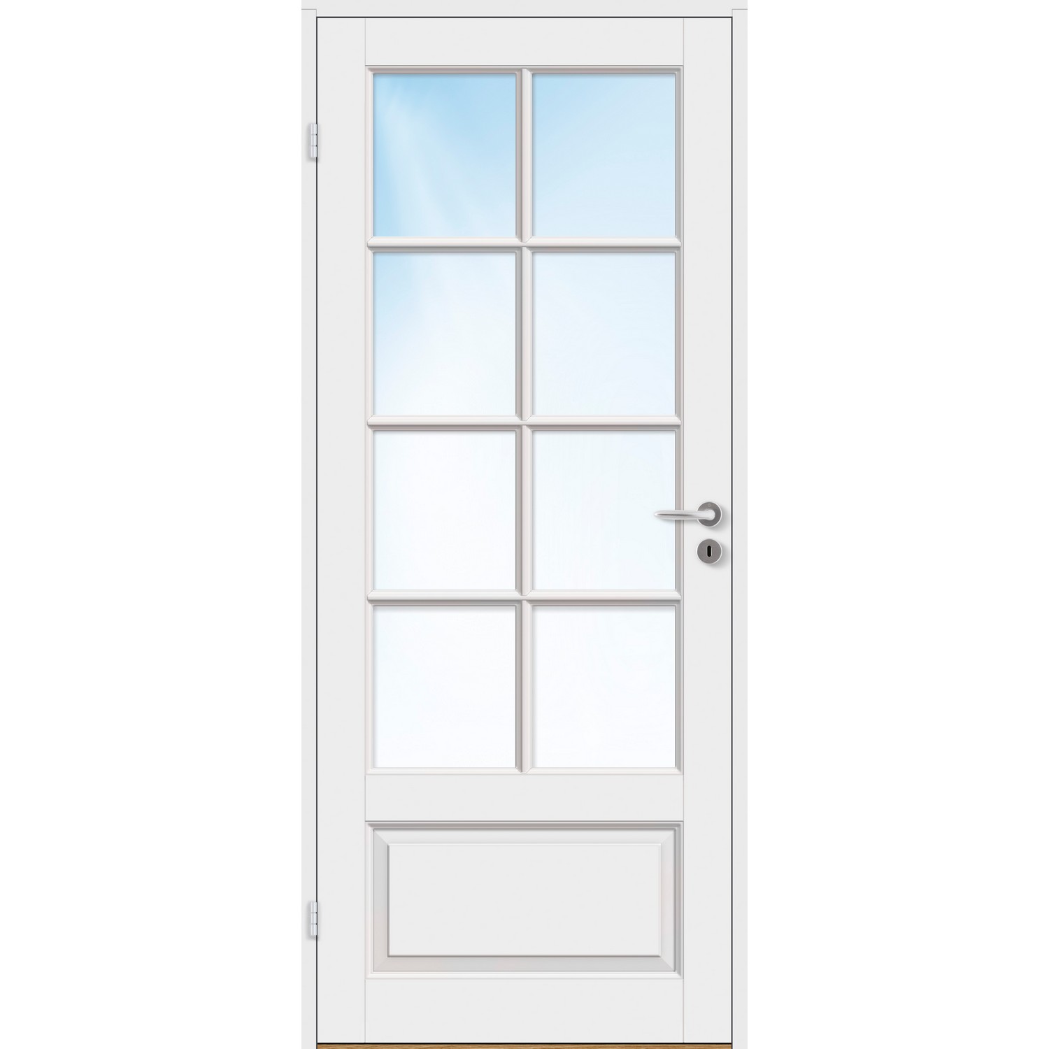 Innerdør Bygg1 Thomas FW Klarglass er en massiv fyllingsdør i klassisk design med glasspart med 2x4 ruter utenpåliggende sprosser og et vertikalt speil i nedkant.