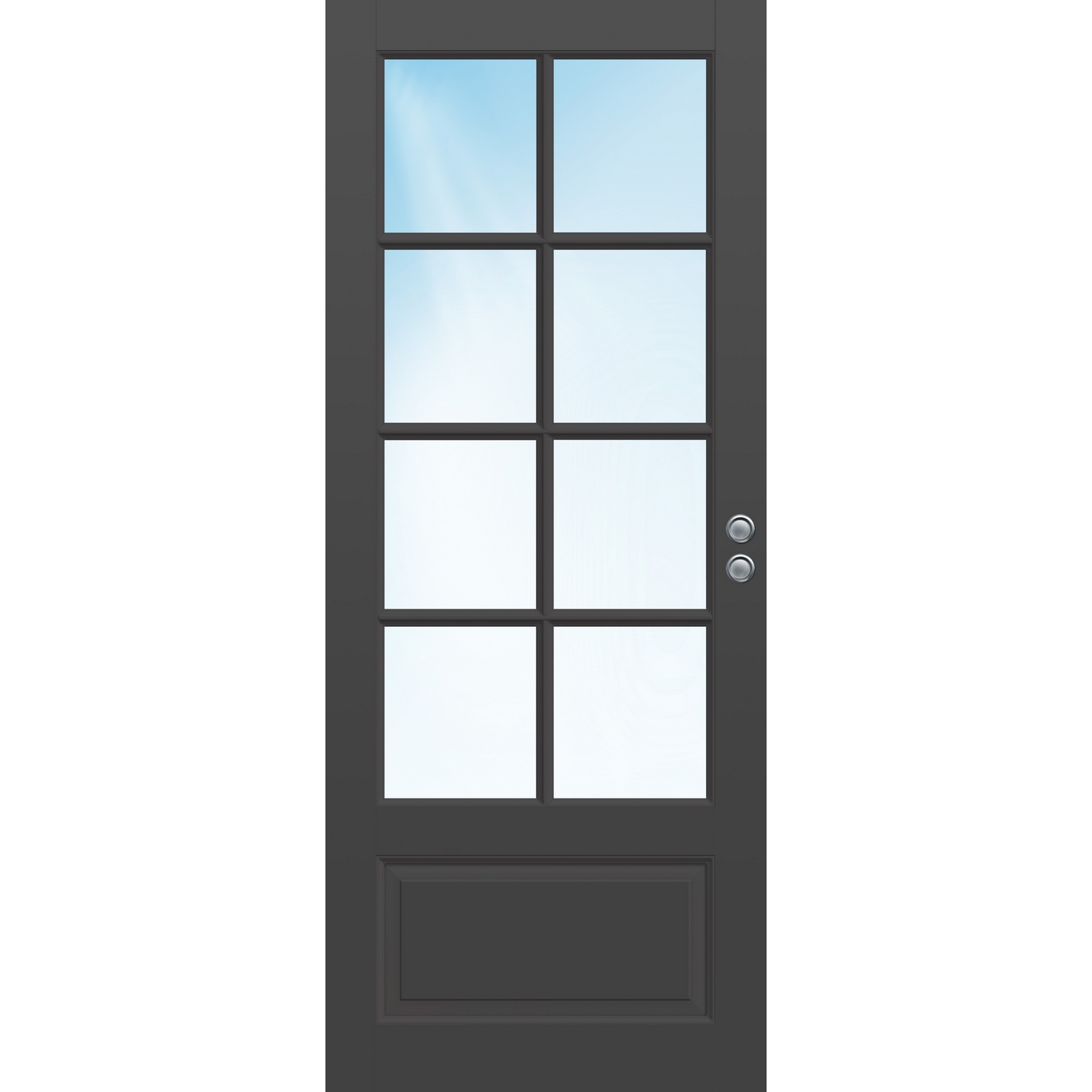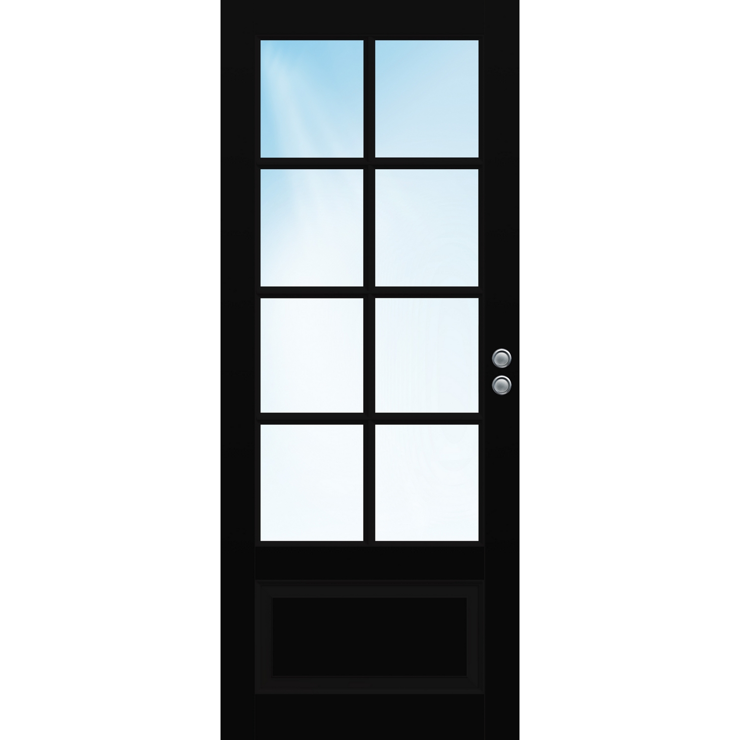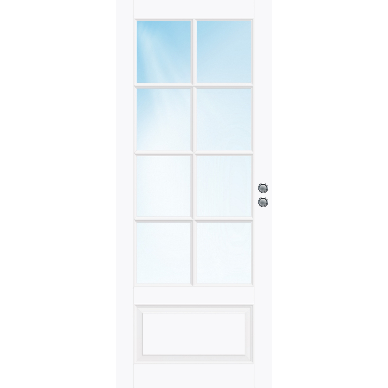 Skyvedør Bygg1 Thomas FW Klarglass er en massiv fyllingsdør i klassisk design med glasspart med 2x4 ruter utenpåliggende sprosser og et vertikalt speil i nedkant.