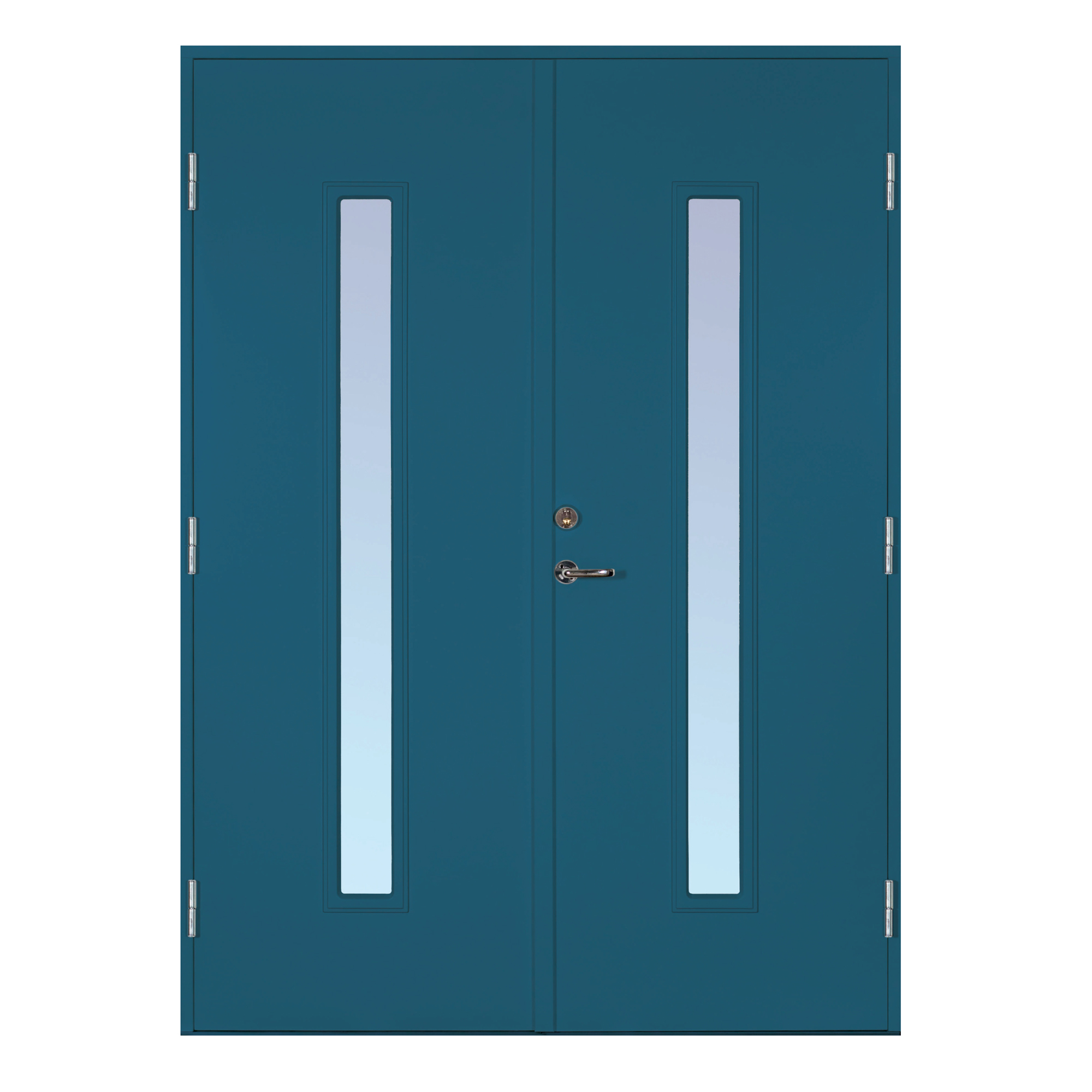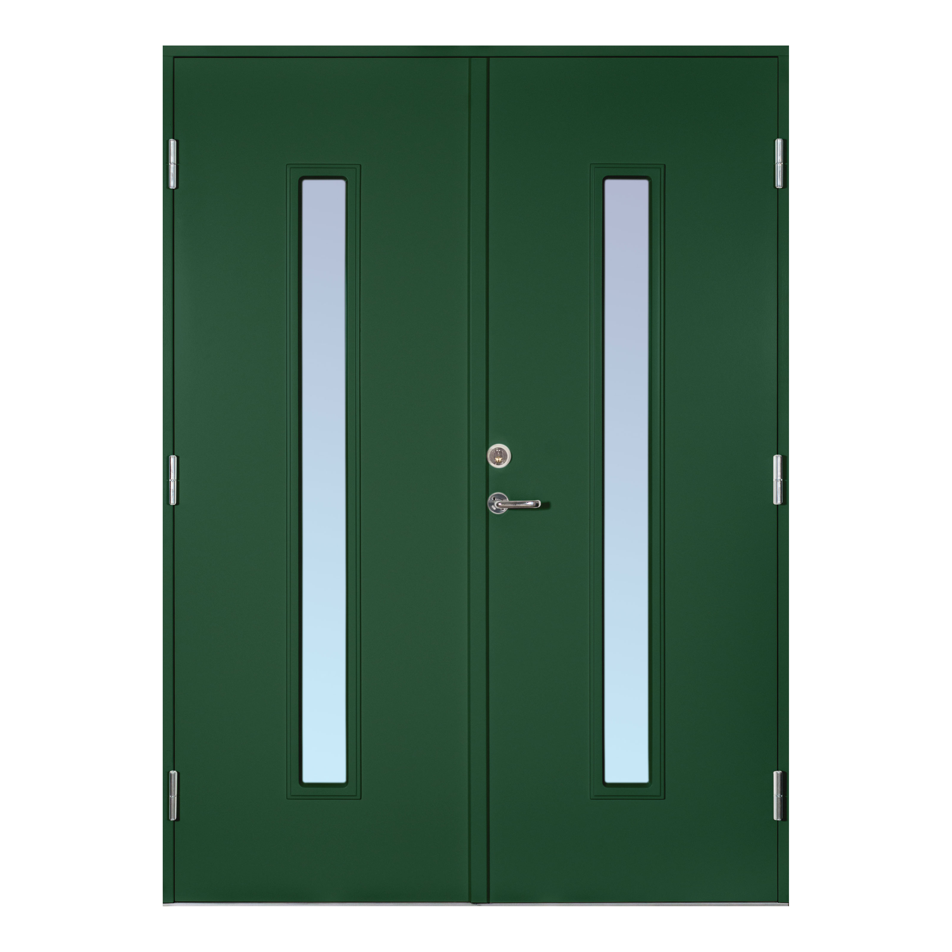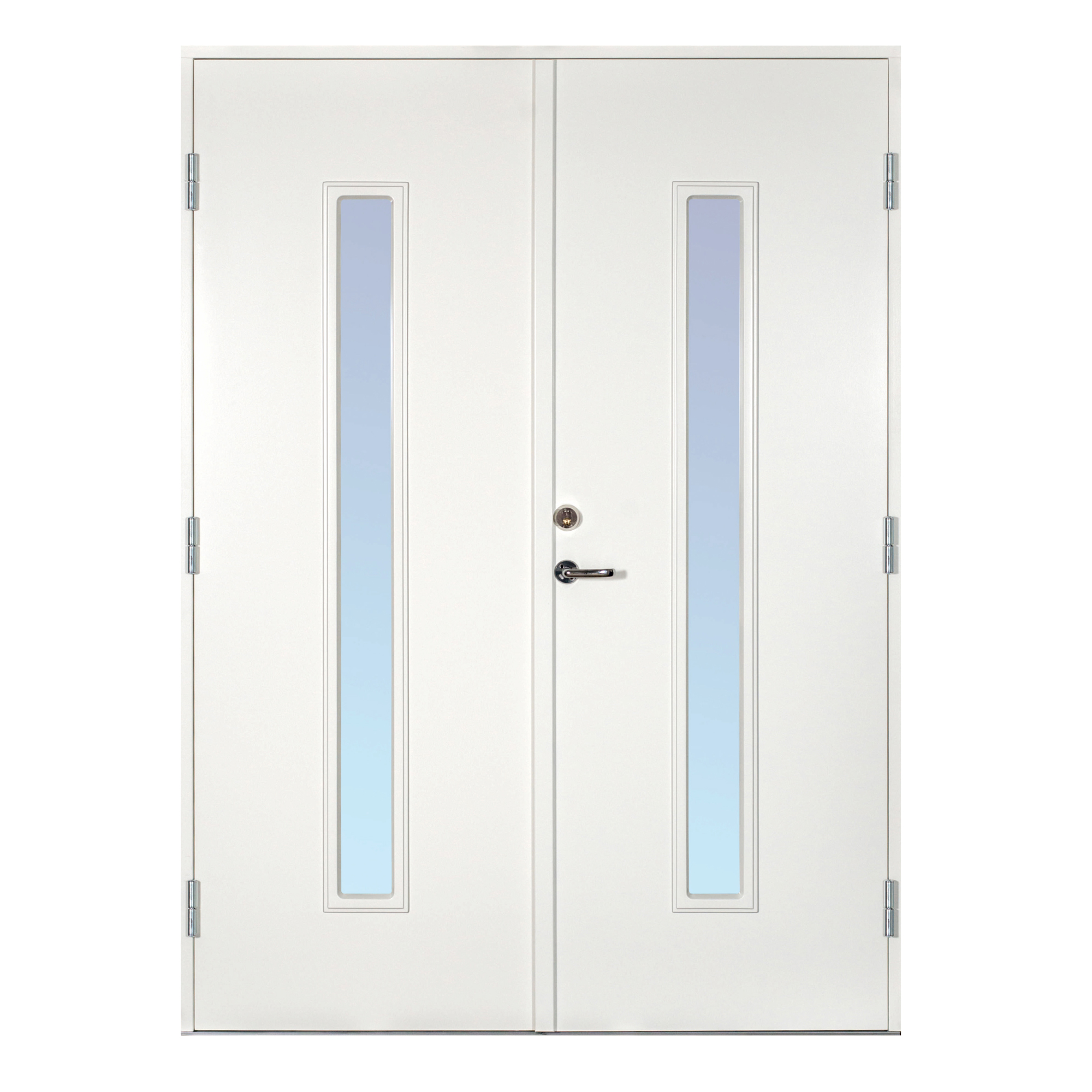 Scandidoor Torp dobbeltdør er en komplett og sikker dobbeldør. Karmen er 42x105 mm, laget av kvistren, fingerskjøtet furu med 4 monterte Adjufixhylser i hver langside. Komplett monteringssett er inkludert. Dørene er utstyrt med 3 justerbare hengsler med kraftige bakkanter, sikkerhetslås Dorma DL 9192 med borebeskyttelse, samt justerbart sluttstykke. Den faste døren har to skyvebolter. Dørbladene med glatt innside er 64 mm tykke og har 55 mm isolasjon, to aluminiumsplater og monterte tetningslister. Lavprofilterskelen er laget av eik med integrert aluminiumsskinne. Glasset er klart eller alternativt frostet termoglass (4+20AR+4 mm), energispareglass. Dobbeltdøren leveres i tre pakker, en med karmen og to med dørbladene.