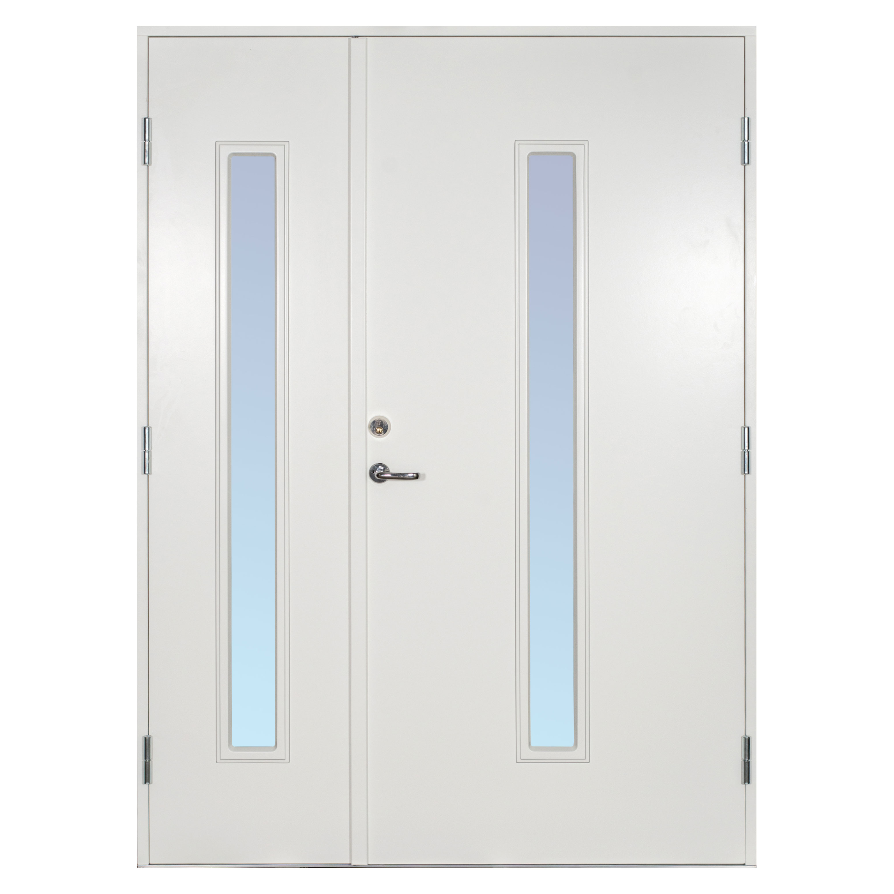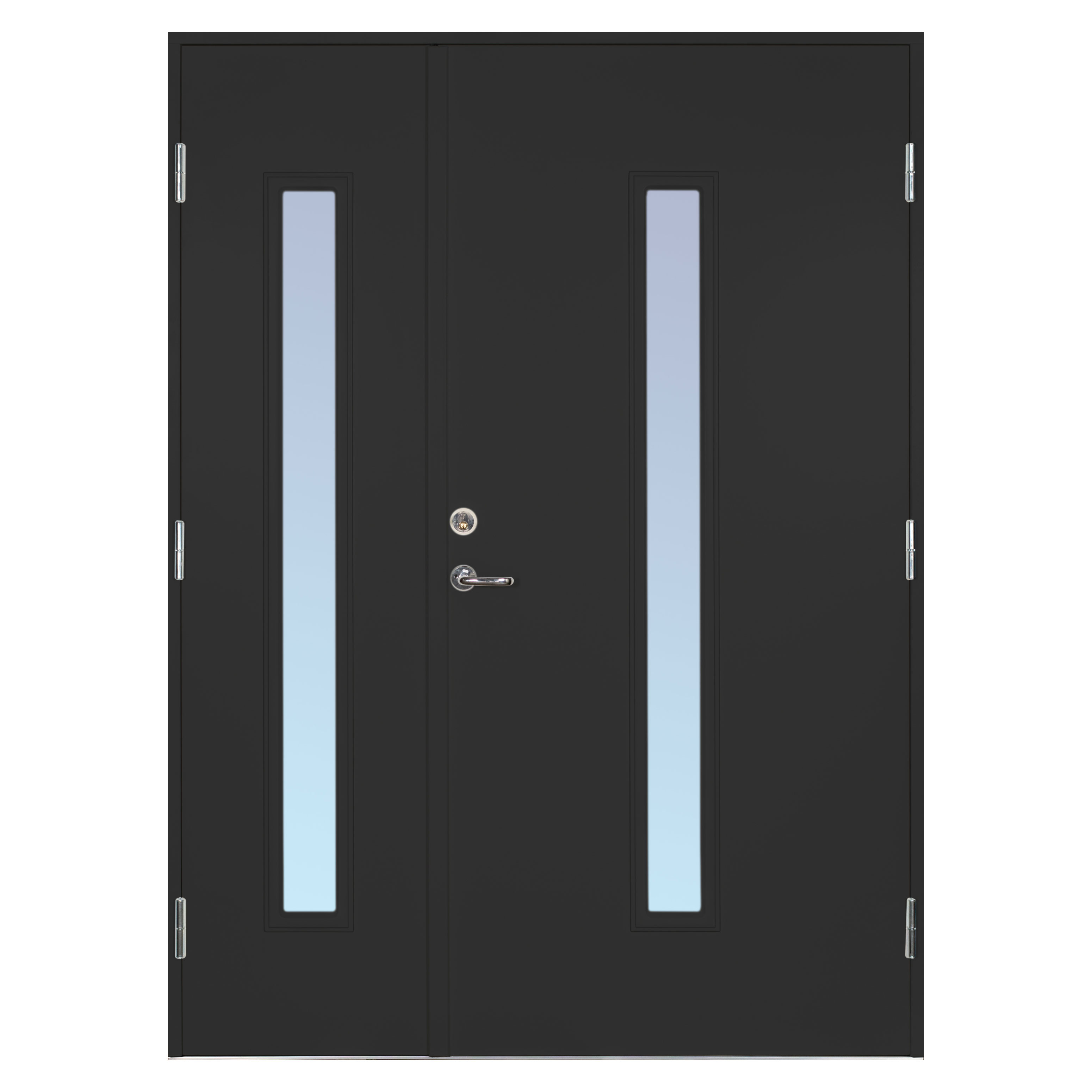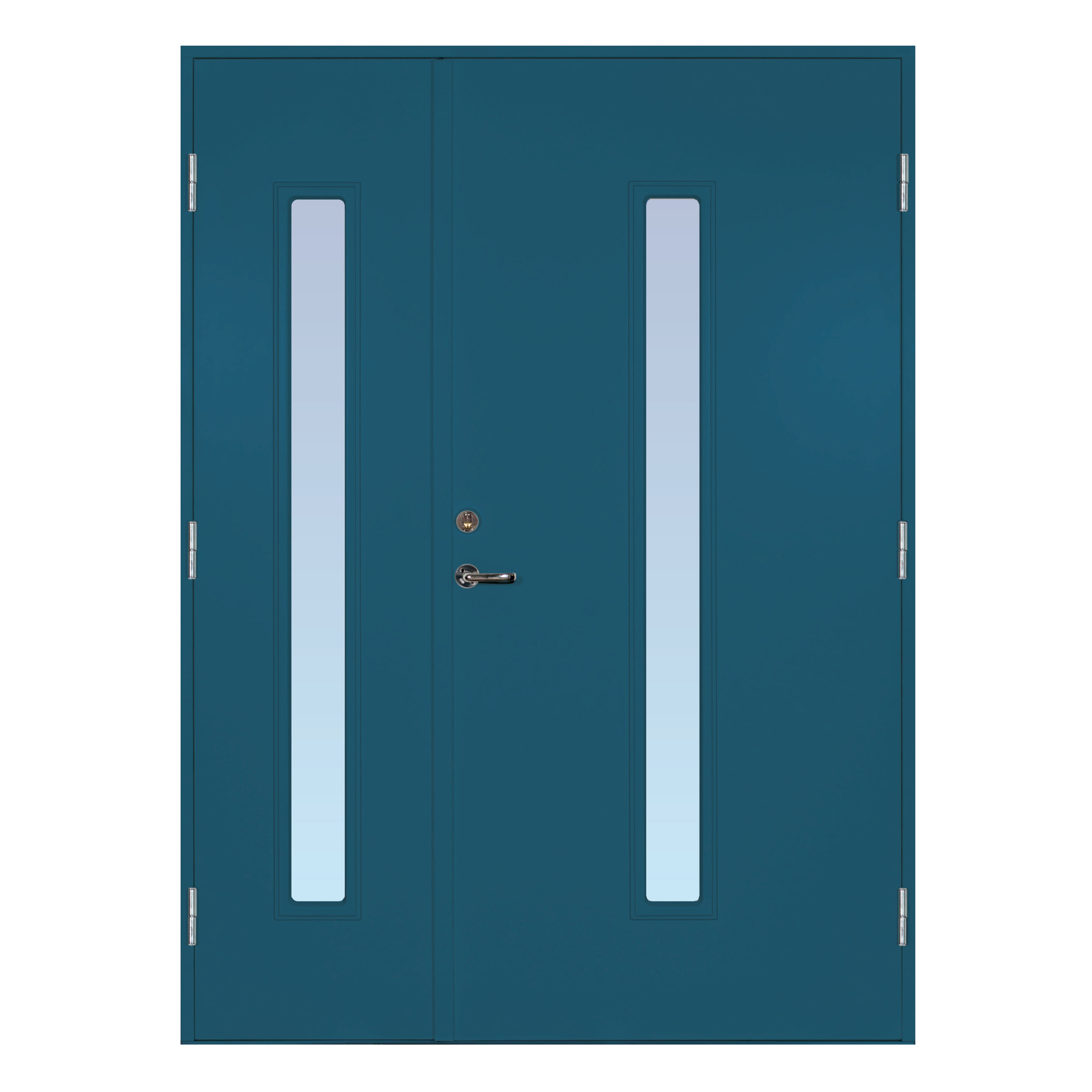 Dørbladene med glatt innside er 64 mm tykke og har 55 mm isolasjon, to aluminiumsplater og monterte tetningslister. Lavprofilterskelen er laget av eik med integrert aluminiumskinne. Glasset er klart eller alternativt frostet termoglass (4+20AR+4 mm), energispareglass. Dobbeltdøren leveres i tre pakker, en med karmen og to med dørbladene.