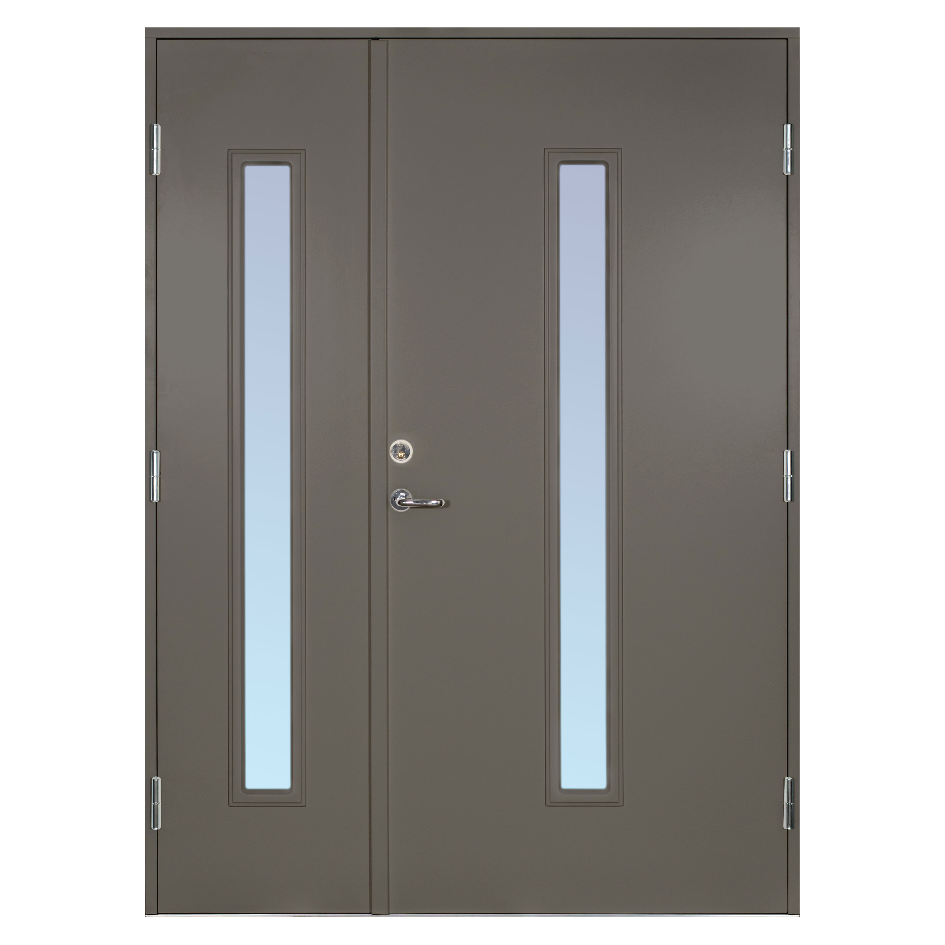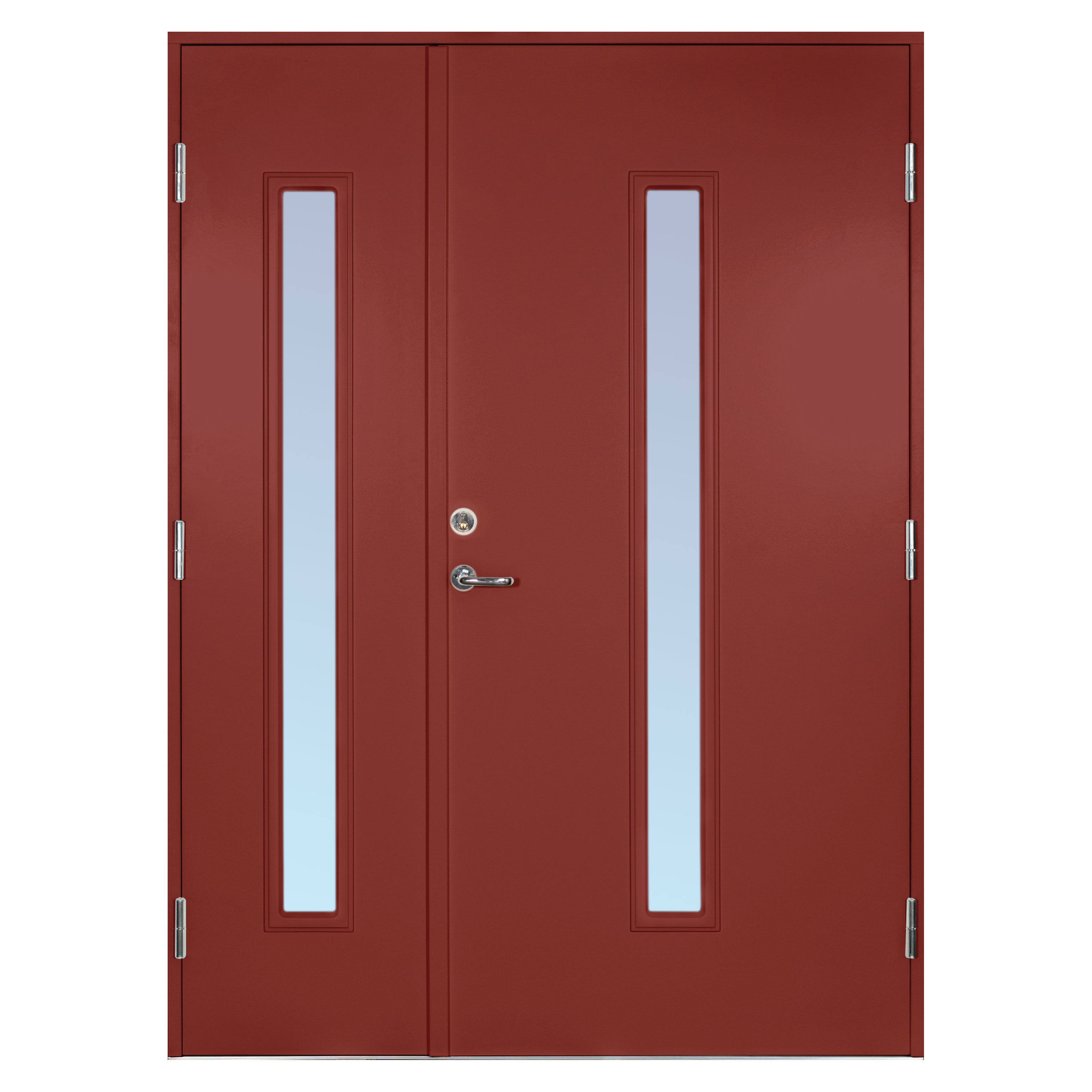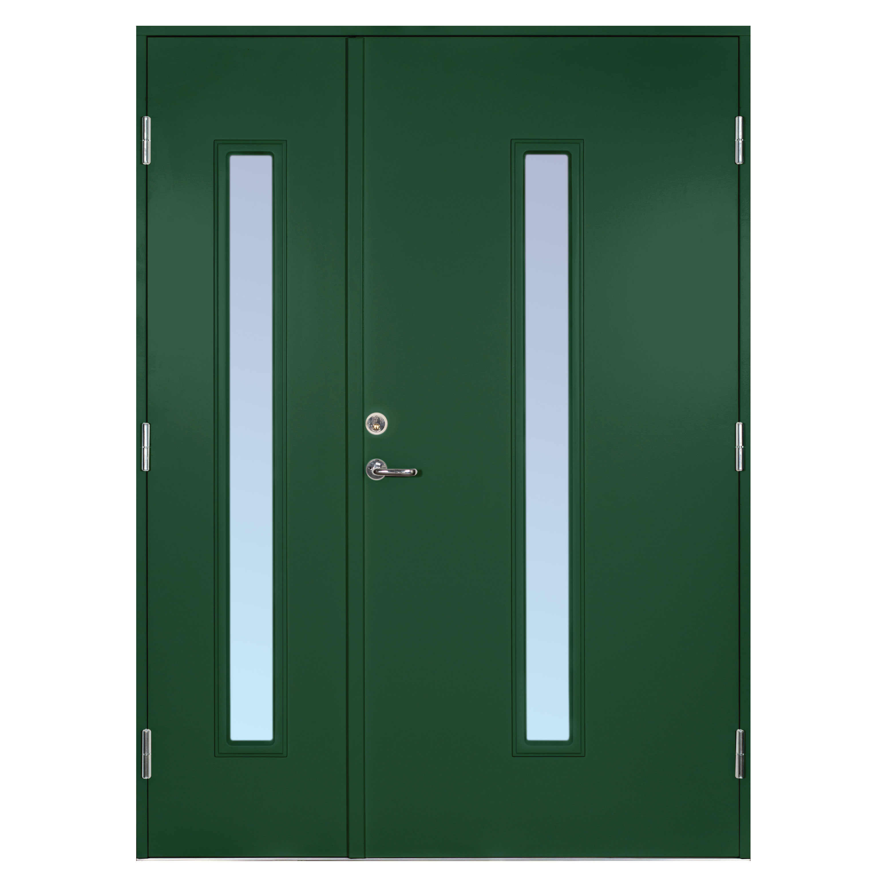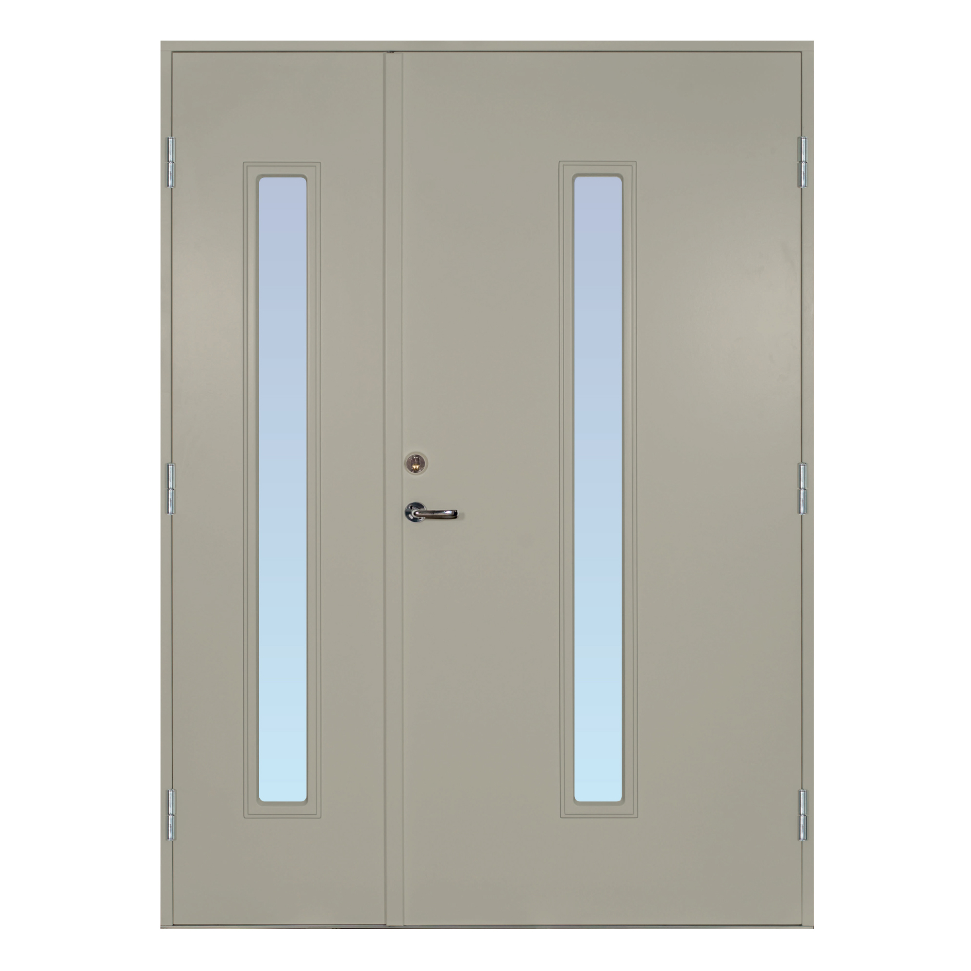 Dørbladene med glatt innside er 64 mm tykke og har 55 mm isolasjon, to aluminiumsplater og monterte tetningslister. Lavprofilterskelen er laget av eik med integrert aluminiumskinne. Glasset er klart eller alternativt frostet termoglass (4+20AR+4 mm), energispareglass. Dobbeltdøren leveres i tre pakker, en med karmen og to med dørbladene.