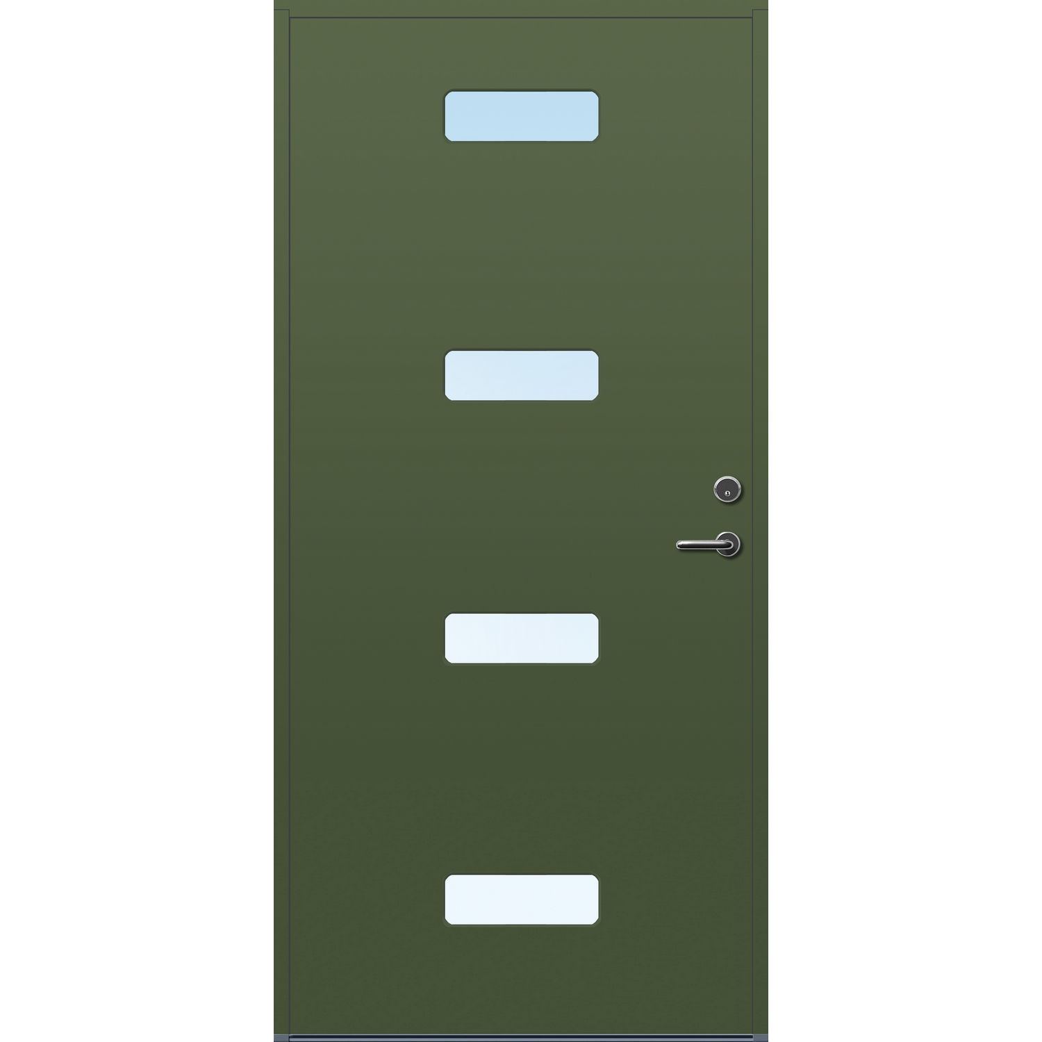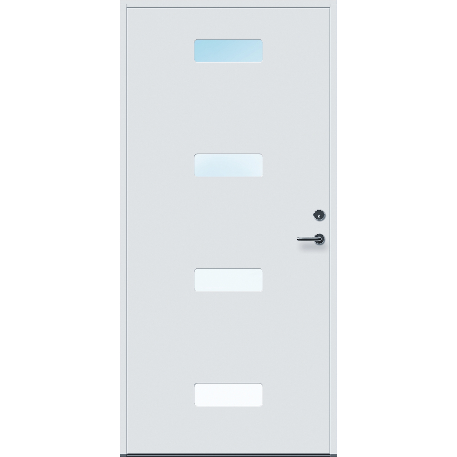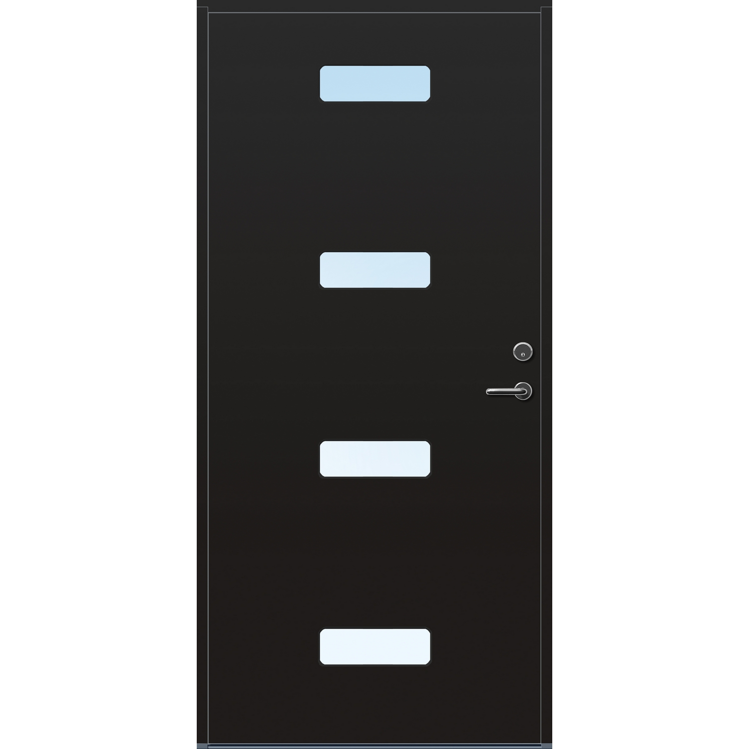 Minimalistiske ytterdører med stilrent uttrykk, uten glasslister på utsiden og med skjulte hengsler. Dørene har en bladkonstruksjon av furu ramtre med 54 mm freonfritt isolasjonsmateriale. På begge sider er det limt 0,4 millimeter aluminium og 4 millimeter HDF. Både dør og karm er grunnet med 2 strøk 2-komponent syreherdet grunning og 1 strøk vannbasert toppstrøk. Toppstrøk på andre farger enn hvit er også 2-komponent.