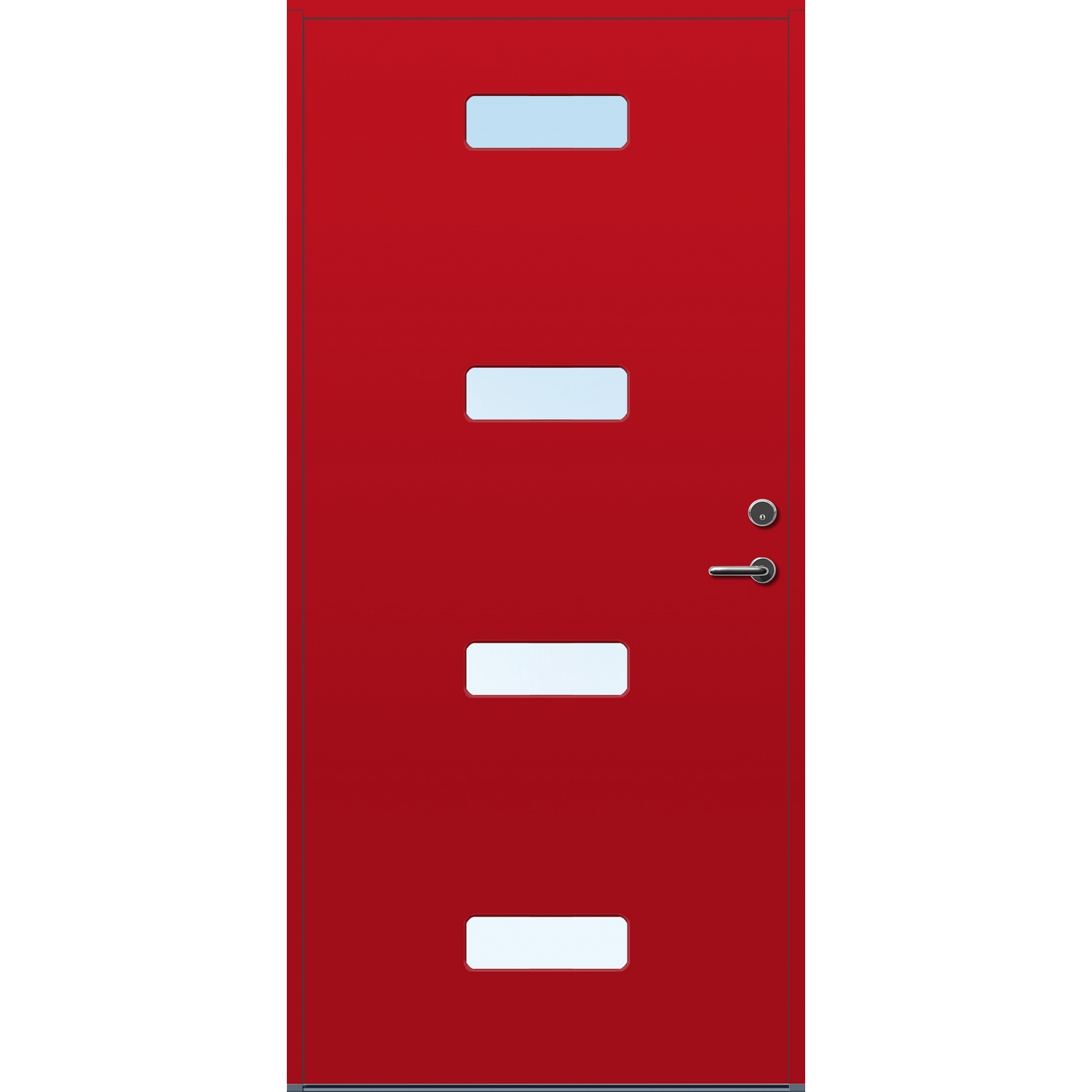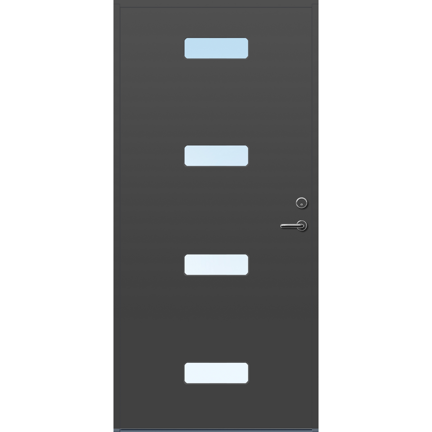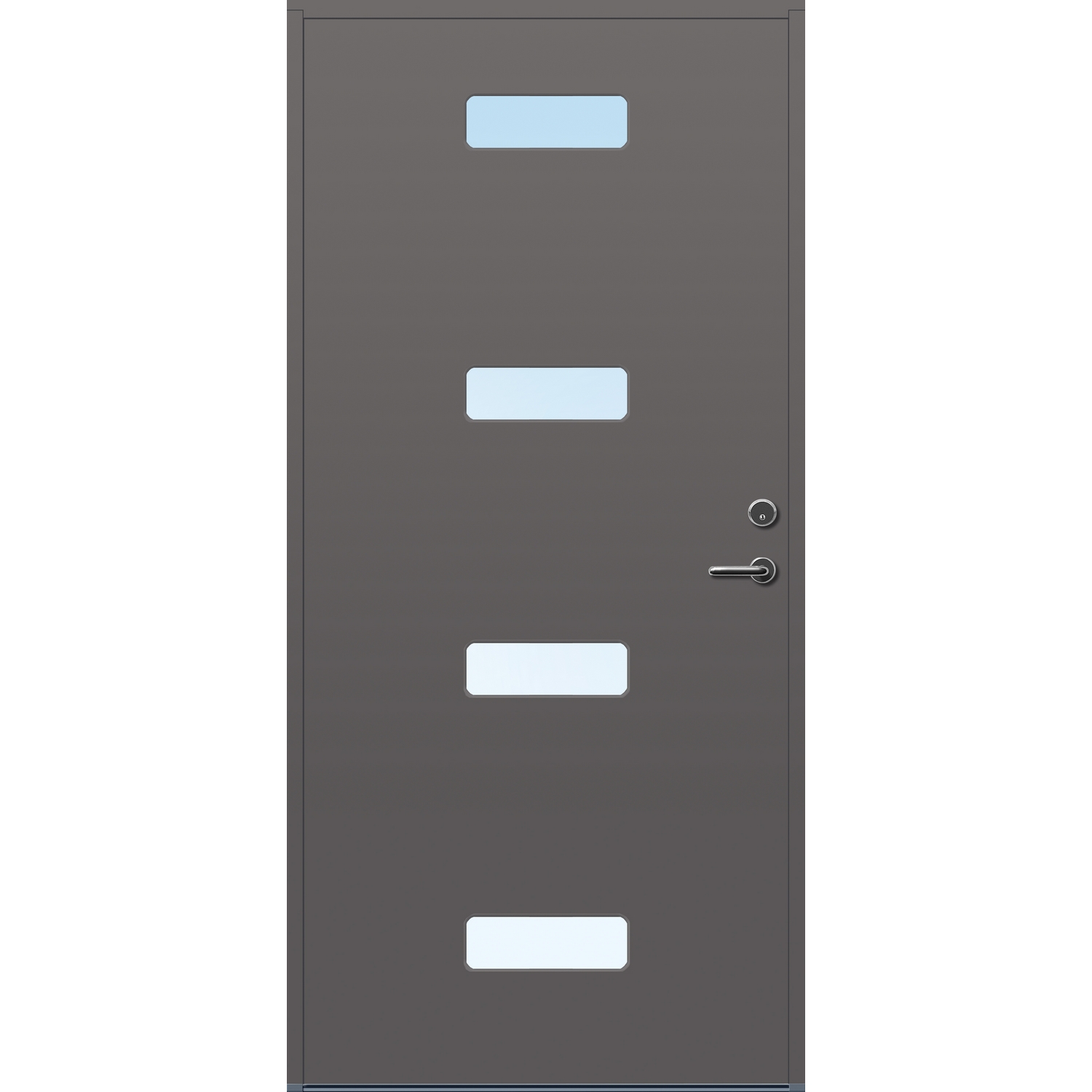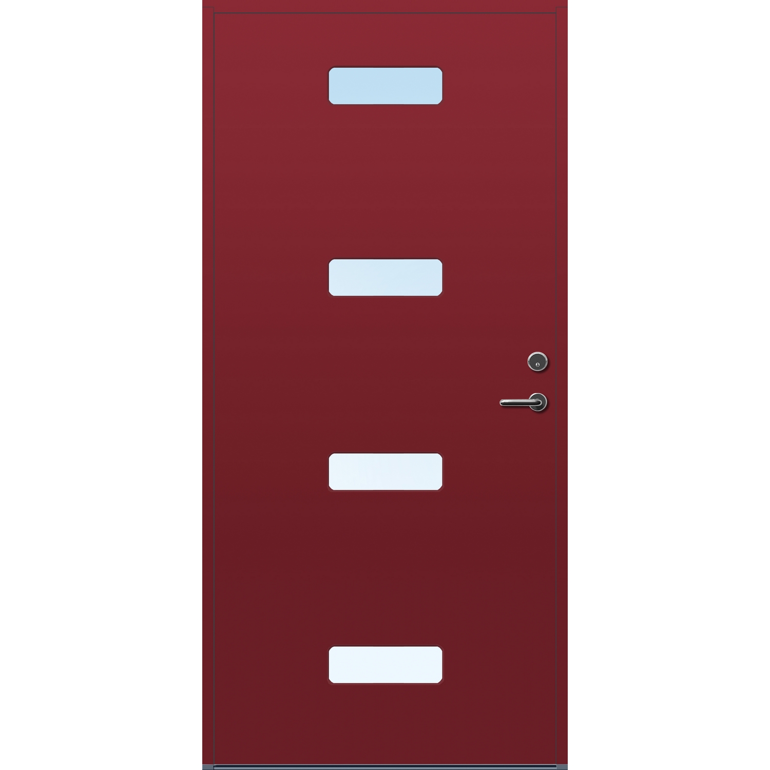 Minimalistiske ytterdører med stilrent uttrykk, uten glasslister på utsiden og med skjulte hengsler. Dørene har en bladkonstruksjon av furu ramtre med 54 mm freonfritt isolasjonsmateriale. På begge sider er det limt 0,4 millimeter aluminium og 4 millimeter HDF. Både dør og karm er grunnet med 2 strøk 2-komponent syreherdet grunning og 1 strøk vannbasert toppstrøk. Toppstrøk på andre farger enn hvit er også 2-komponent.