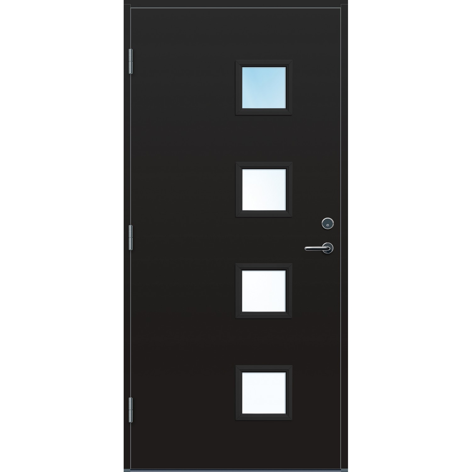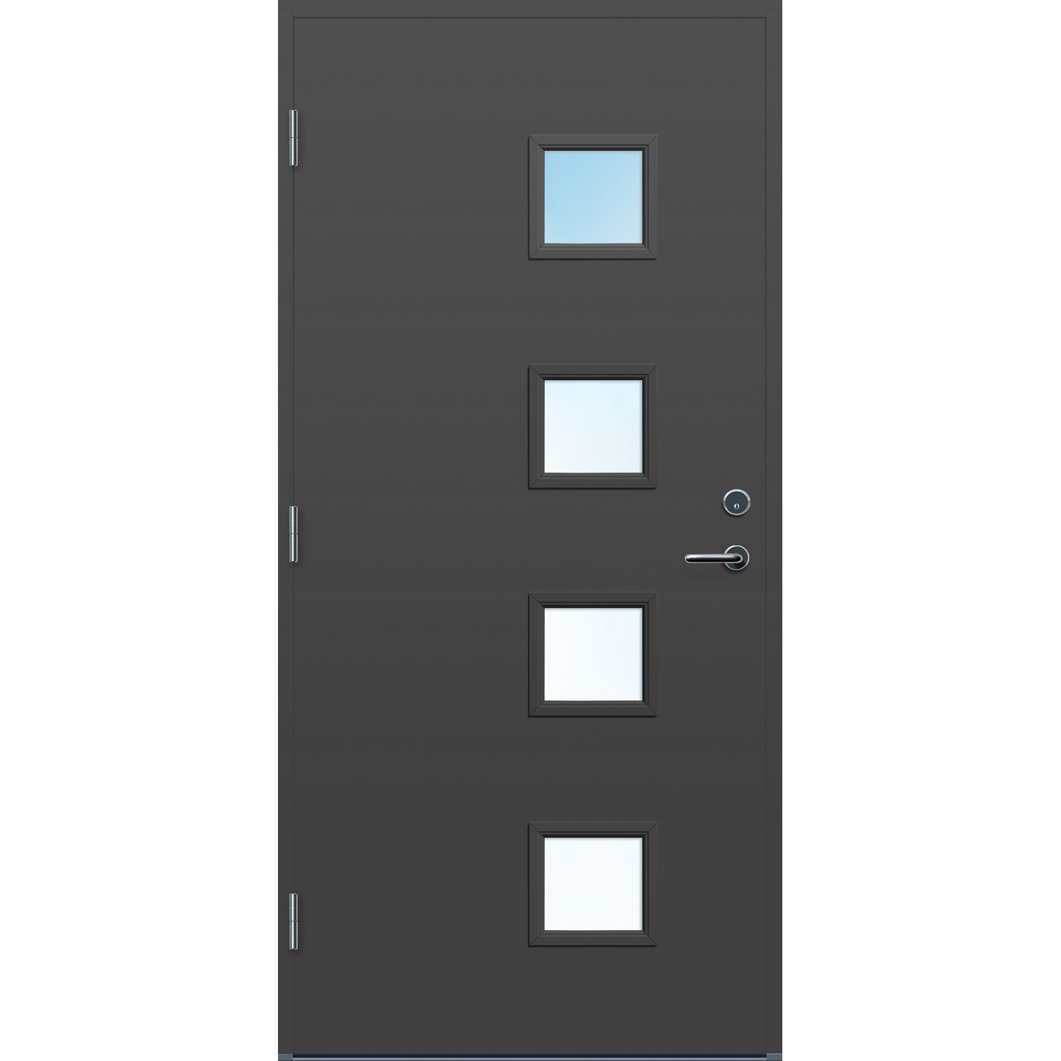 Ytterdør med thermoisolasjon i moderne design med god isolasjonsevne og høy kvalitet. Klart 3-lags glass er standard, men lages også med cotswold, crepi, klart eller sota glass. Laminert ramtre av furu og overflate av HDF. Kvistfri furukarm 44x105mm med HC terskel av eik og alu. FG låssystem og tre hengsler. Standard farge er NCS S 0502-Y, andre farger på bestilling. U-verdi 0,78