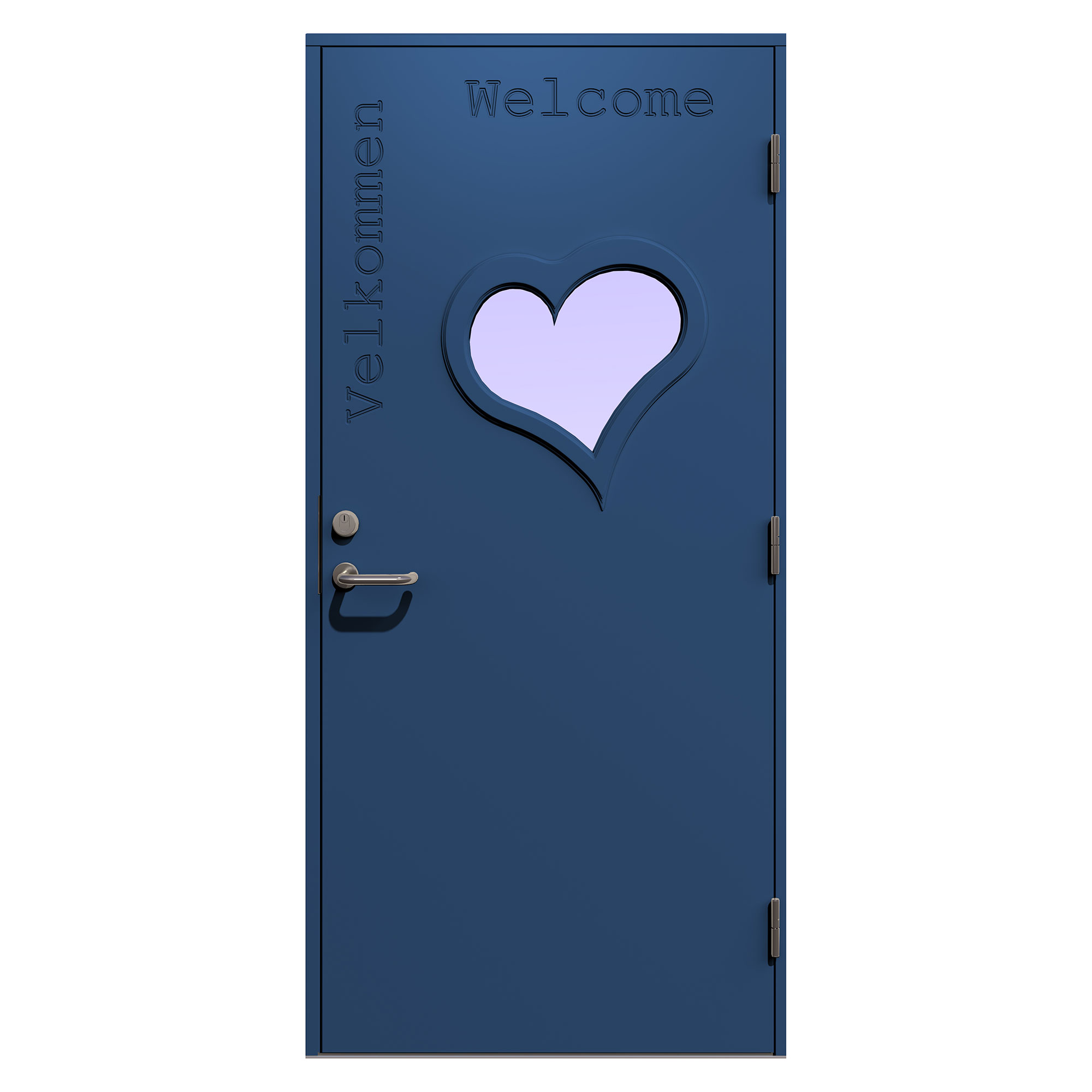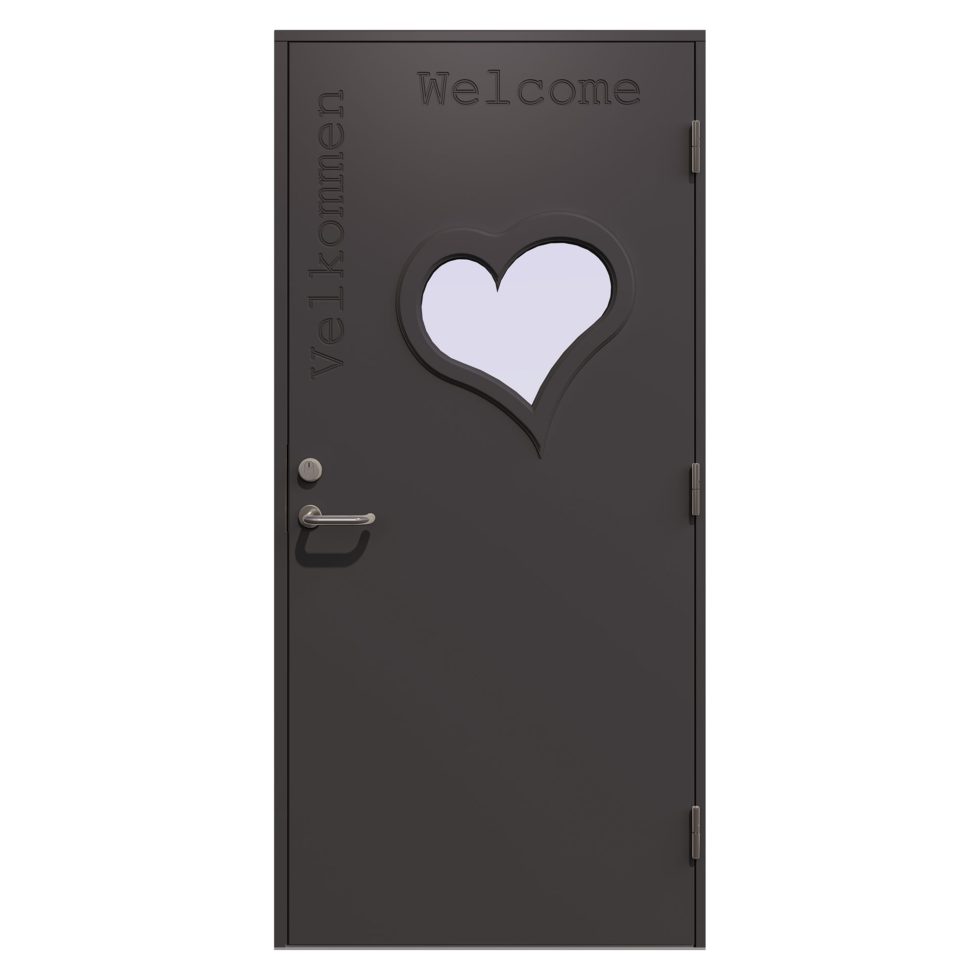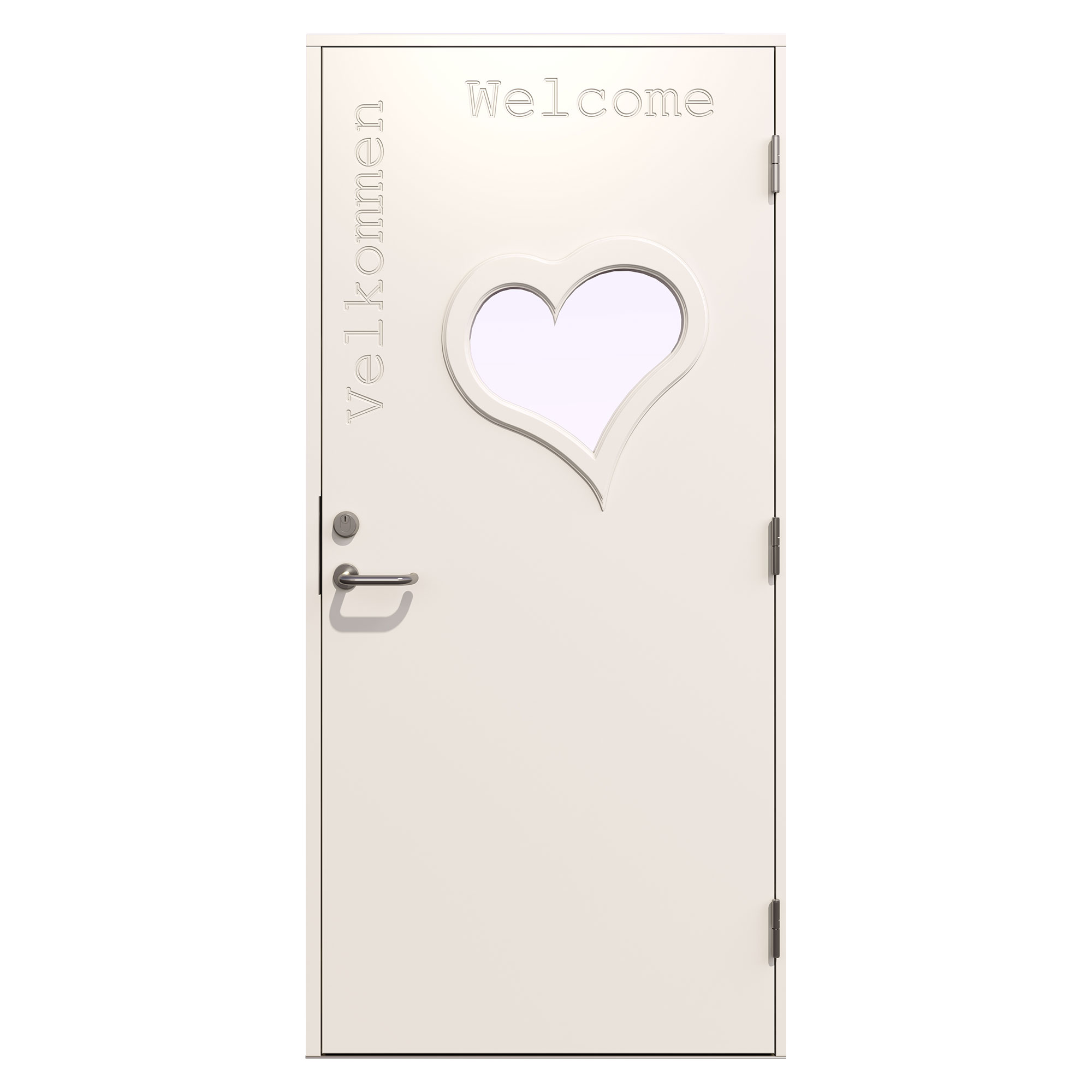 Ytterdør Afrodite fra Gilje er en unik dør med et hjerteformet vindu i klart glass og sporfrest tekst Velkommen/Welcome. Kontakt vår kundeservice hvis døren ønskes levert uten tekst eller med en annen tekst.