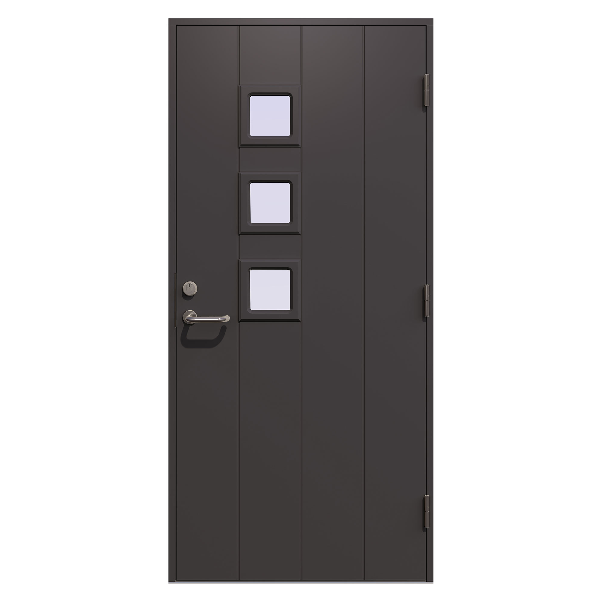 Ytterdør Continental fra Gilje er en moderne dør med vertikale spor og 3 firkantede vinduer i klarglass.