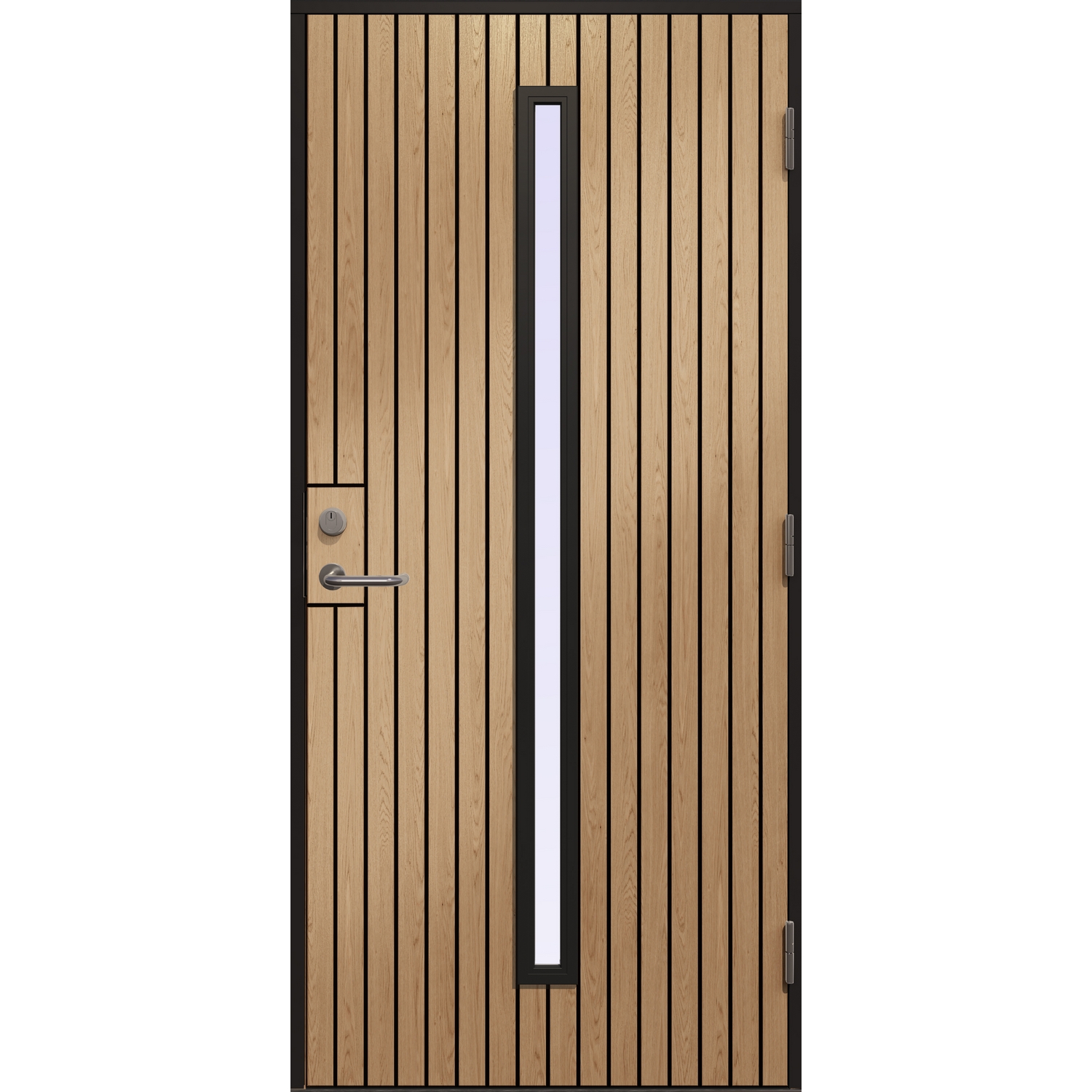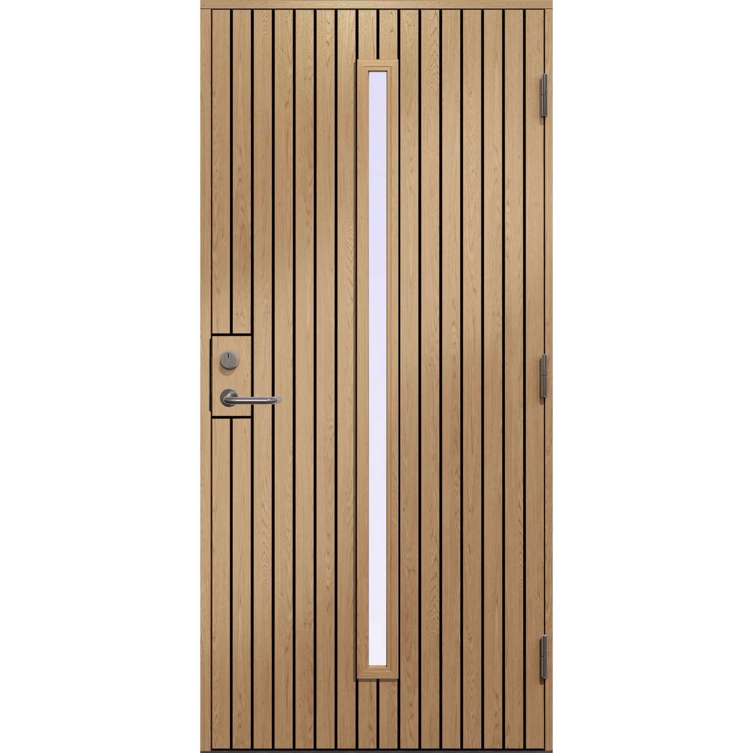 Ytterdør Trym Klarglass fra Gilje med et smalt glassparti. Døren er oppgadert med overflate av dekorlaminat F5374 Elegant Oak, hvor innsiden er slett og utsiden i tillegg har vertikalt sporfrest dekor. Dekorlaminaten gir en svært god beskyttelse mot slitasjer i overflaten. Karm samt ramtre og glasskassett på dørblad kan velges som sortmalt furu eller heltre eik