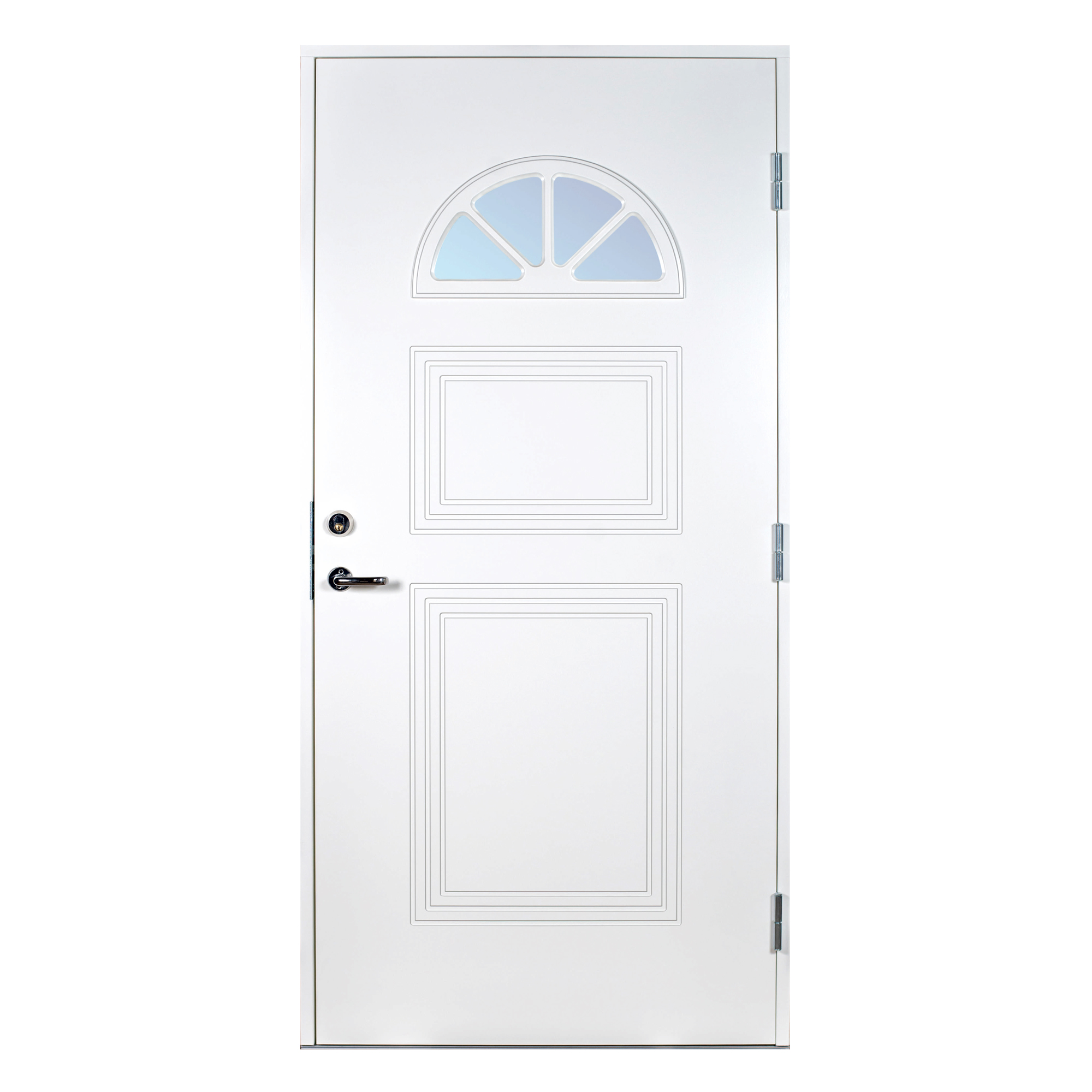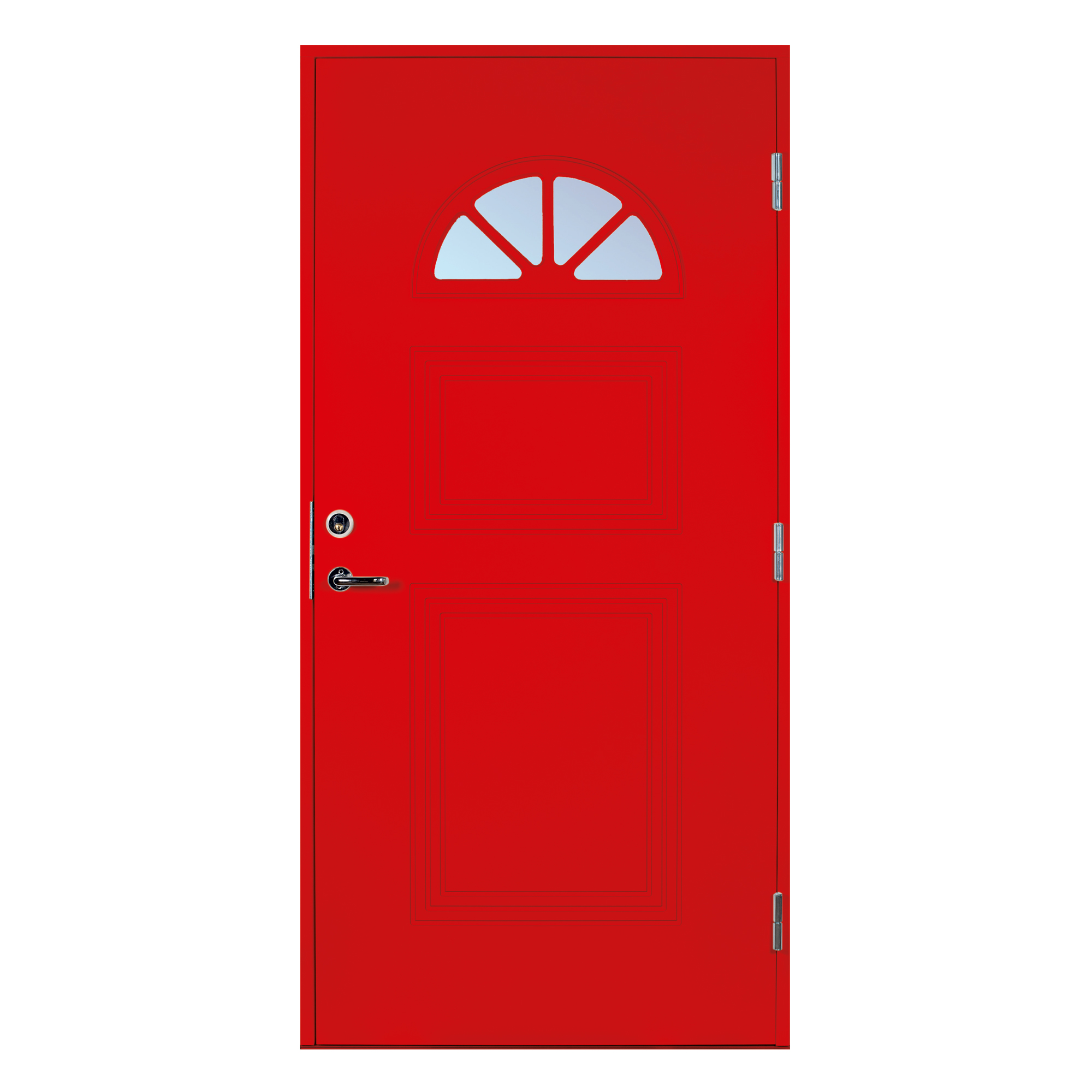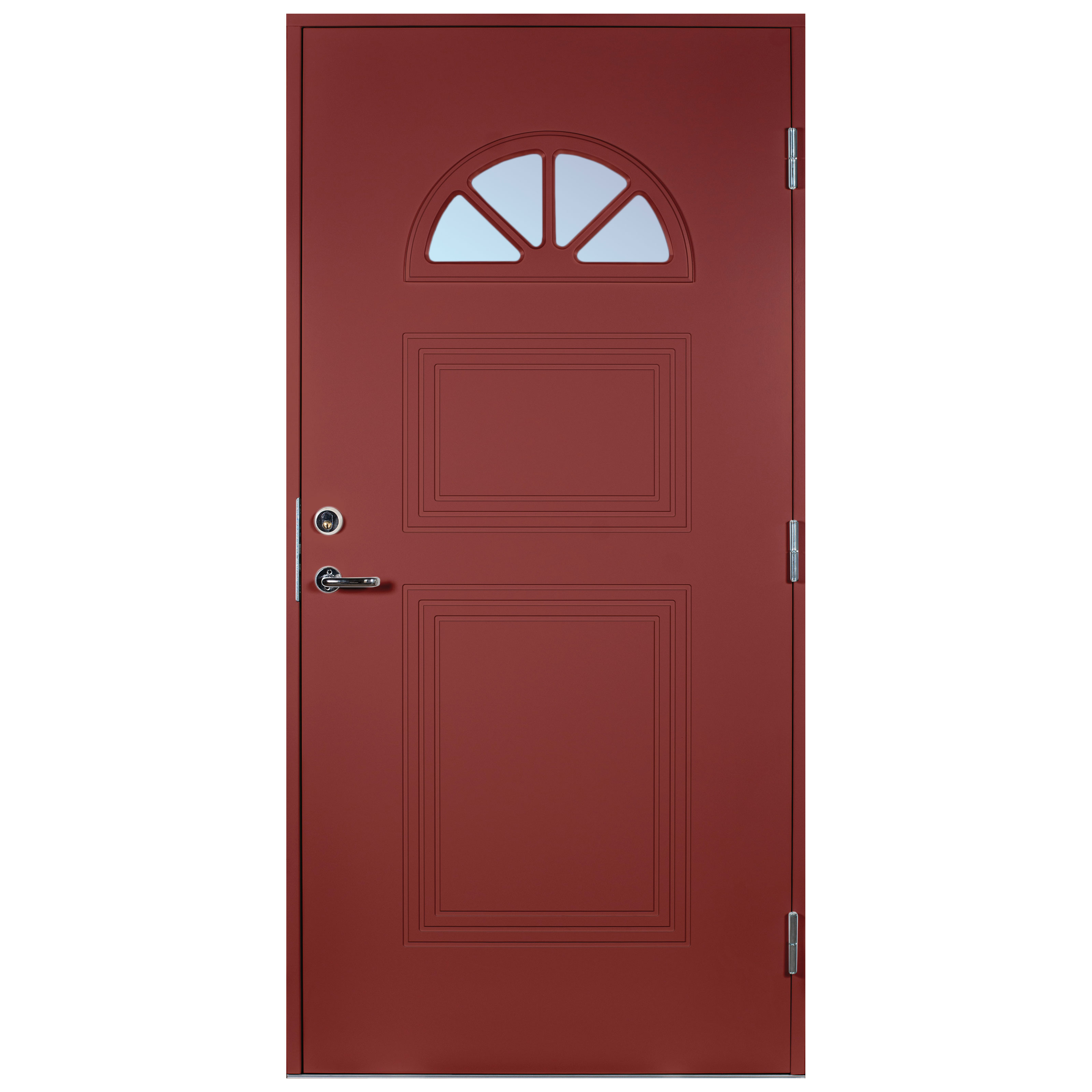 ScandiDoor Forsa er en komplett og sikker ytterdør. Karmen er 42x105 mm, laget av kvistren, fingerskjøtet furu med 4 forhåndsmonterte Adjufix-hylser på hver langside. Et komplett monteringssett er inkludert i leveransen, så det er ikke nødvendig å kjøpe noe ekstra for å kunne montere døren riktig. Døren er utstyrt med 3 justerbare hengsler med kraftig bakkantsikring, sikkerhetslås Dorma DL 9192 med borebeskyttelse og justerbart sluttstykke. Dørbladet med glatt innside er 64 mm tykt og har 55 mm isolasjon, to aluminiumsplater og montert tetningsliste. Lavprofil- terskelen er laget av eik med integrert aluminiumsskinne. Glasset er termoglass (4+20AR+4 mm), valgfritt klart eller frostet. U-verdi <1,0. Døren leveres som standard i hvit NCS S 0502-Y. Mot pristillegg kan også følgende fire farger leveres: Rød NCS S 4050-Y90R, Grønn NCS S 6530-G10Y, Grå NCS S 6502-Y og Blå NCS S 6020-R90B. Størrelser 9x20, 9x21 og 10x21. Kun bestillingsvare, leveringstid maks 6 uker.