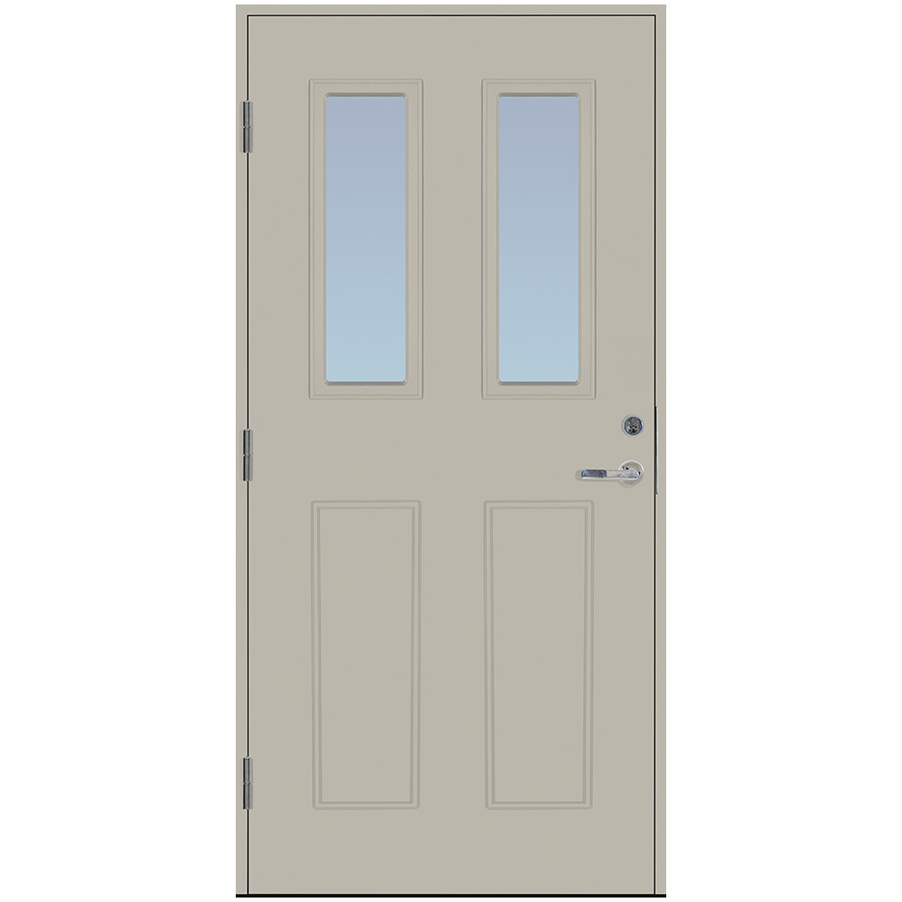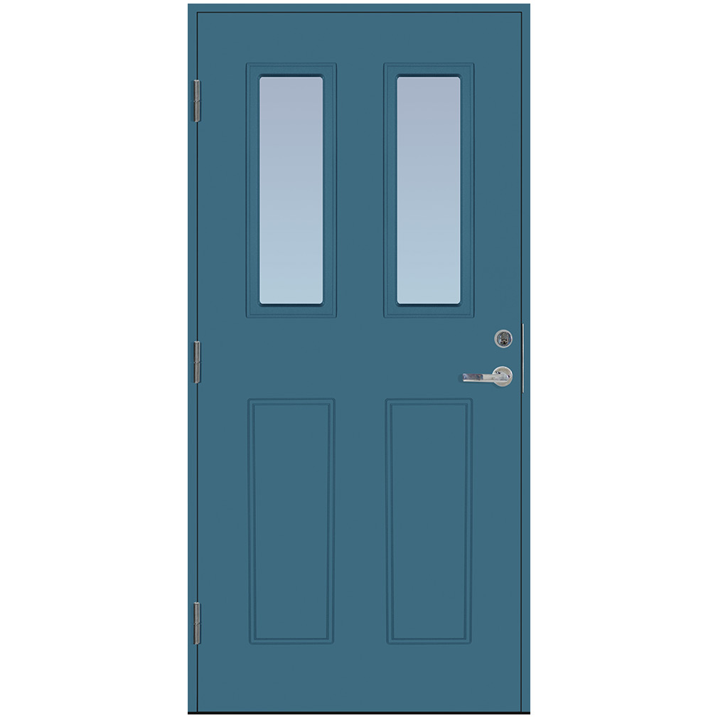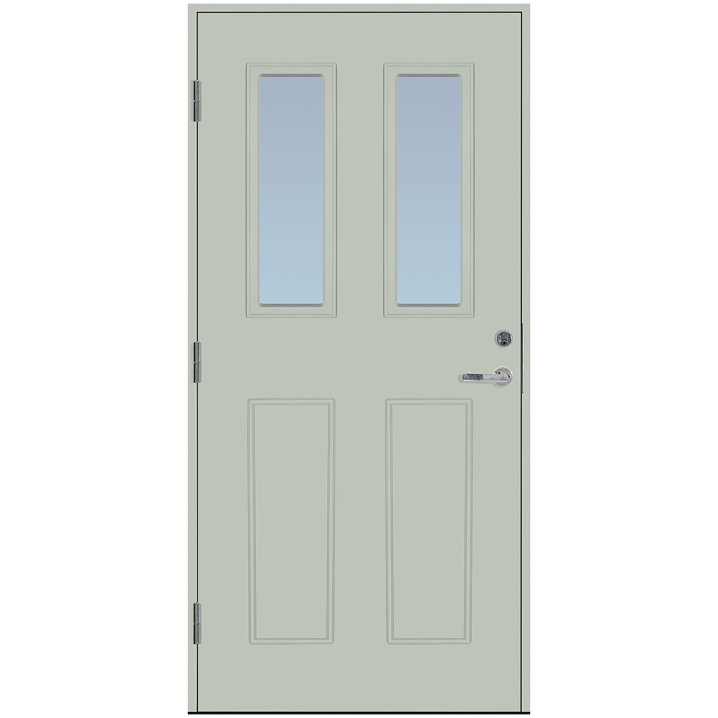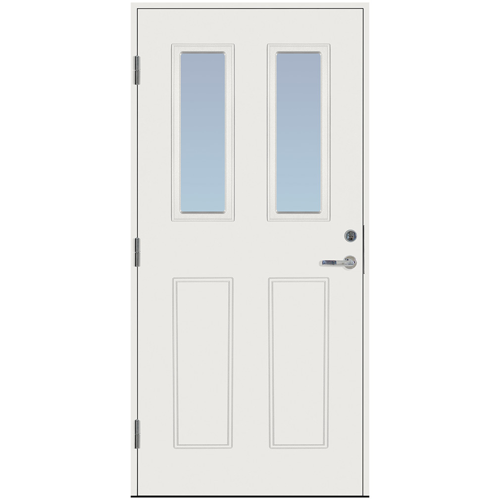 Dørbladet har en glatt innside, er 64 mm tykt og har 55 mm isolering. To aluminiumsplater beskytter den indre konstruksjonen. Tetningslisten rundt karmen er montert på fabrikken. Lavprofil-terskelen er laget av eik med integrert aluminiumsskinne. Glasset er klart termoglass (4+20AR+4 mm). U-verdi <0,95. Døren leveres som standard i hvit NCS S 0502-Y.