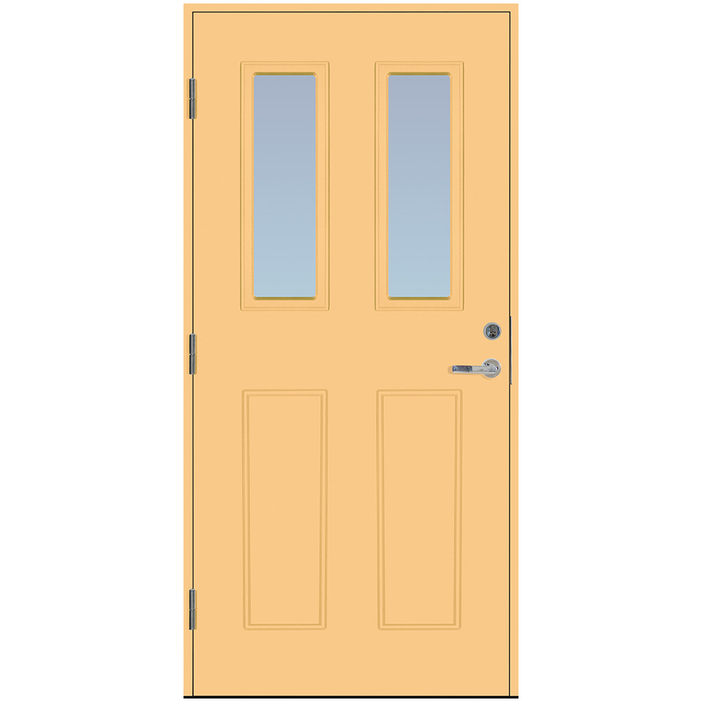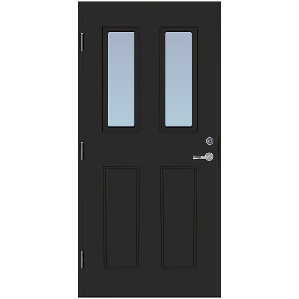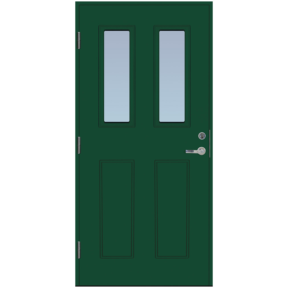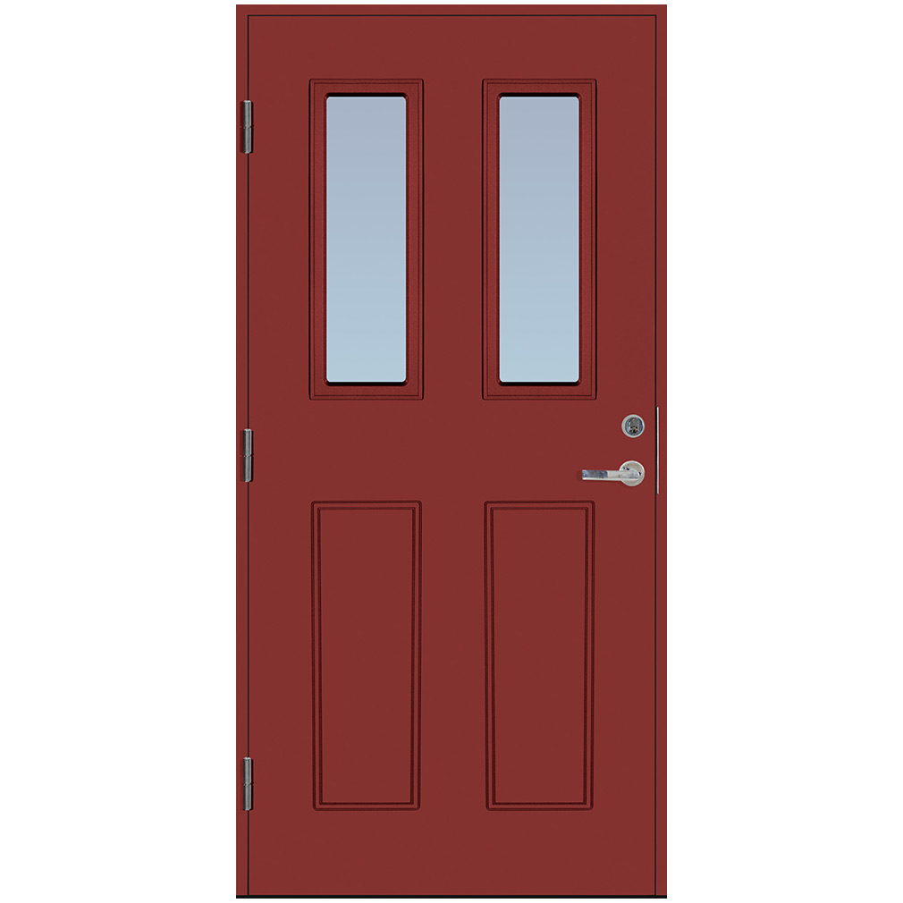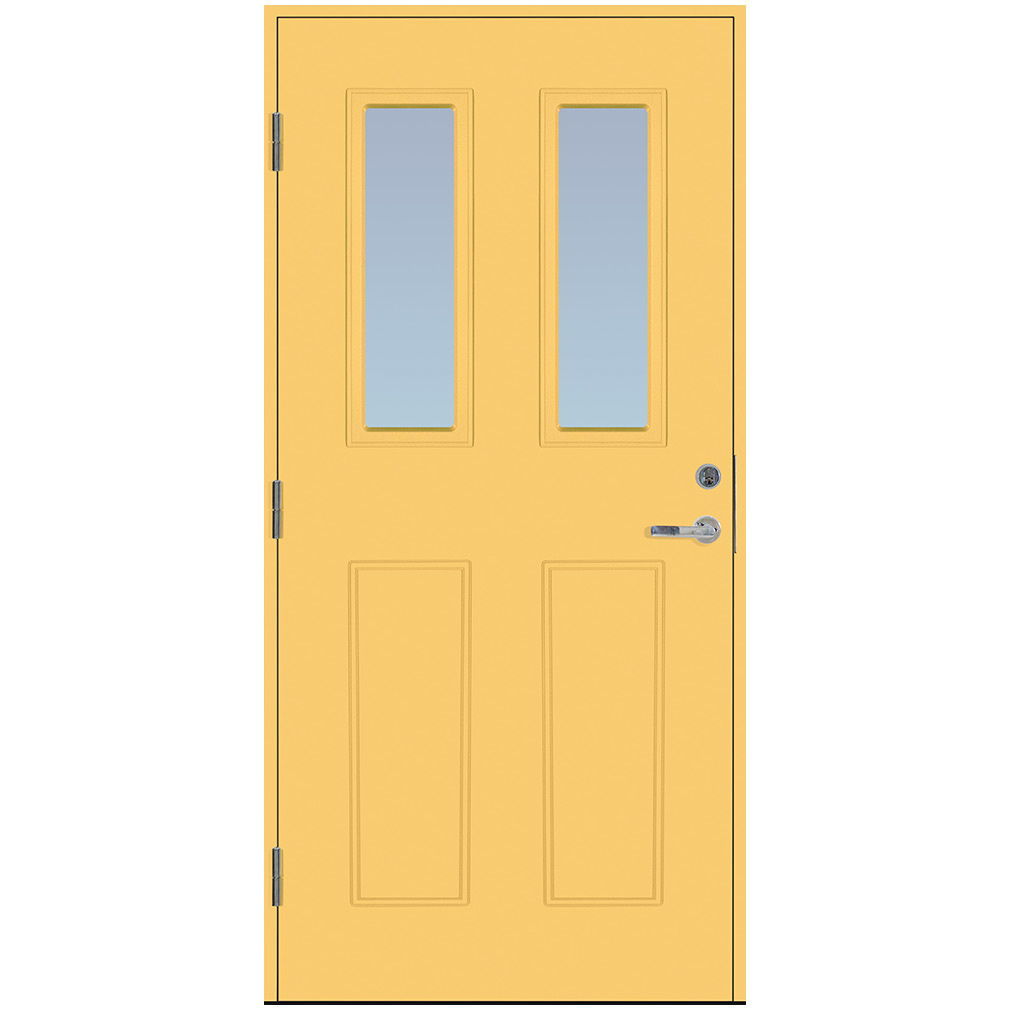 Dørbladet har en glatt innside, er 64 mm tykt og har 55 mm isolering. To aluminiumsplater beskytter den indre konstruksjonen. Tetningslisten rundt karmen er montert på fabrikken. Lavprofil-terskelen er laget av eik med integrert aluminiumsskinne. Glasset er klart termoglass (4+20AR+4 mm). U-verdi <0,95. Døren leveres som standard i hvit NCS S 0502-Y.