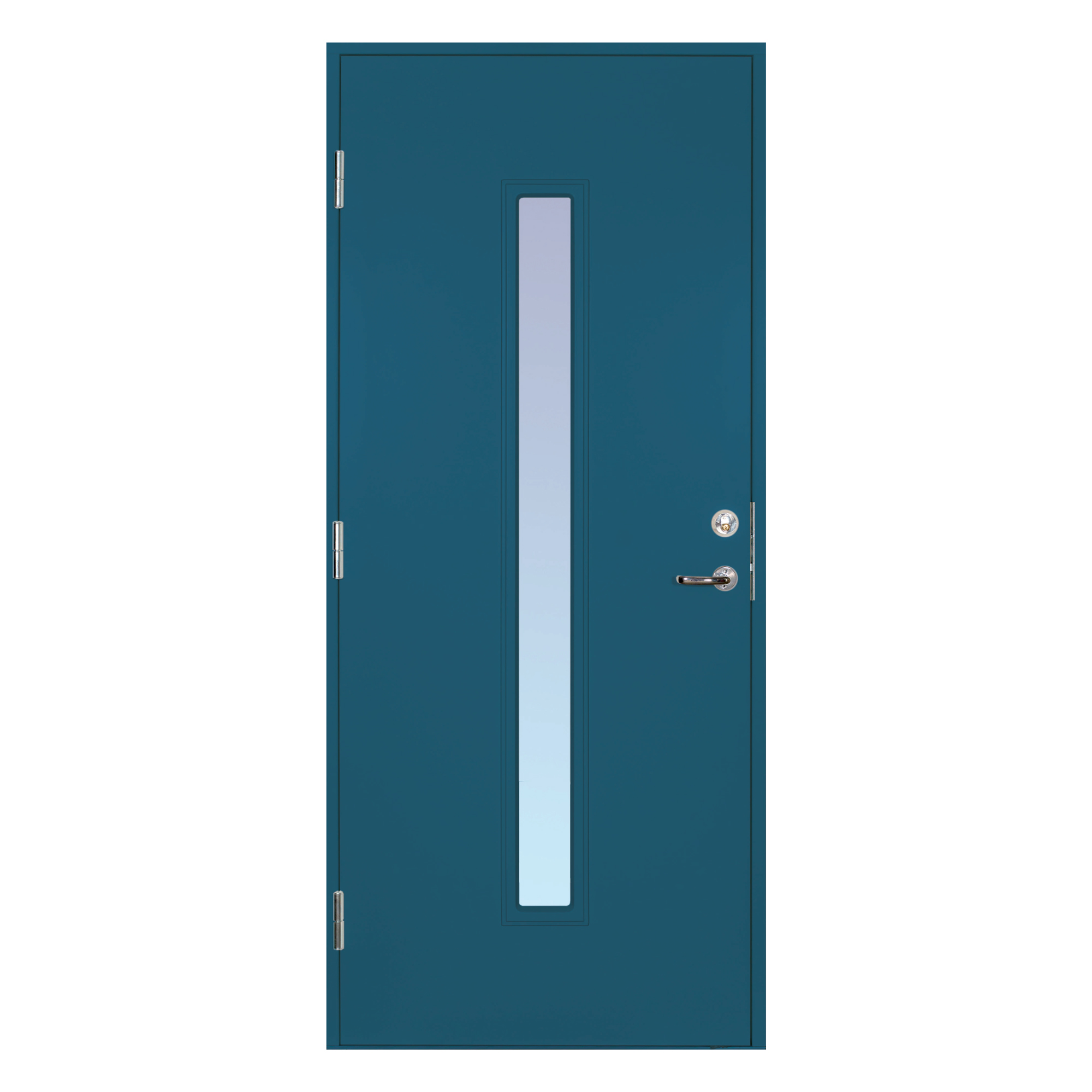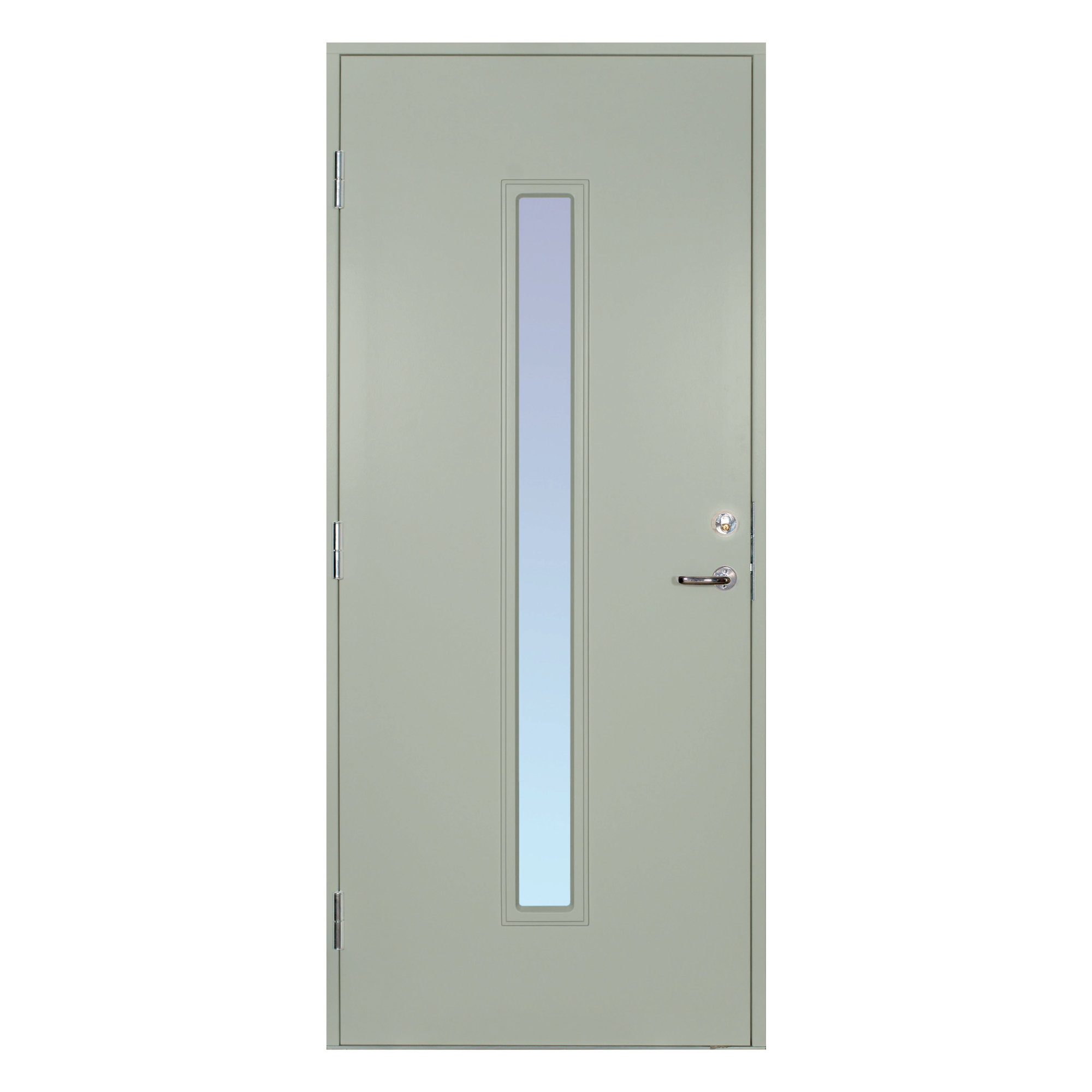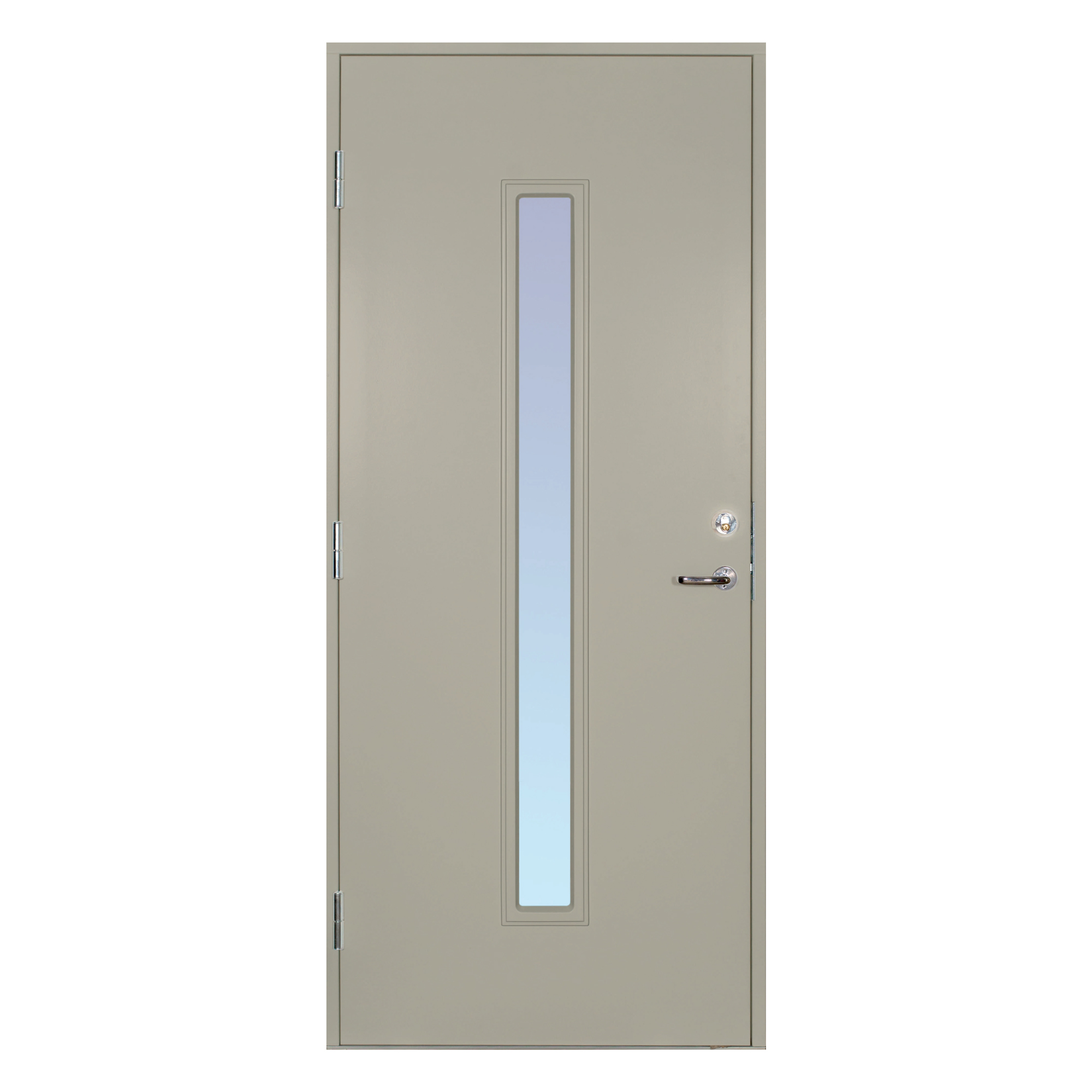 Dørbladet har en glatt innside, er 64 mm tykt og har 55 mm isolasjon. To aluminiumsplater beskytter den indre konstruksjonen. Tetningslisten rundt karmen er fabrikkmontert. Lavprofilterskelen er av eik med integrert aluminiumsskinne. Glasset er klart termoglass (4+20AR+4 mm). U-verdi <0,95. Døren leveres som standard i hvit NCS S 0502-Y.